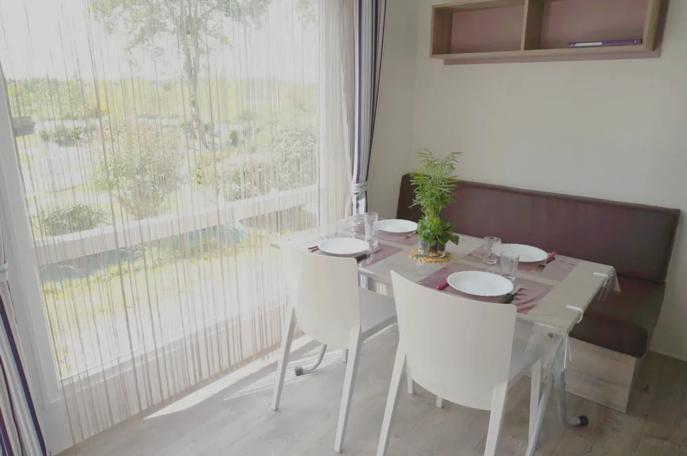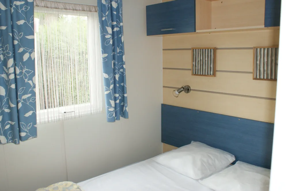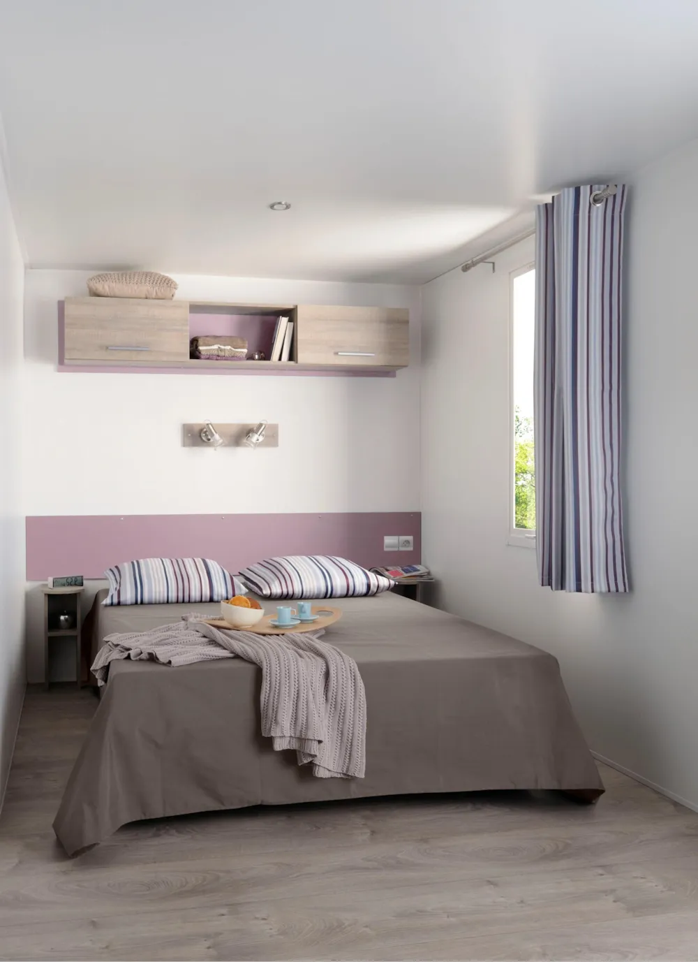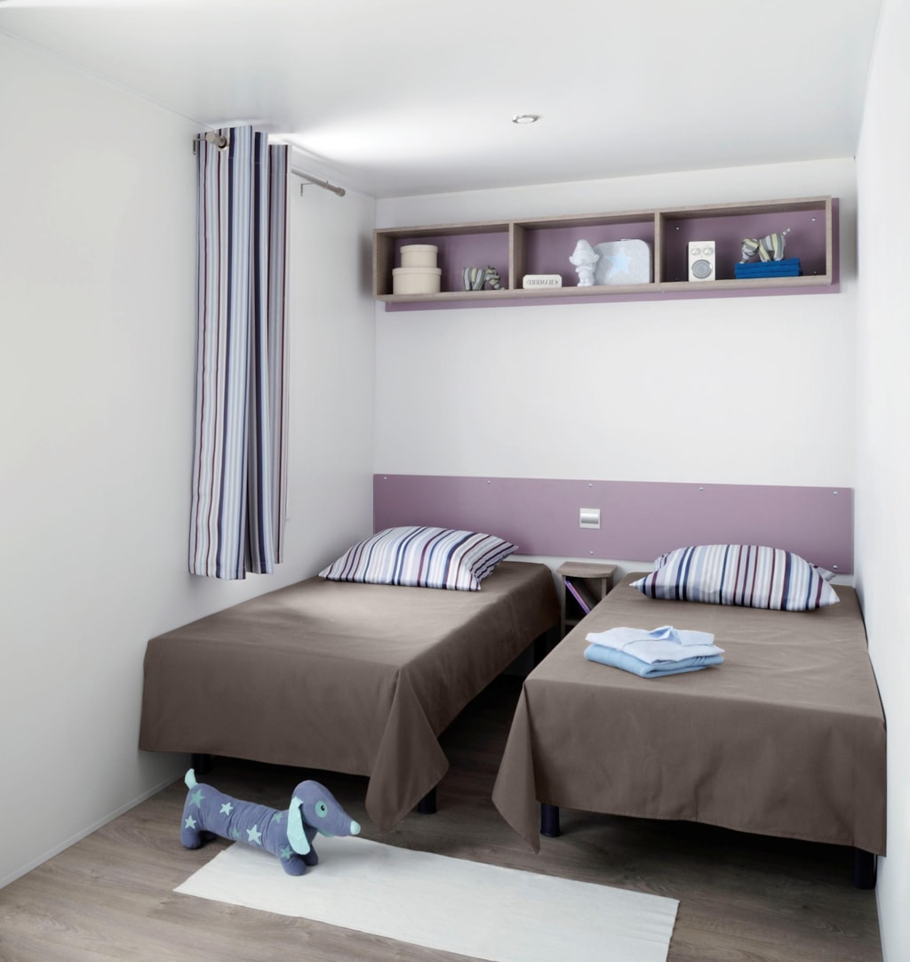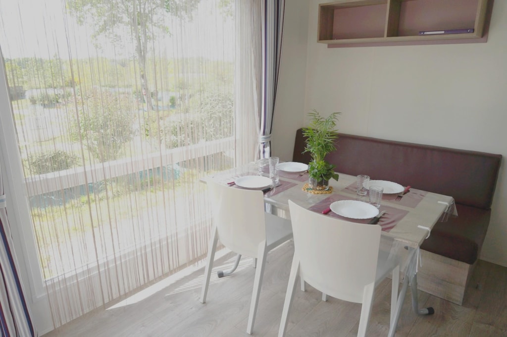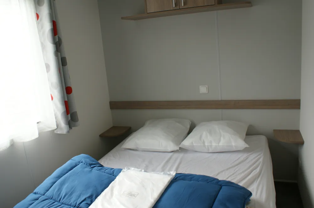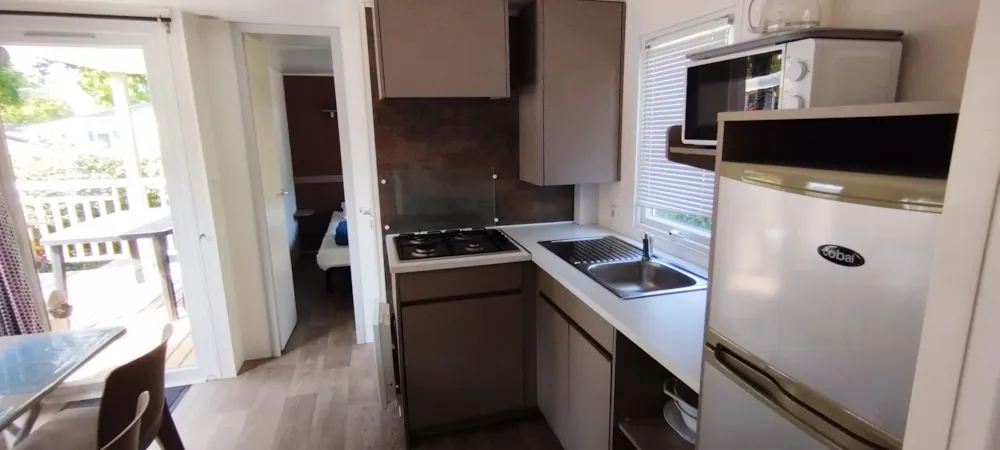 MOBILHEIM OUESSANT von 32 m2 (Modell 2013) mit halbüberdachter Terrasse von 12 m2. Sehr angenehmes Mobilheim in den Farben unserer schönen Südbretagne. Sehr gut ausgestattet und funktional, ideal für einen Urlaub mit Familie oder Freunden.