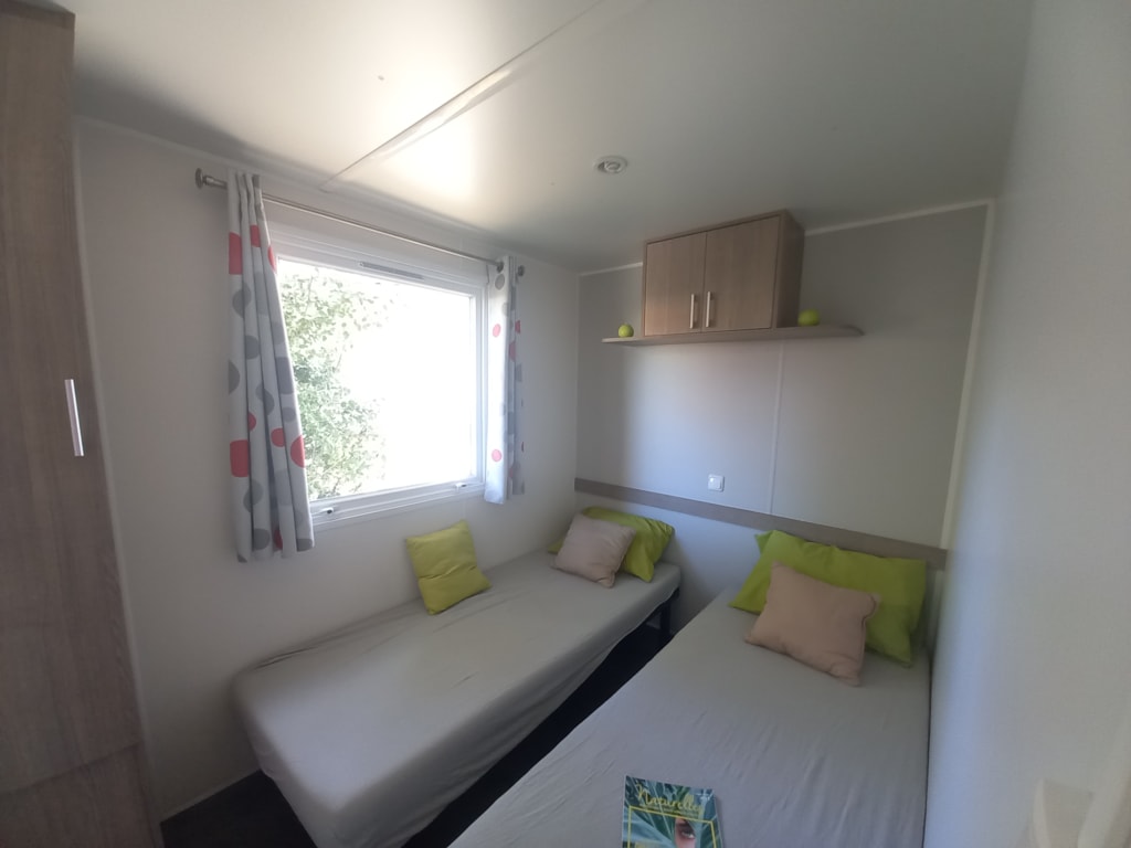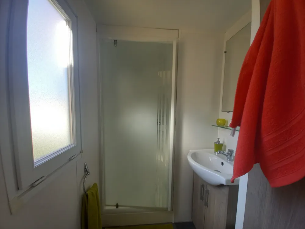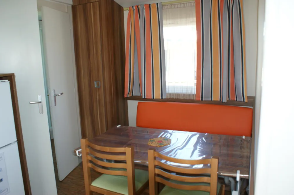 Beschreibung: 6 /8 Personen - 3 Betten. Kochnische mit 4 Gaskochfeldern, Kühlschrank mit Gefrierfach, Mikrowelle, Kaffeemaschine und Küchenutensilien. Badezimmer mit Dusche, Waschbecken und separatem WC. Schlafmöglichkeiten: 1 Schlafzimmer mit einem Bett 140x190, 2 Schlafzimmer mit 2 Einzelbetten 70x190, 1 Sofabett im Wohnzimmer 140x190. Bettdecken und Kissen vorhanden. Matratzen und Kissen mit Einwegschutz. Reinigung: wird mit Boden- und Mehrzweckprodukt geliefert. Aussenausstattung: Holzterrasse mit Gartenmöbeln. Parkplatz: Auto auf Stellplatz OPTIONAL: Fernseher, WIFI, Bettwäsche.