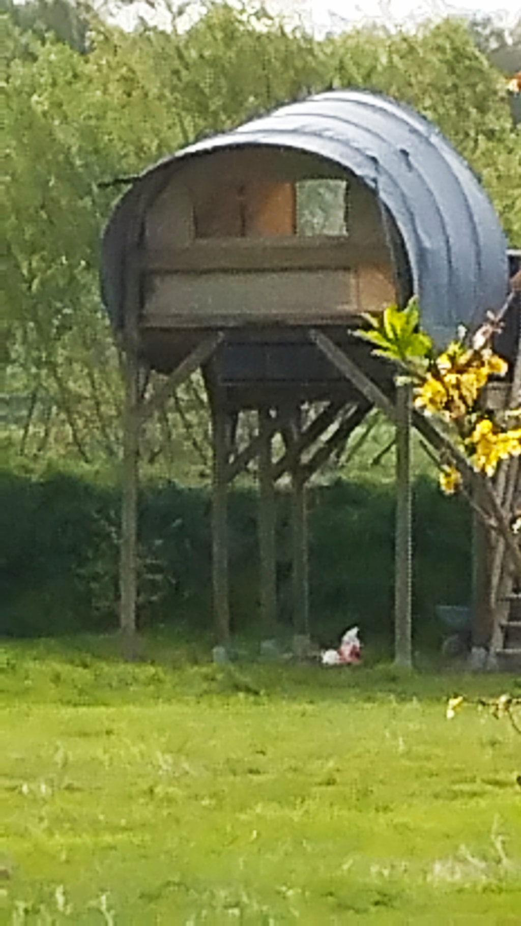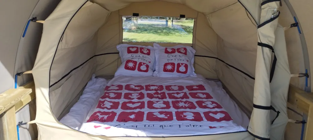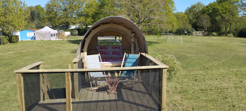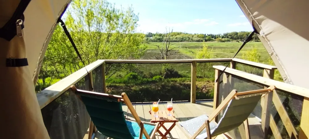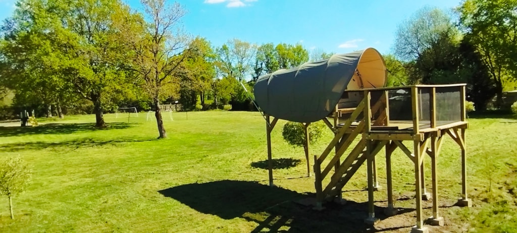 Entdecken Sie dieses Zelt auf 3 m Höhe am Fuße des GR 34. Es bietet Ihnen einen atemberaubenden Blick auf die umliegende Fauna und Flora.