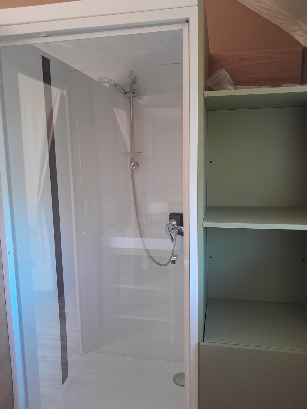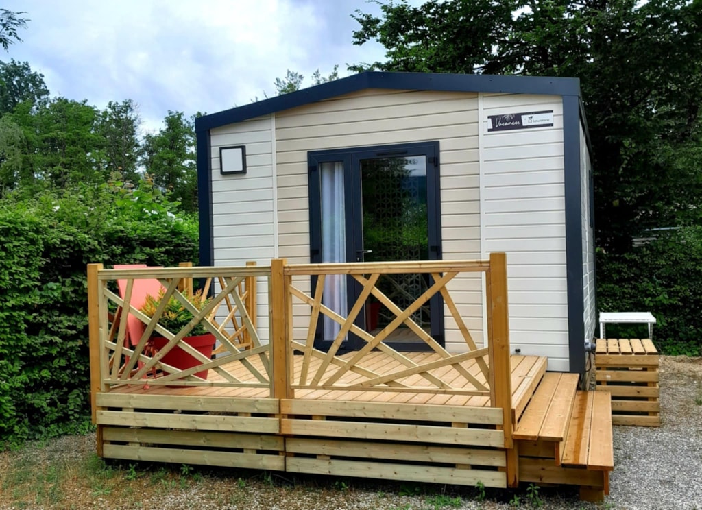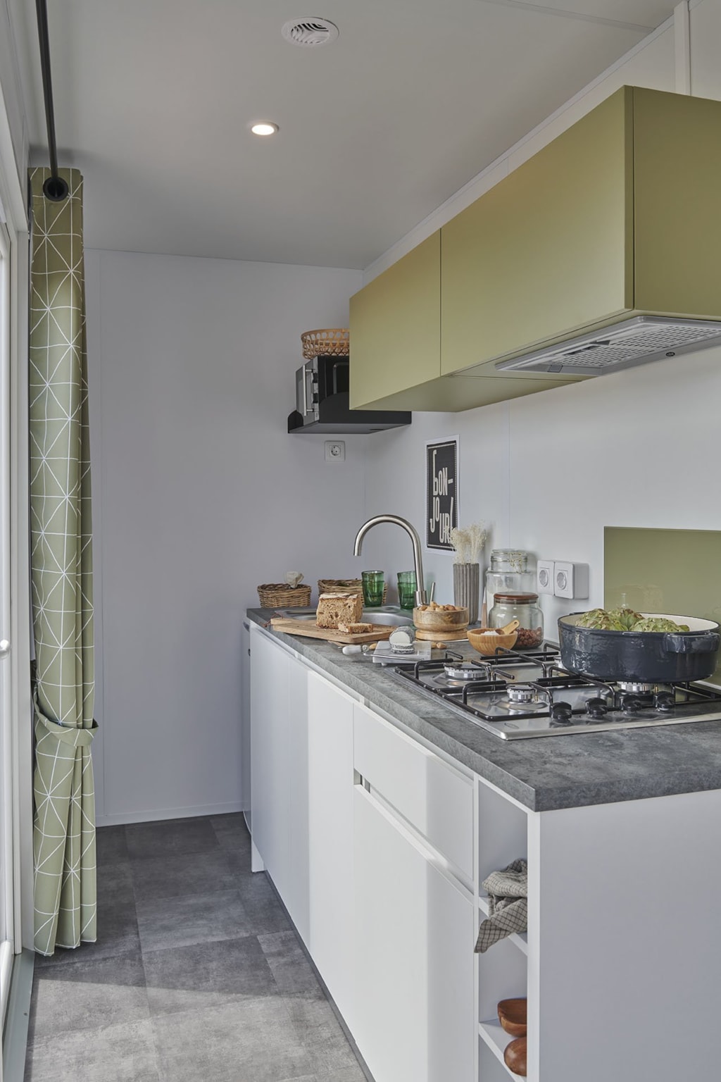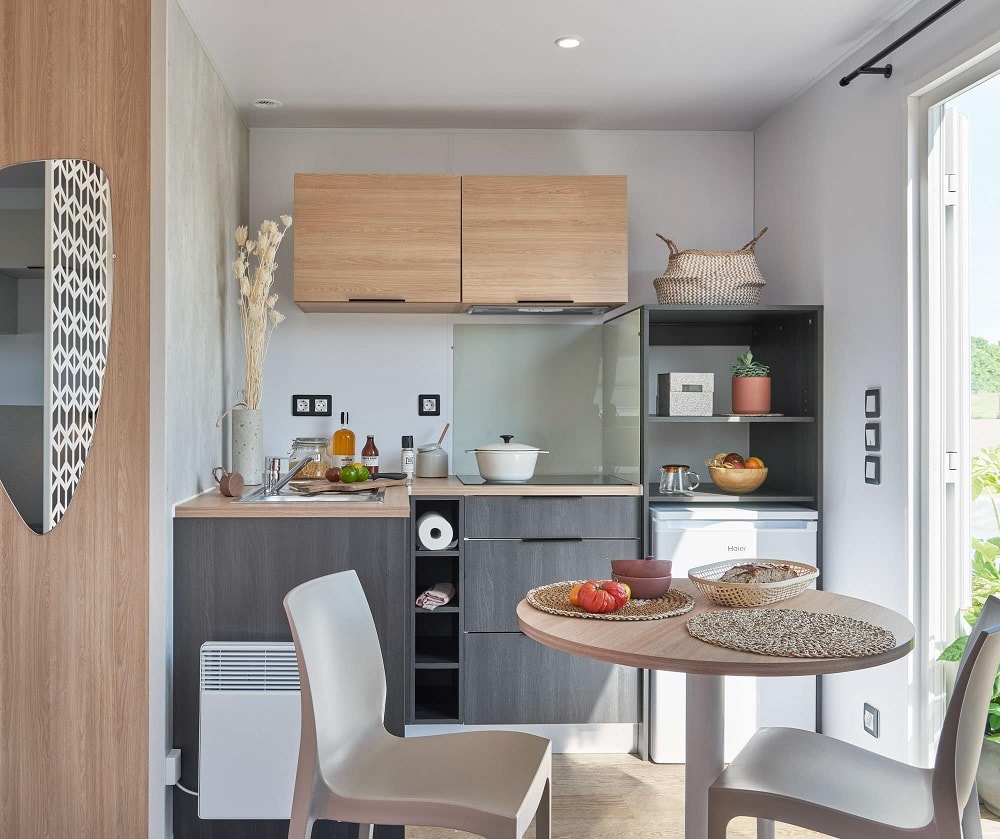 Ein moderner Look und eine Öffnung im Giebel. Das Mobil-home Premium Studio besteht aus einem geräumigen Schlafzimmer, einem Wohnzimmer, einer Küche und einem geräumigen Badezimmer, mit dem Bonus eines durchgehenden Lichts.