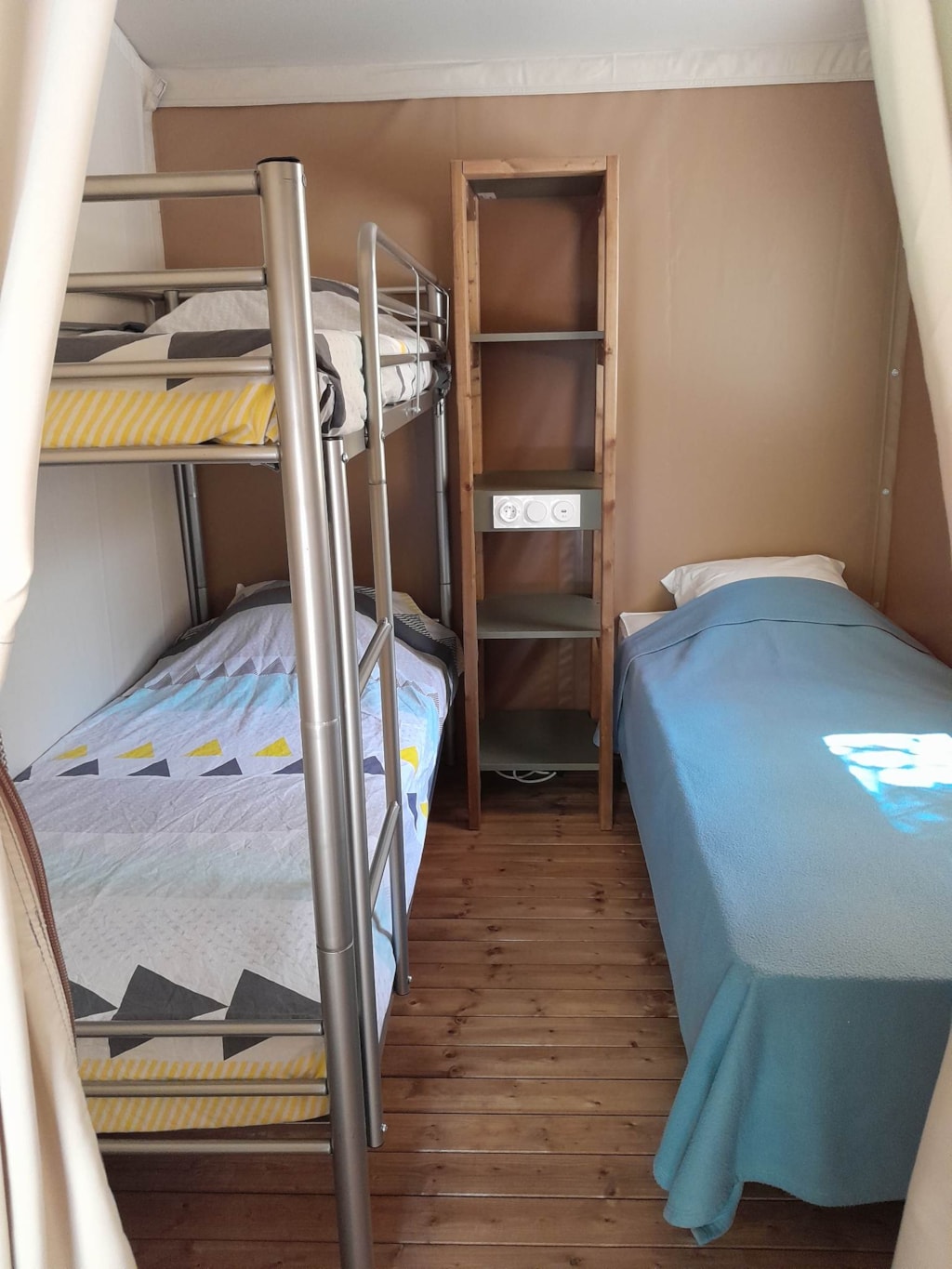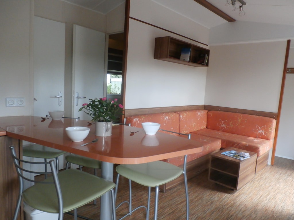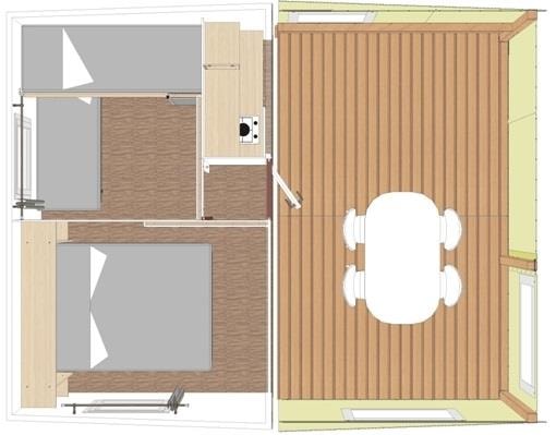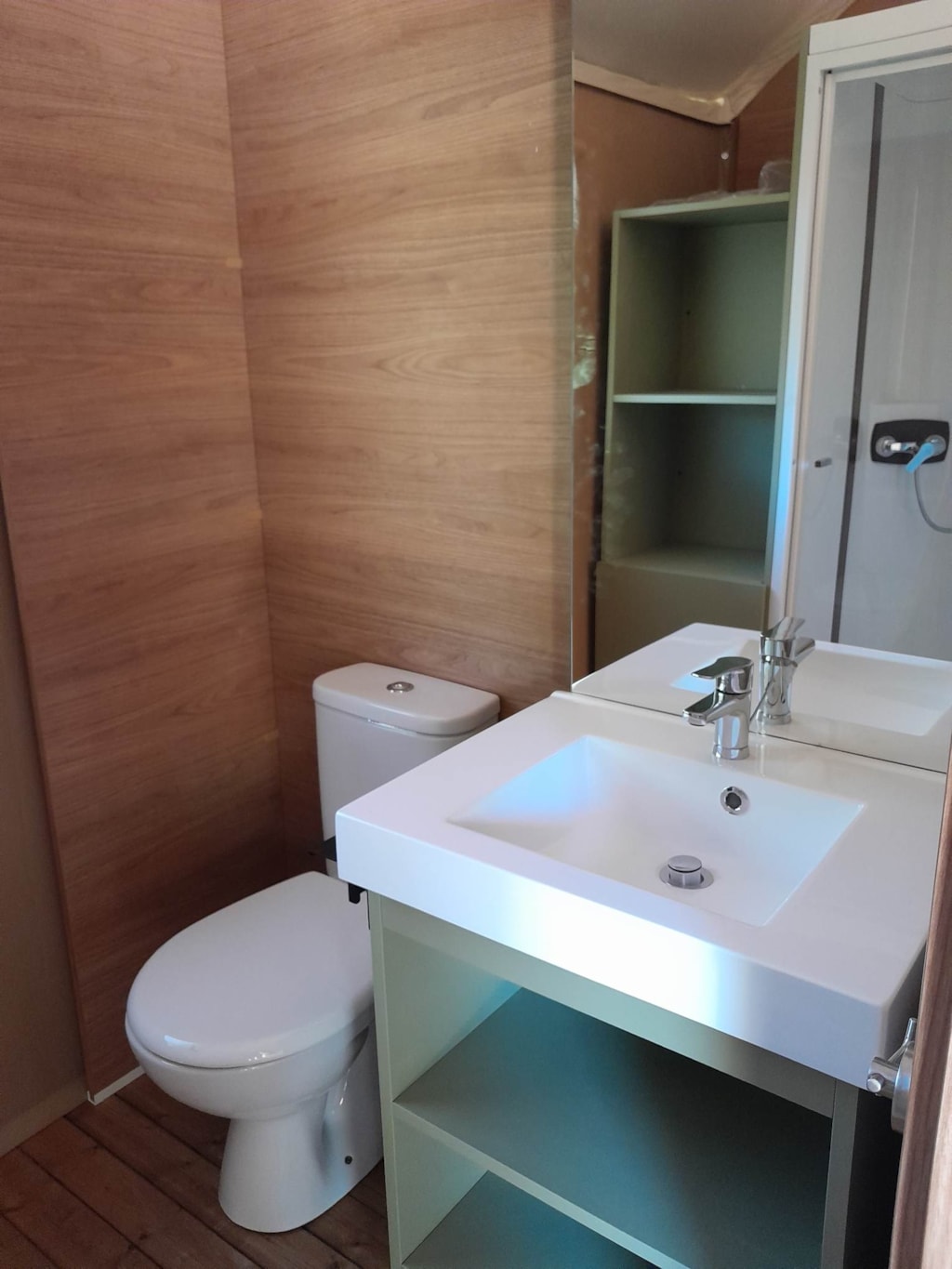Ein moderner Look und eine Öffnung im Giebel. Das Mobil-home Premium Studio besteht aus einem geräumigen Schlafzimmer, einem Wohnzimmer, einer Küche und einem geräumigen Badezimmer, mit dem Bonus eines durchgehenden Lichts.