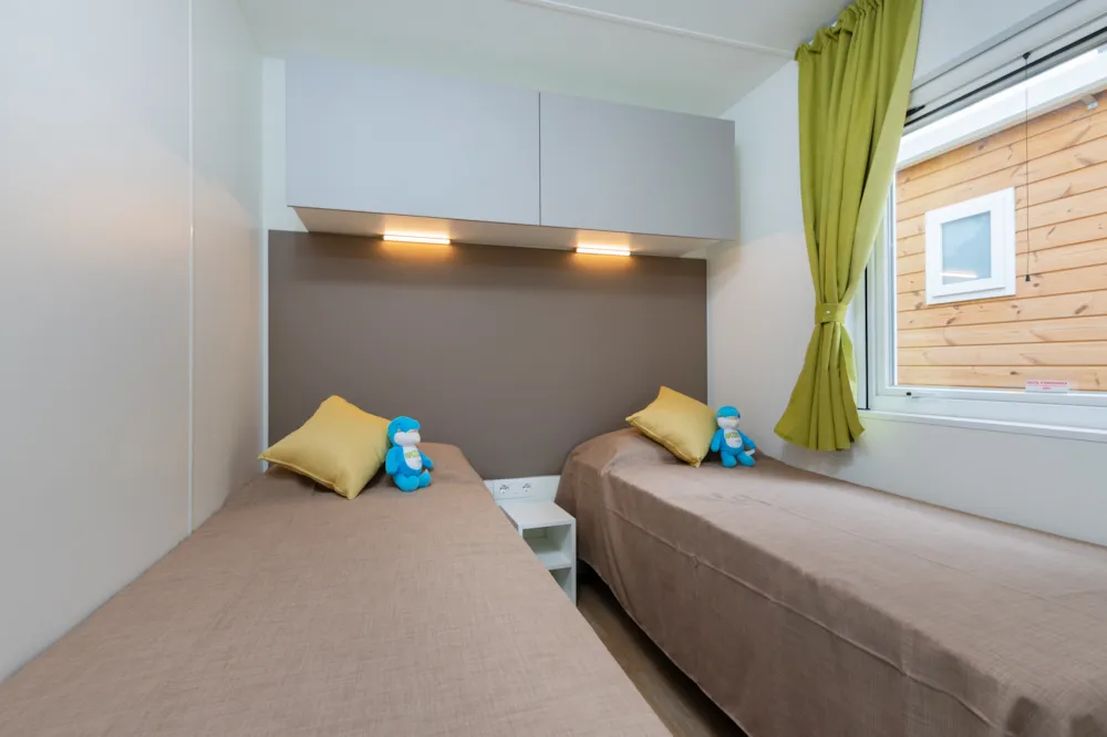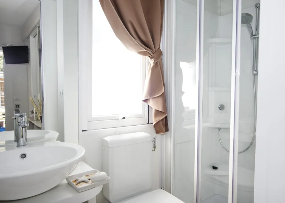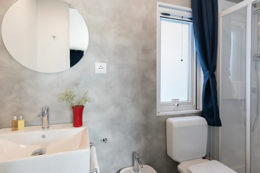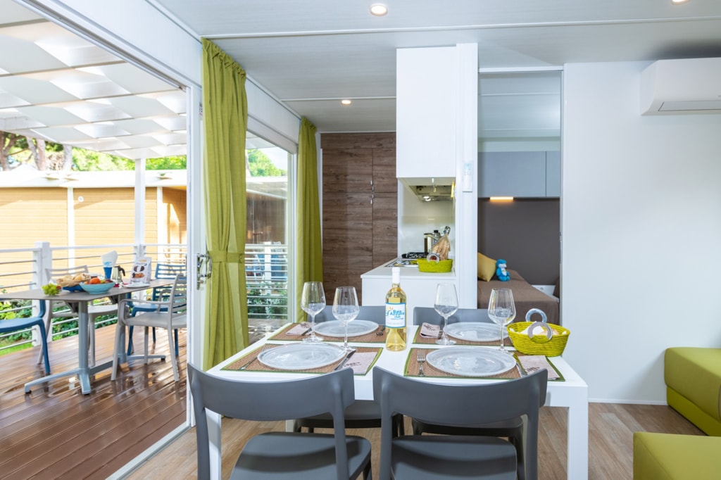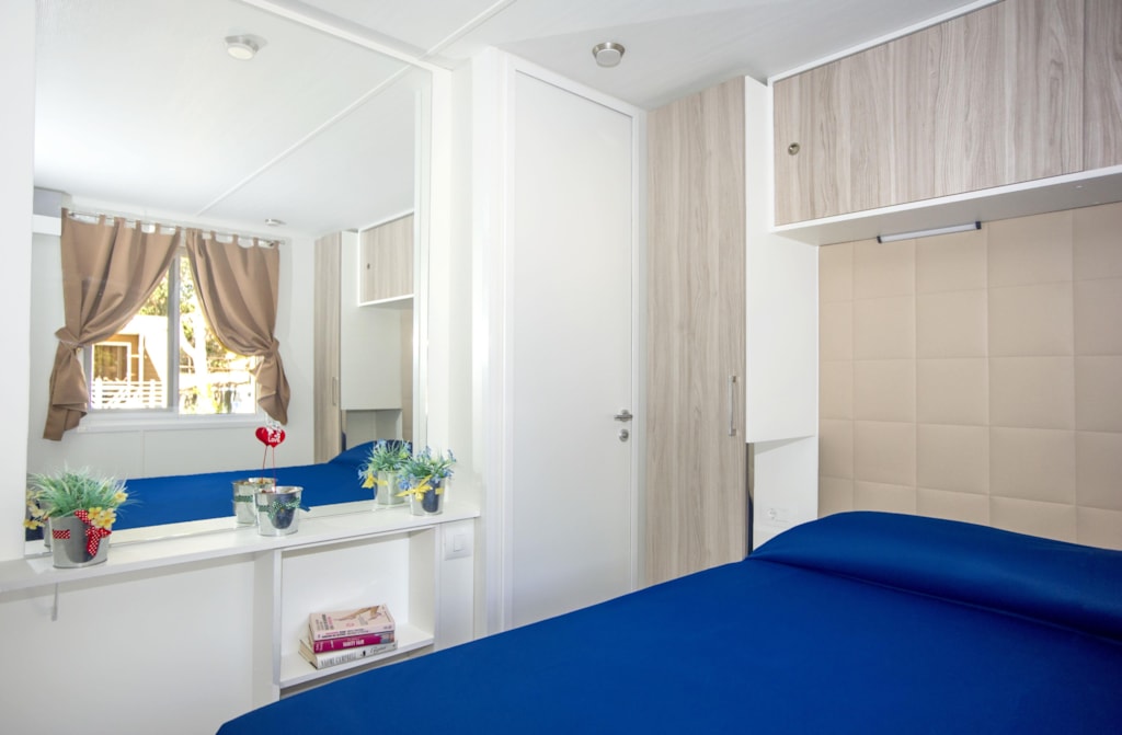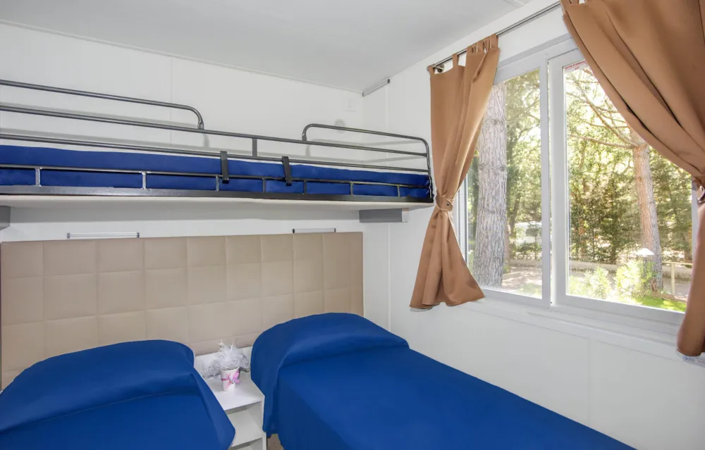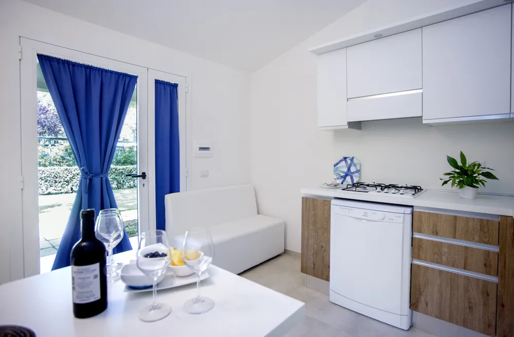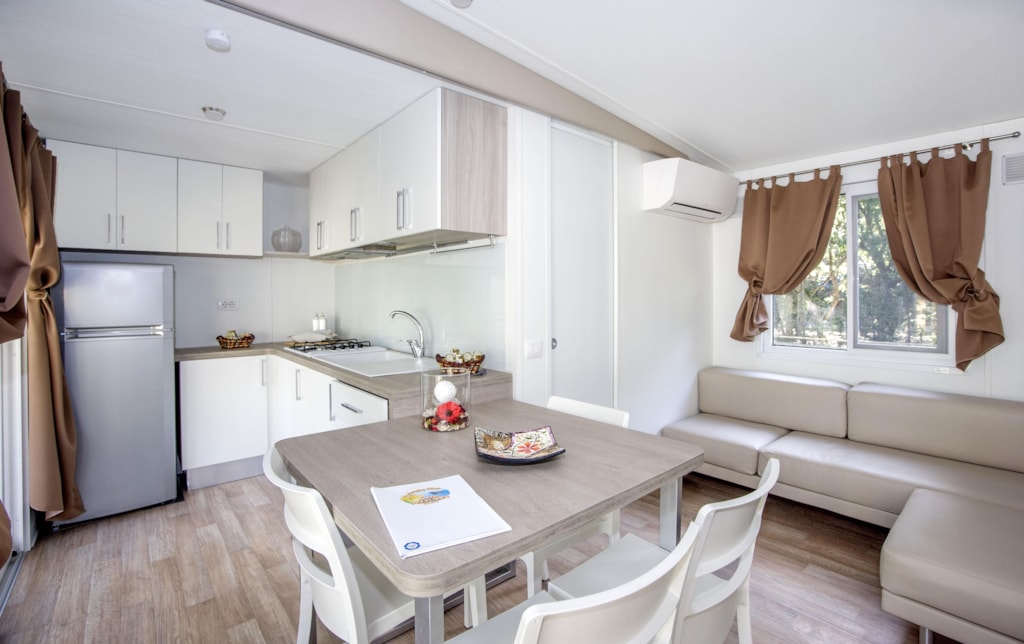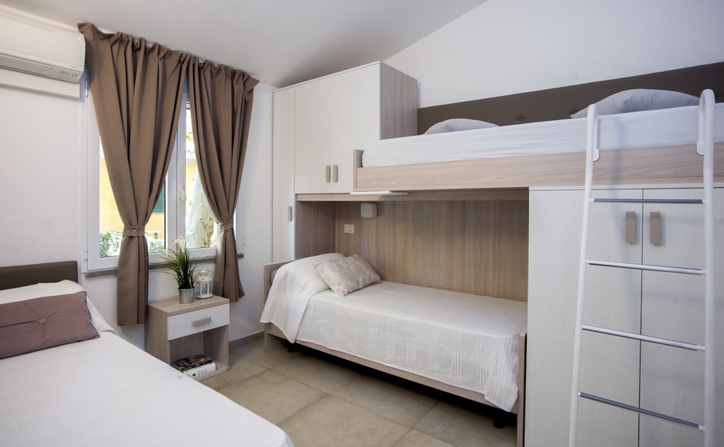 Bungalow mit drei Zimmern, 30 m², im Erdgeschoss, mit eigenem Eingang und privatem Garten mit Liegestühlen. Große Veranda, ausgestattet mit Tisch und Stühlen. Stilvolle und komfortable Einrichtung. Wohn-/Esszimmer mit Kochnische und TV. Zwei Schlafzimmer: eines mit Doppelbett und eines mit drei Einzelbetten. Zwei Bäder ohne Bidet, eines mit Dusche. Klimaanlage (warm/kalt), Safe, Haartrockner, Kühlschrank mit Gefrierfach. Haustiere nicht erlaubt.