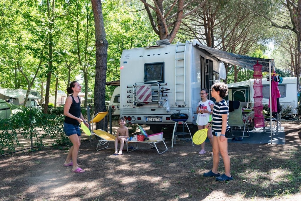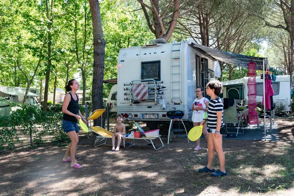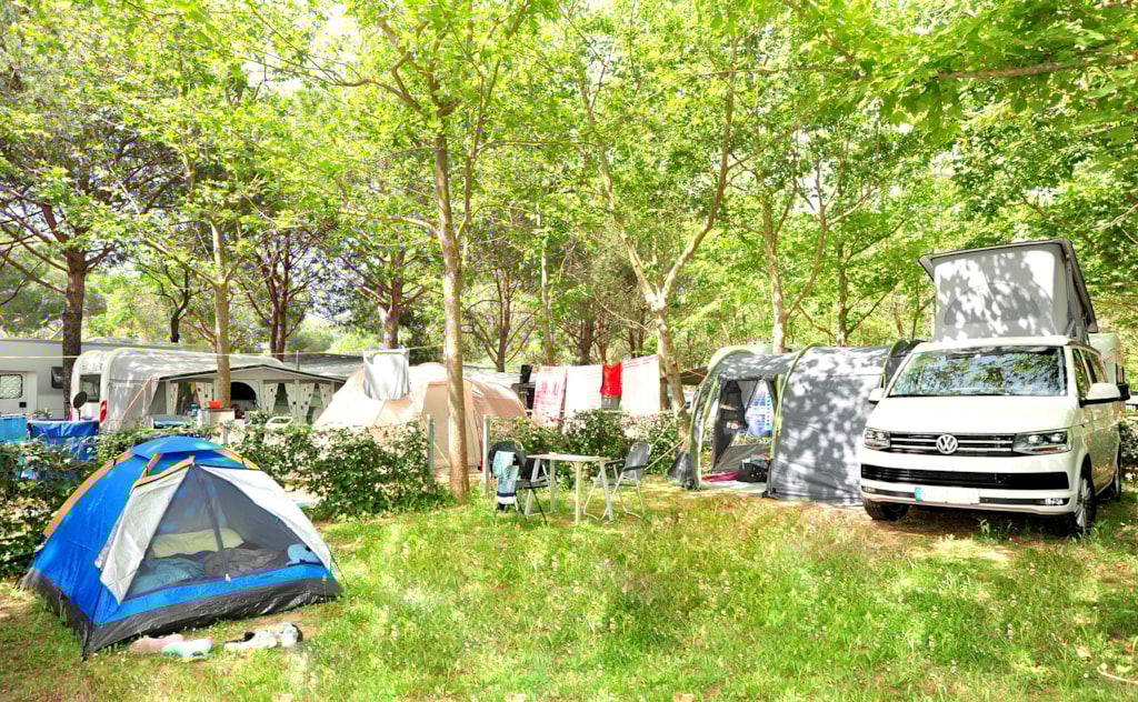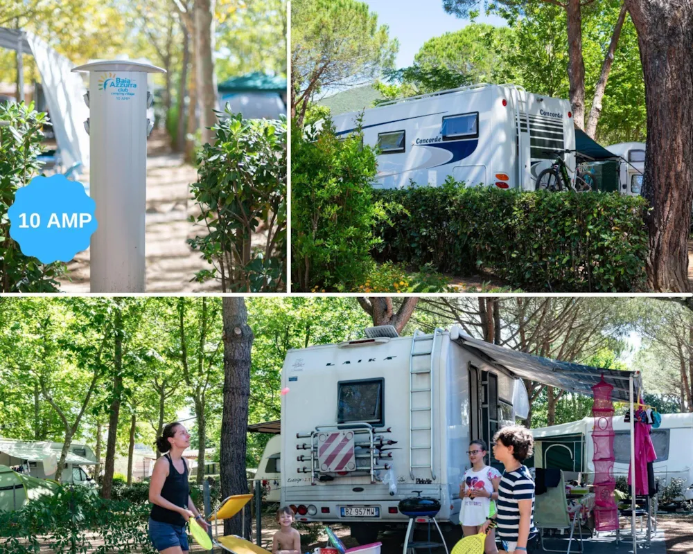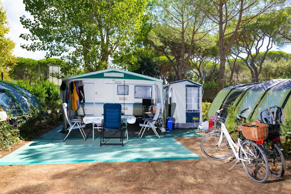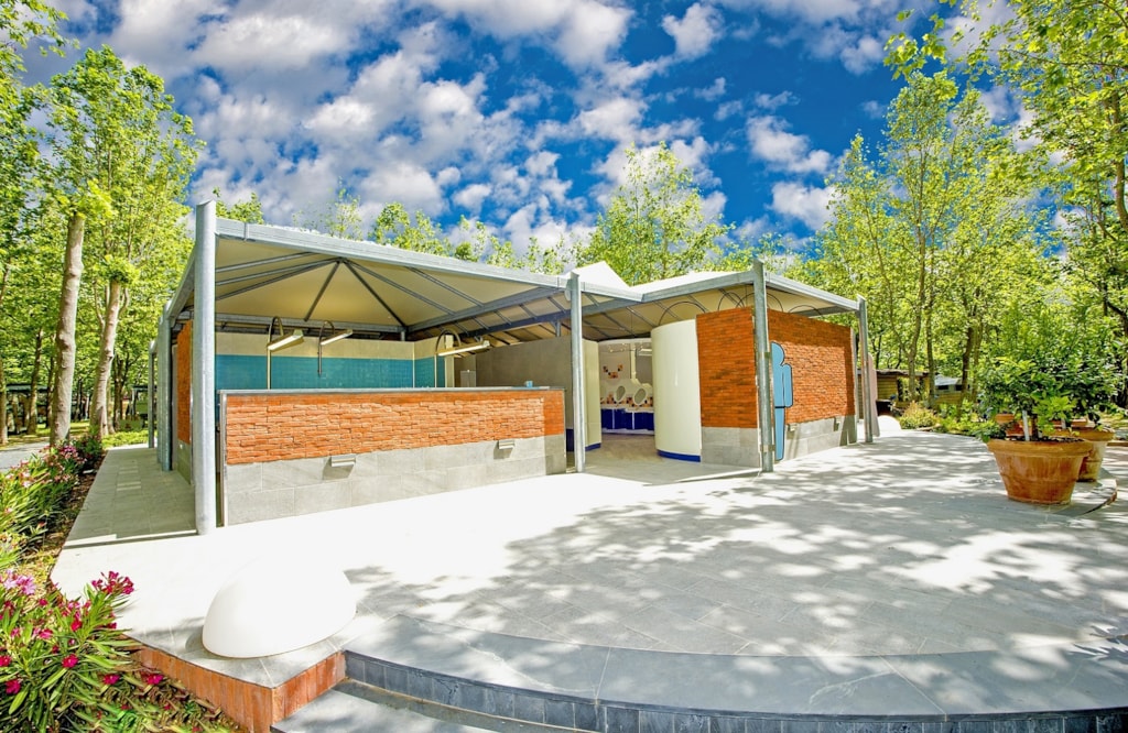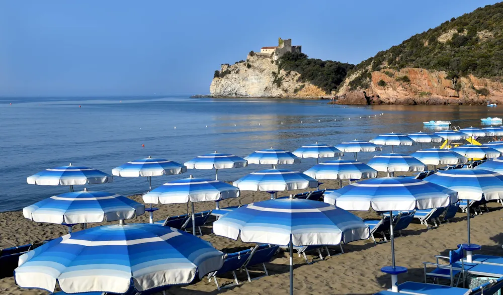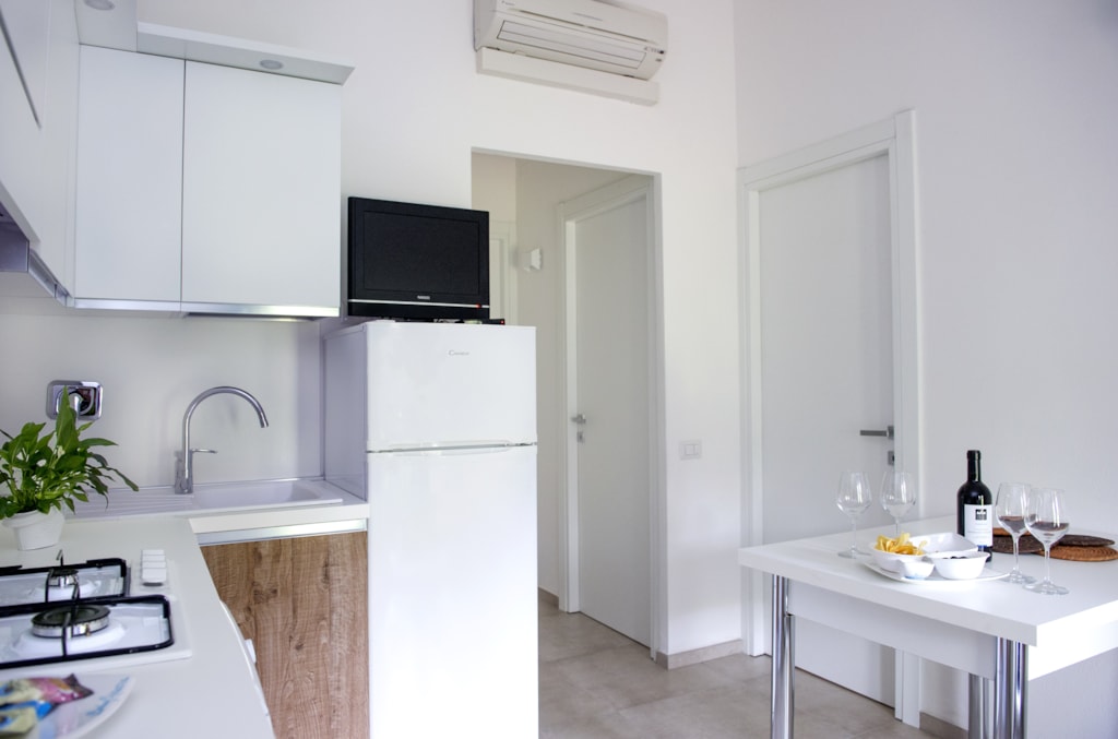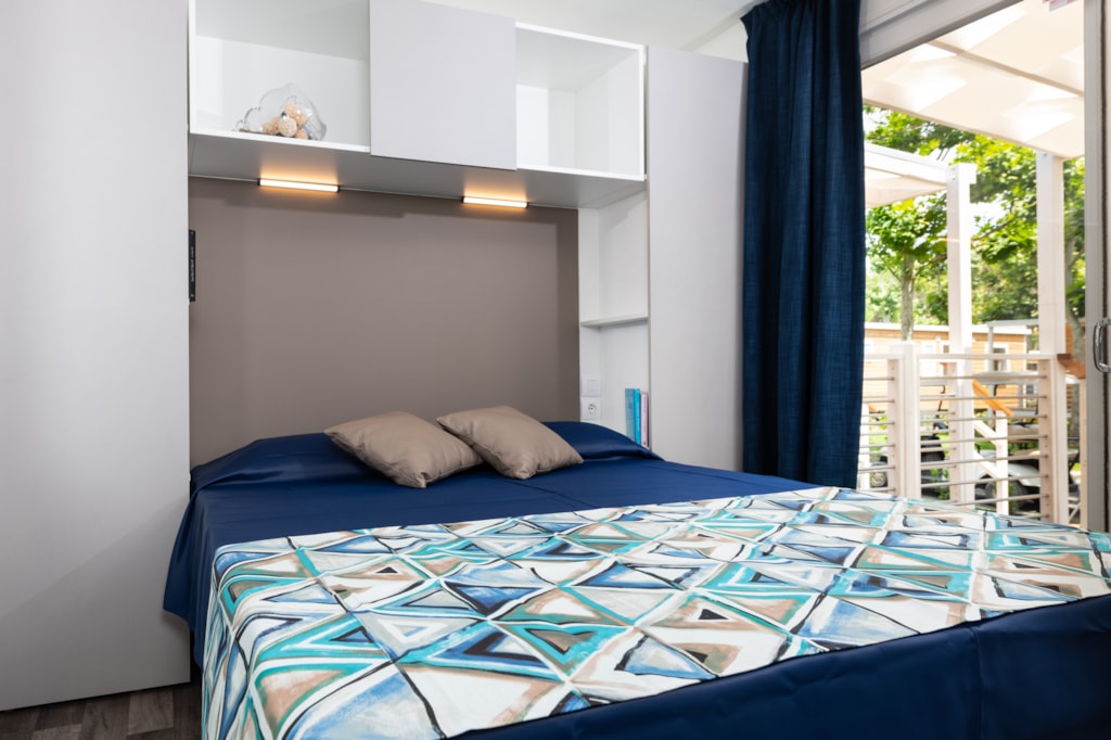Bungalow mit drei Zimmern, 30 m², im Erdgeschoss, mit eigenem Eingang und privatem Garten mit Liegestühlen. Große Veranda, ausgestattet mit Tisch und Stühlen. Stilvolle und komfortable Einrichtung. Wohn-/Esszimmer mit Kochnische und TV. Zwei Schlafzimmer: eines mit Doppelbett und eines mit drei Einzelbetten. Zwei Bäder ohne Bidet, eines mit Dusche. Klimaanlage (warm/kalt), Safe, Haartrockner, Kühlschrank mit Gefrierfach. Haustiere nicht erlaubt.