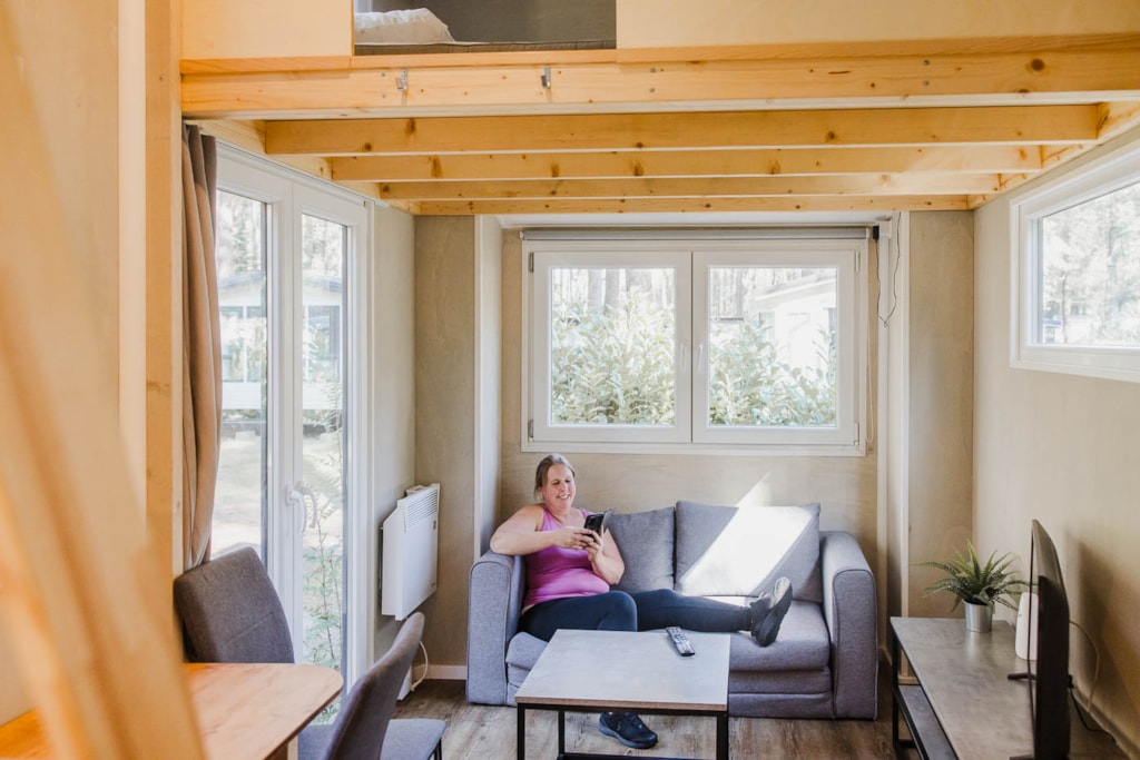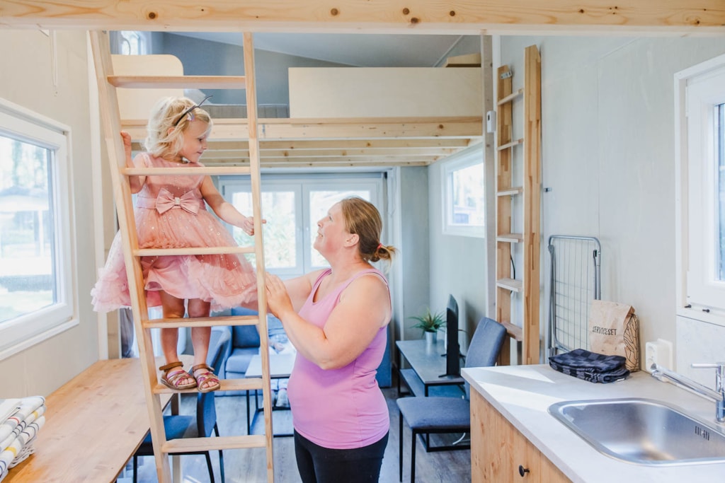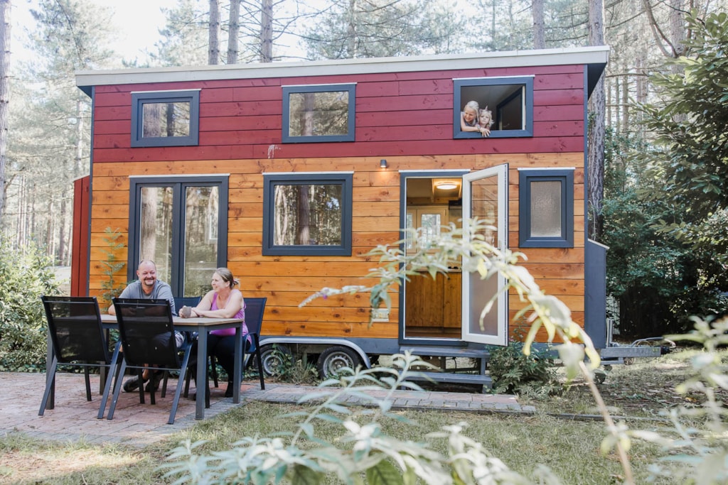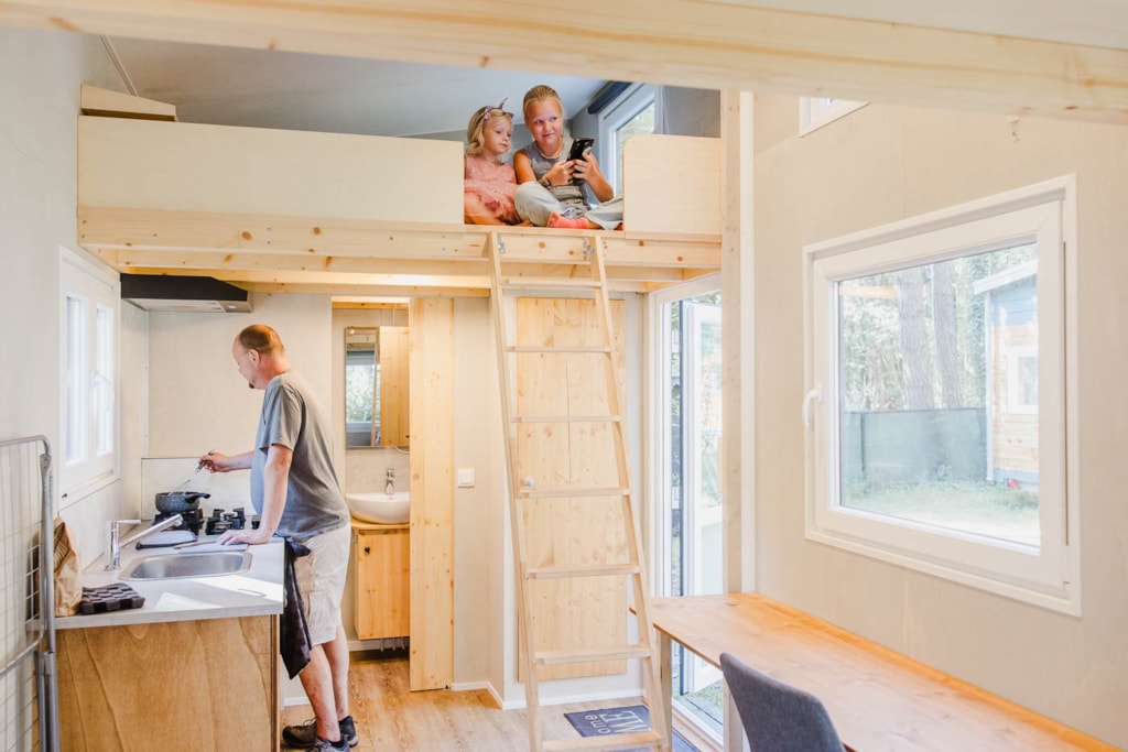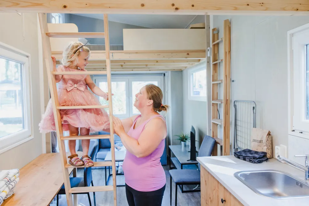 Luxe Tiny House voorzien van alle gemakken. Een eigen sanitairruimte met WC en Douche, een keuken een woonkamer en 2 slaapkamers op de verdiepingen