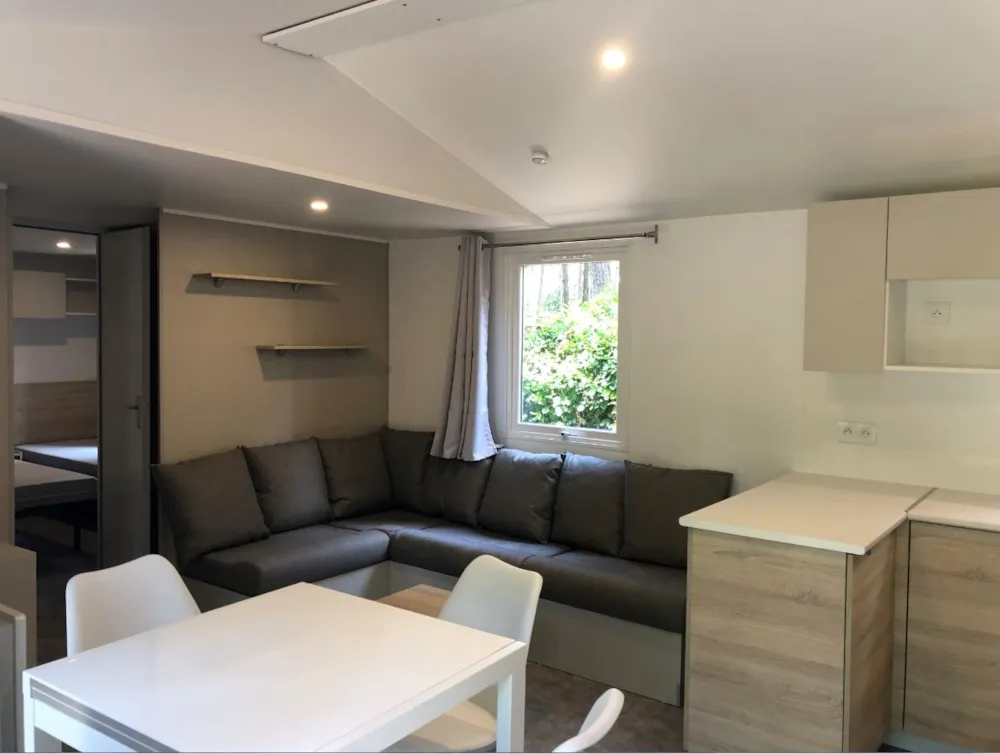 Freistehendes Chalet mit Terrasse, Wohnzimmer mit offener Küche