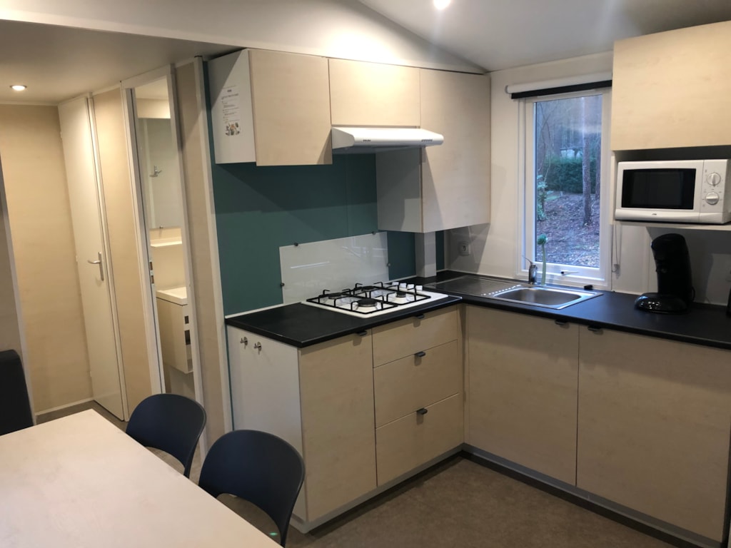 Küche mit Kühlschrank inkl. Gefrierfach, 4-Flammen-Gasherd, Mikrowelle, Wasserkocher und Filterkaffeemaschine