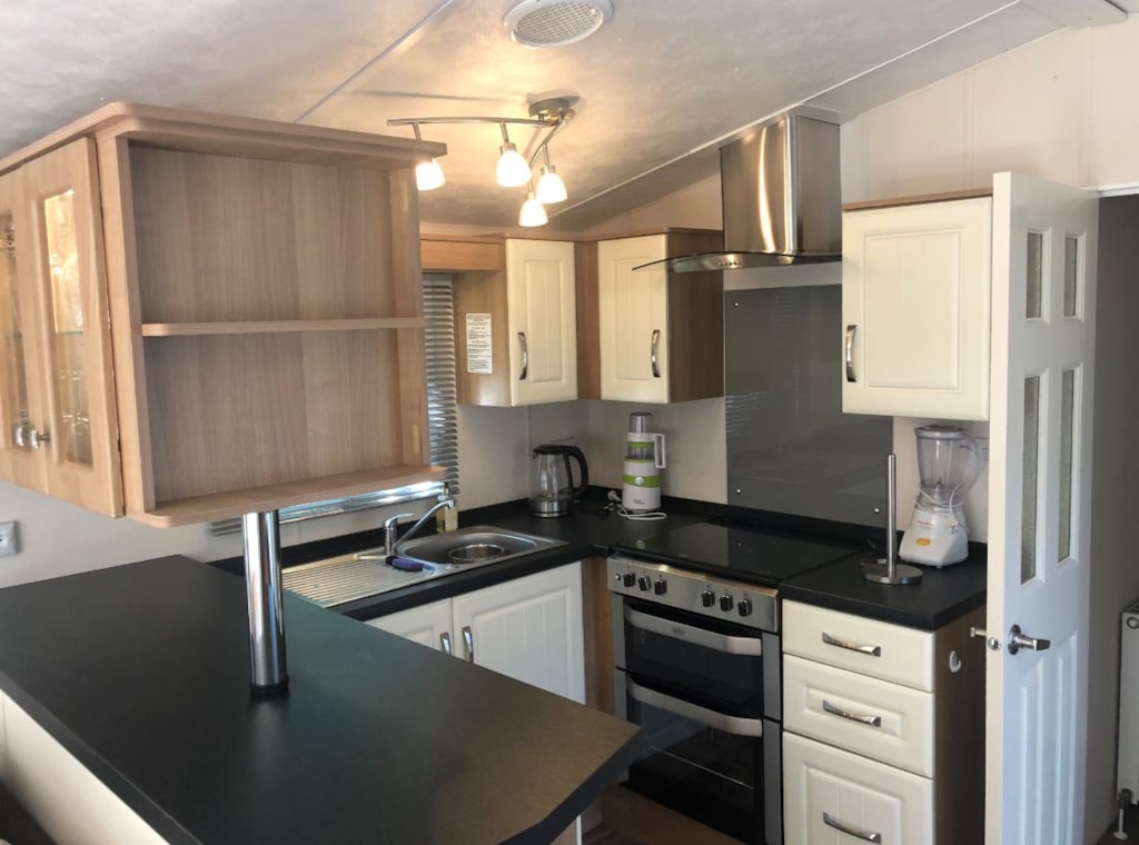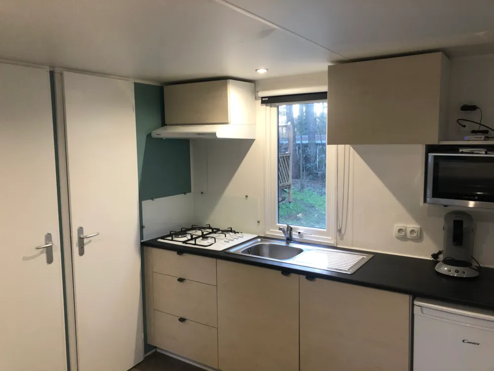 Küche mit Kühlschrank inkl. Gefrierfach, 4-Flammen-Gasherd, Mikrowelle, Wasserkocher und Senseo-Kaffeemaschine