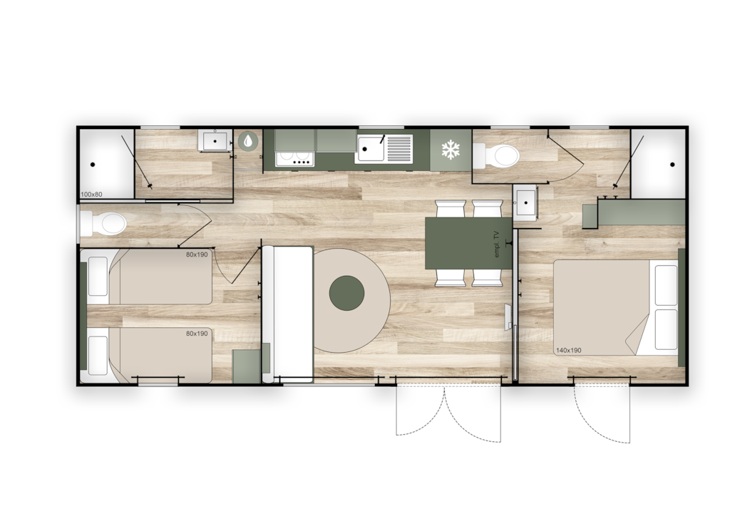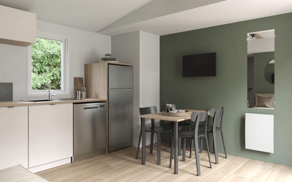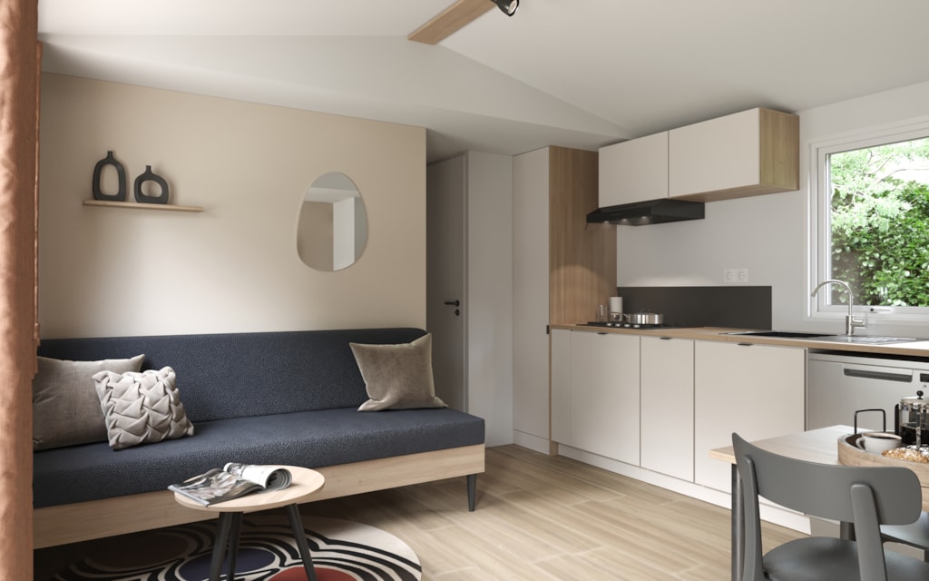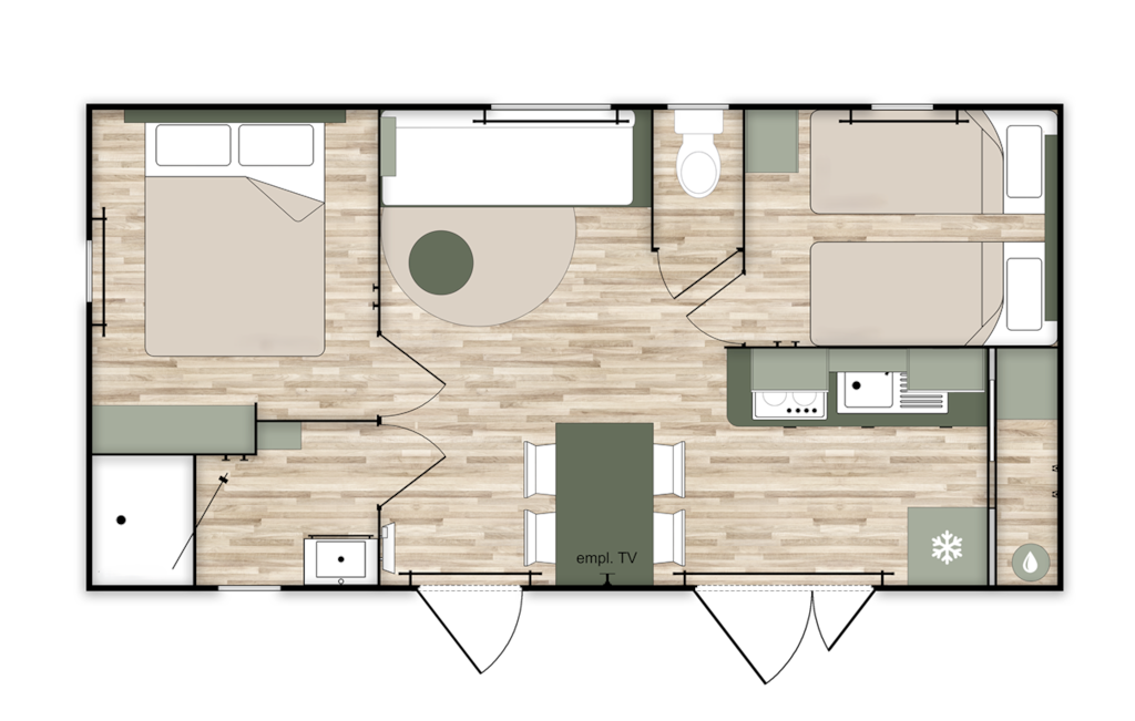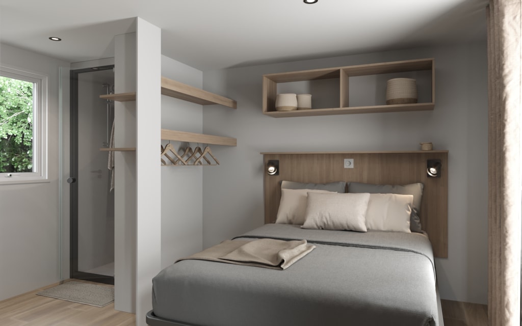 COTTAGE Premium année 2025. Il dispose d'une grande terrasse et d'un emplacement XXL dans un secteur pieton. La cuisine est totalement équipée et dispose d'un lave vaisselle. Vous trouverez également un sèche-cheveux et un sèche serviette dans la salle de bain. Le mobil-home est équipé de la climatisation et de radiateurs dans chaque pièces ainsi que des moustiquaires aux fenêtres des chambres. Le mobil-home dispose de 3 chambres (1 chambre avec 1 lit double en 160cm et 2 chambres avec 2 lits simples en 80cm, dont 1 rabattable pour emplacement d'un lit bébé), les oreillers et les couettes sont fournis. Cependant, les serviettes et le linge de lit sont en supplément. Les WC sont séparés. Les animaux ne sont pas autorisés.