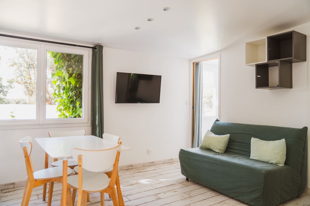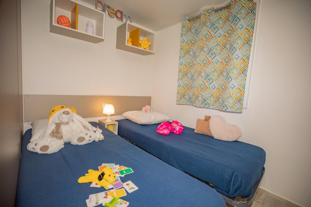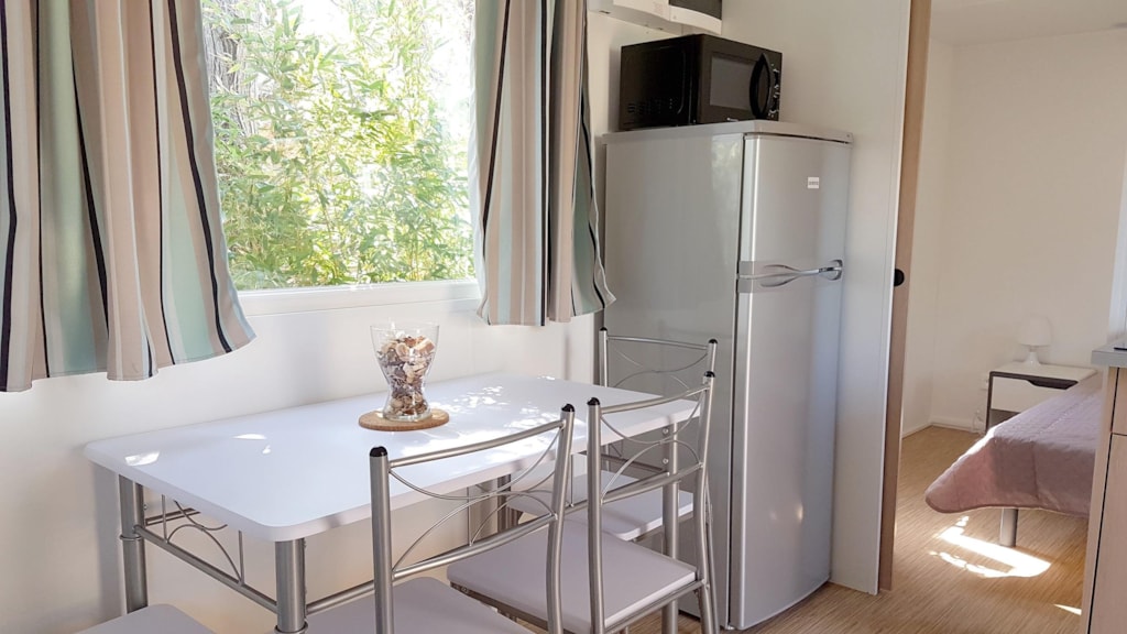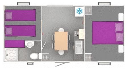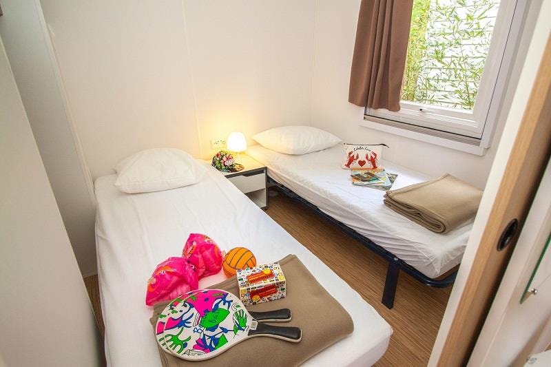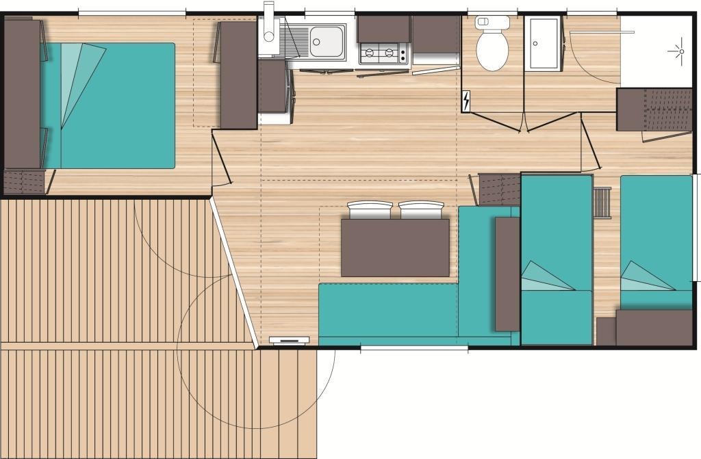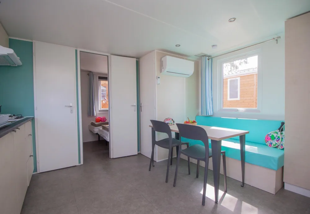 25m2 großes Mobilheim für 4/ 5 Personen mit Meerblick. Dieses besteht aus einem Elternschlafzimmer mit einem Doppelbett, einem Schlafzimmer mit zwei Einzelbetten, einer Sitzecke mit ausgestatteter Küche und einer Terrasse mit Gartentisch und -stühlen.
