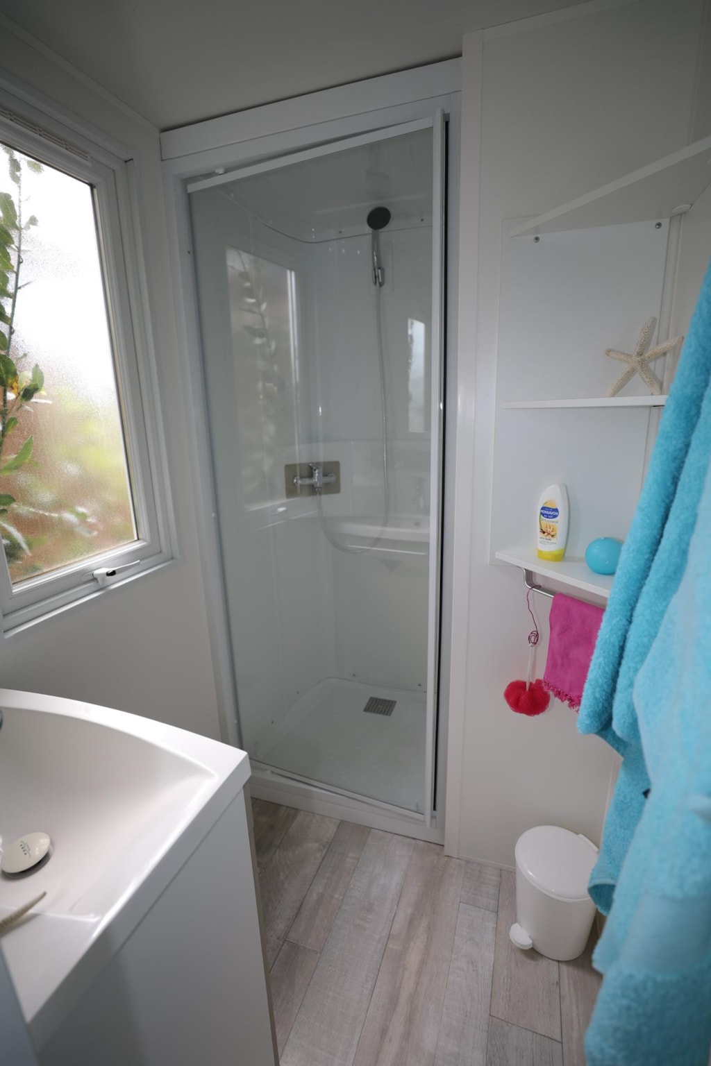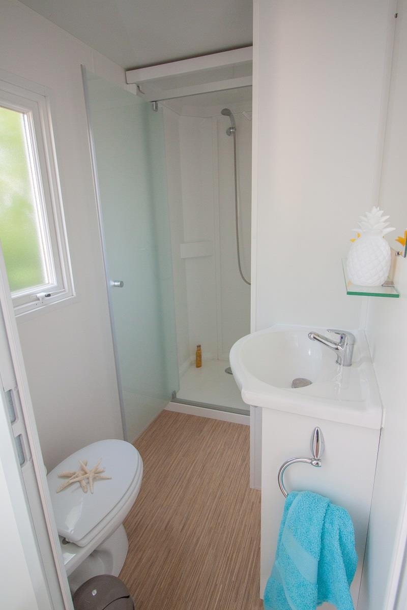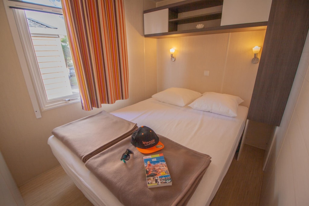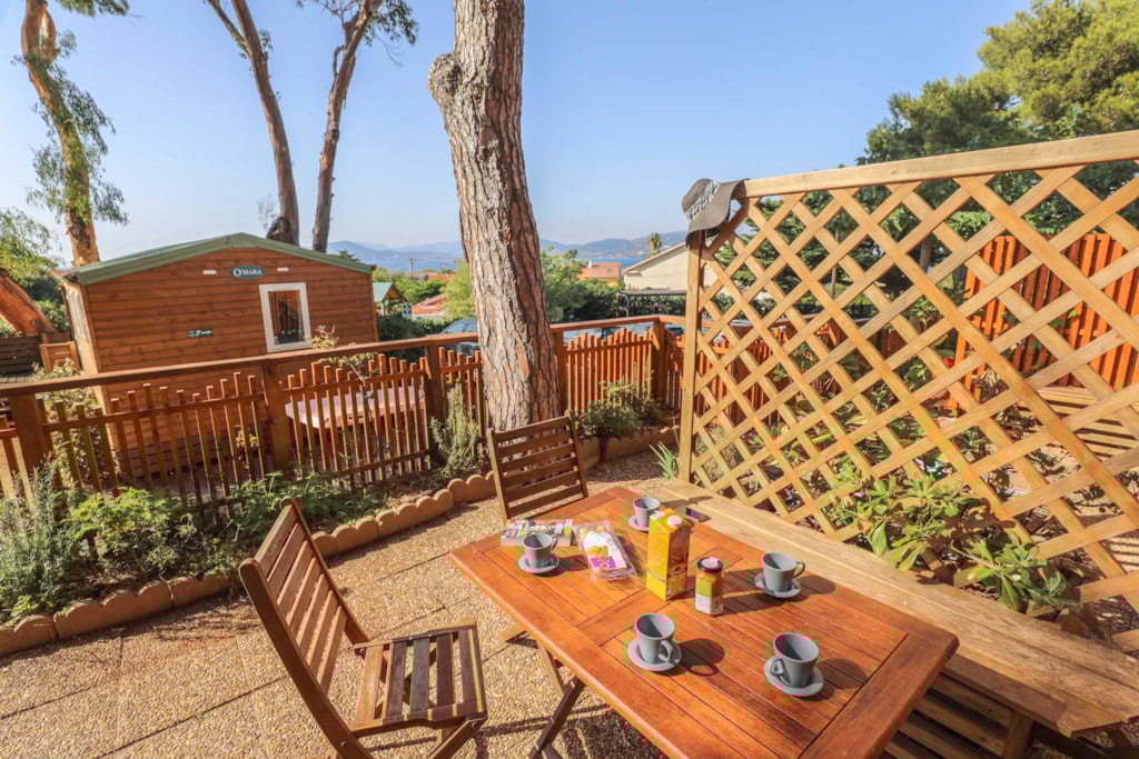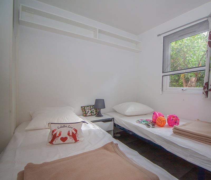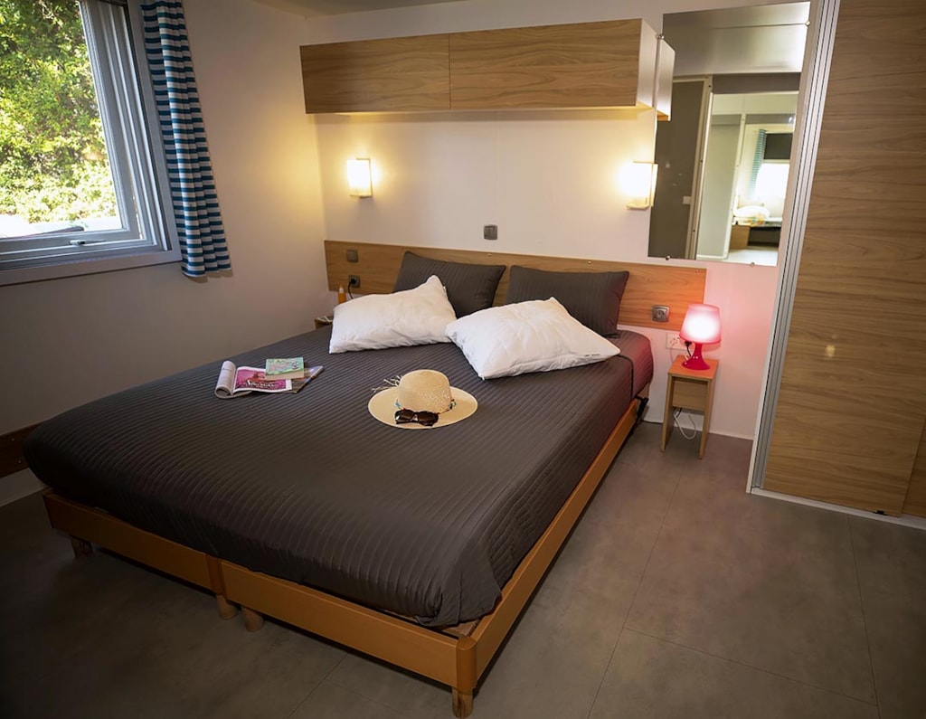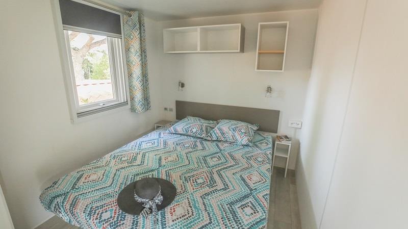 25 m² großes Mobilheim für 4/5 Personen. Es umfasst ein Elternschlafzimmer mit Doppelbett, ein Schlafzimmer mit zwei Einzelbetten, einen Wohnbereich mit ausgestatteter Küche und eine sehr große Terrasse/Sonnenterrasse mit Gartentisch und -stühlen sowie einem privaten Spa. Meerblick