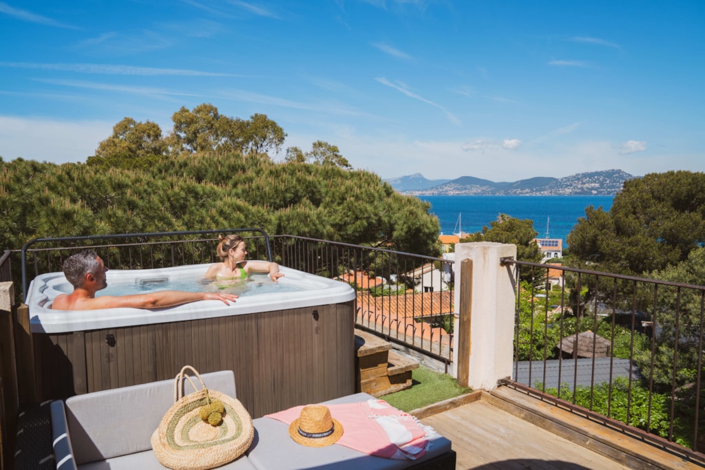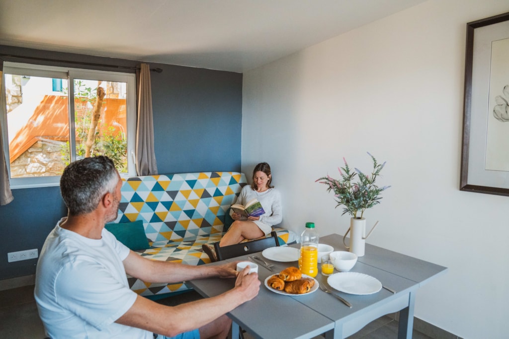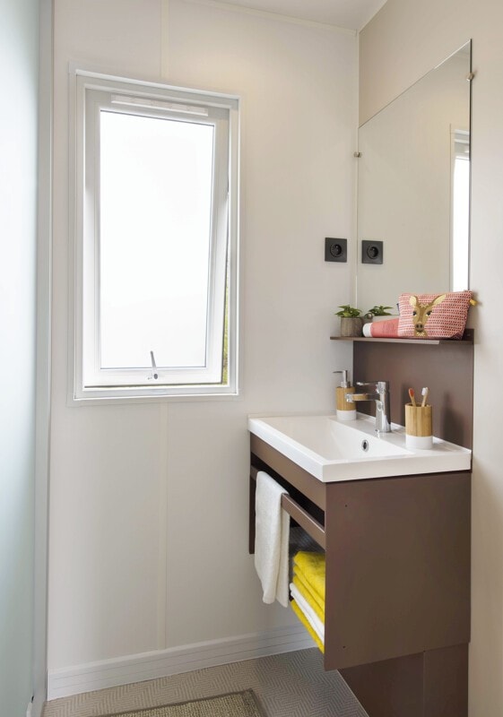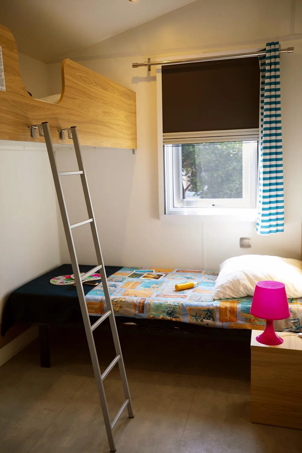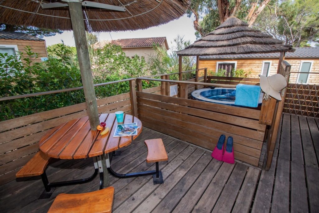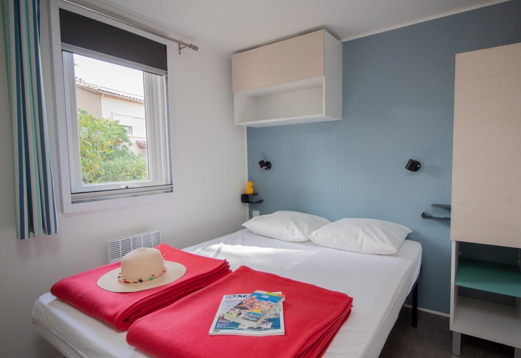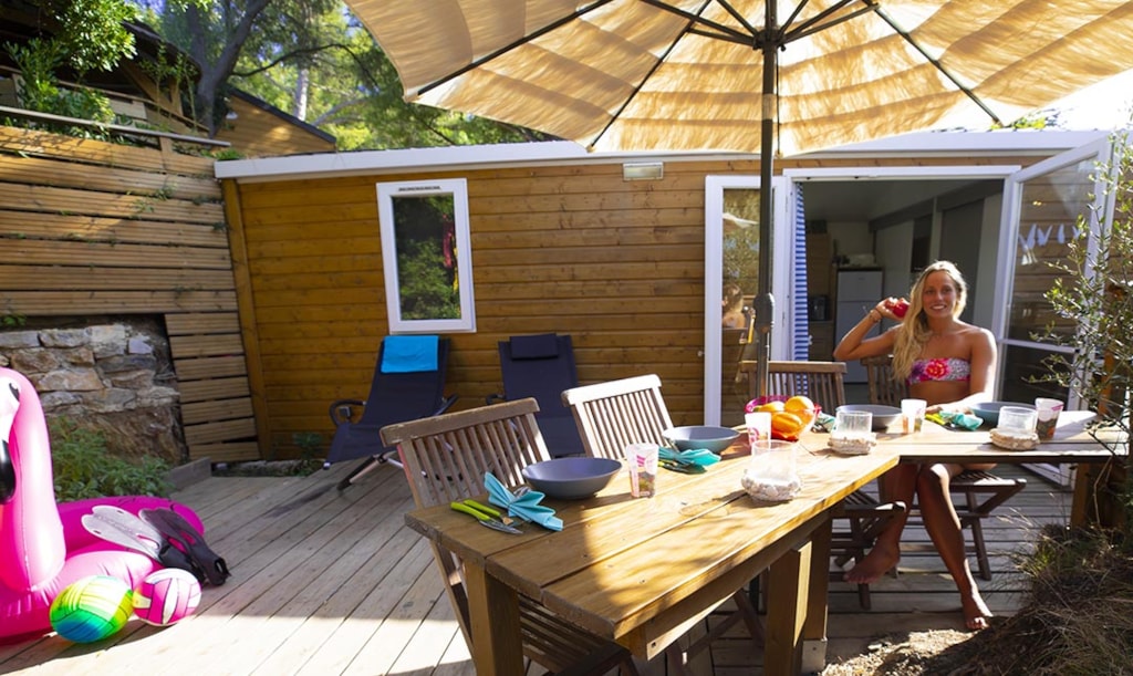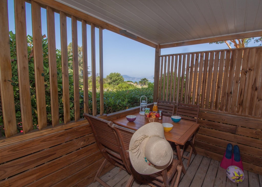 25 m² großes Mobilheim für 4/5 Personen. Es umfasst ein Elternschlafzimmer mit Doppelbett, ein Schlafzimmer mit zwei Einzelbetten, einen Wohnbereich mit ausgestatteter Küche und eine sehr große Terrasse/Sonnenterrasse mit Gartentisch und -stühlen sowie einem privaten Spa. Meerblick