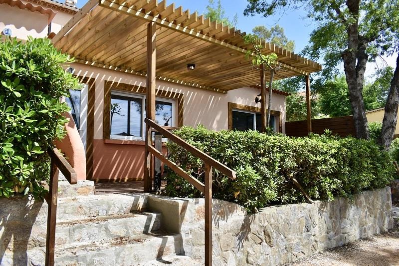 Mobilheim von 2024/25 mit Klimaanlage und Meerblick. Es besteht aus zwei Schlafzimmern, einem Wohnzimmer mit Küchenzeile, einem Badezimmer, einem separaten WC und einer überdachten Terrasse.