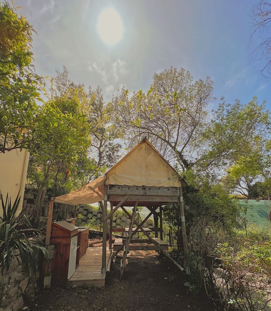Pfahlbauzelt für 1 bis 2 Personen, ungewöhnlich und naturnah auf einem kleinen schattigen Platz.