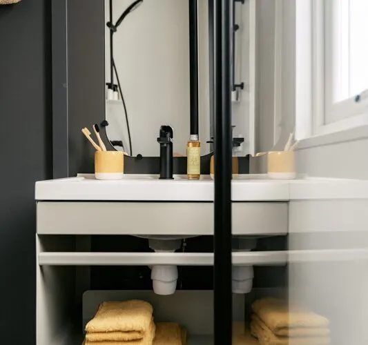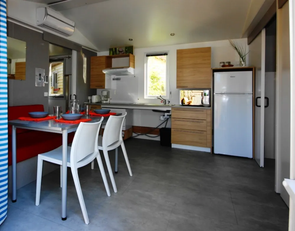 32m2 großes Mobilheim aus dem Jahr 2024/25 mit Klimaanlage. Es besteht aus 2 Schlafzimmern, einem Wohnzimmer mit Küchenzeile, einem Badezimmer, einem separaten WC und einer überdachten Terrasse.