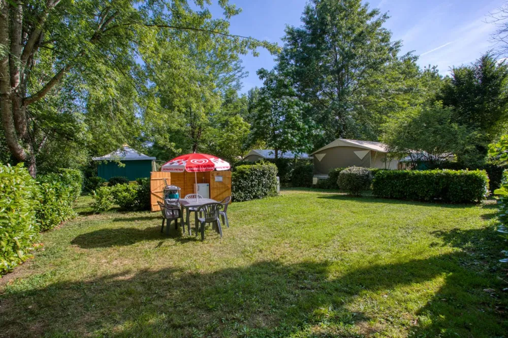 Stellplatz mit Strom, Kühlschrank, 2 Gasplatten, 1 Tisch und 4 Stühlen