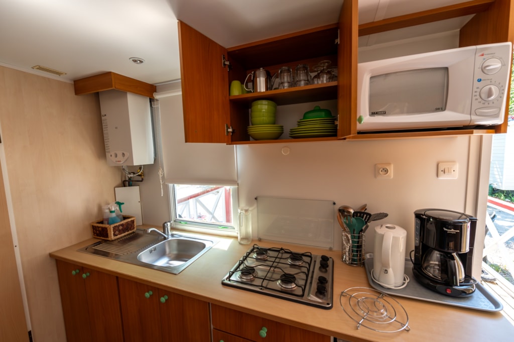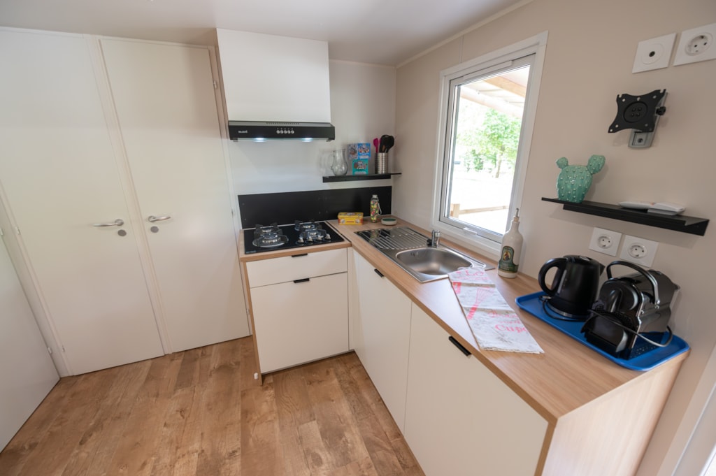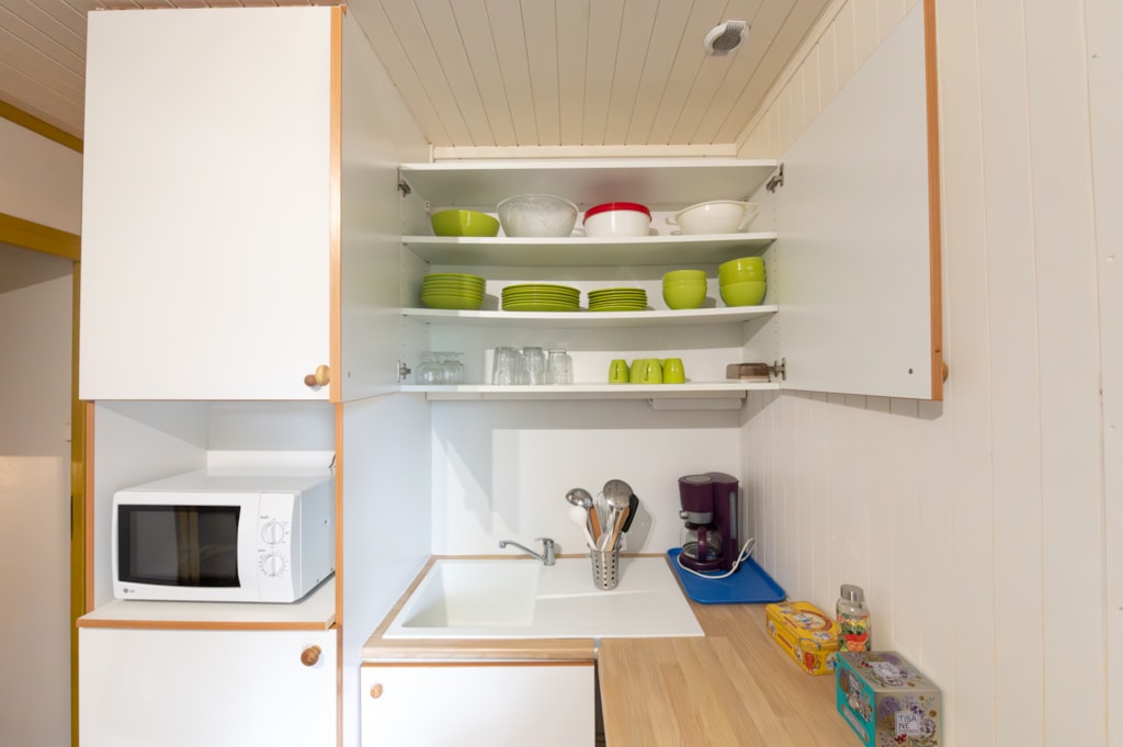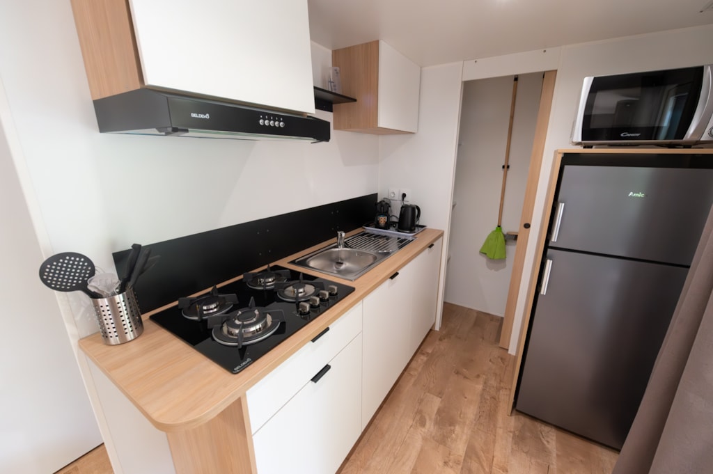 Küchenbereich mit Spüle, 110-L-Kühlschrank und Kochplatten.