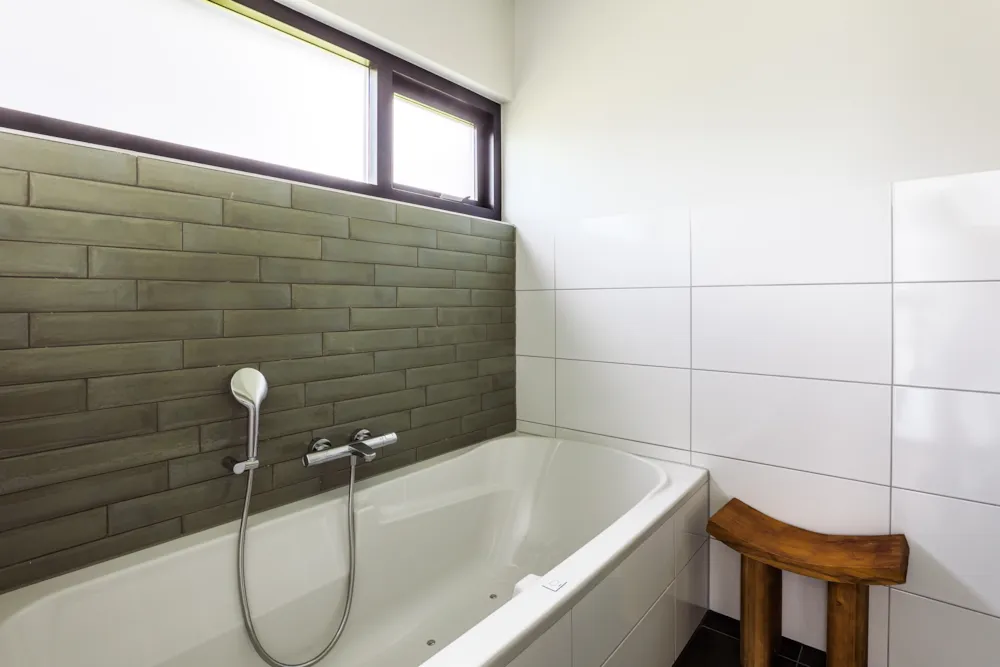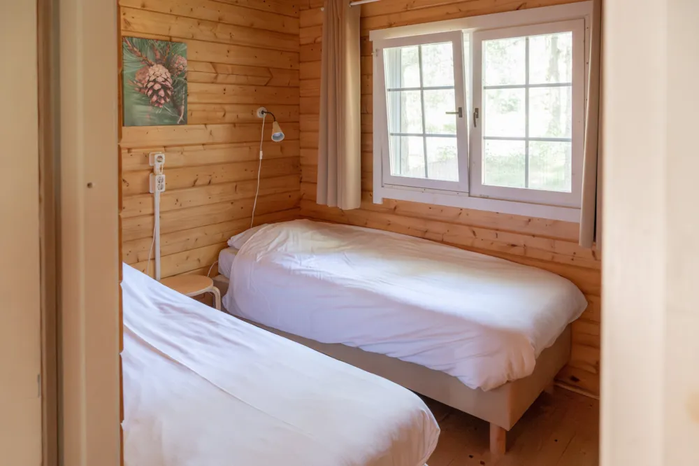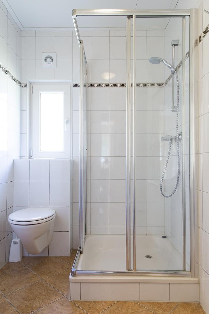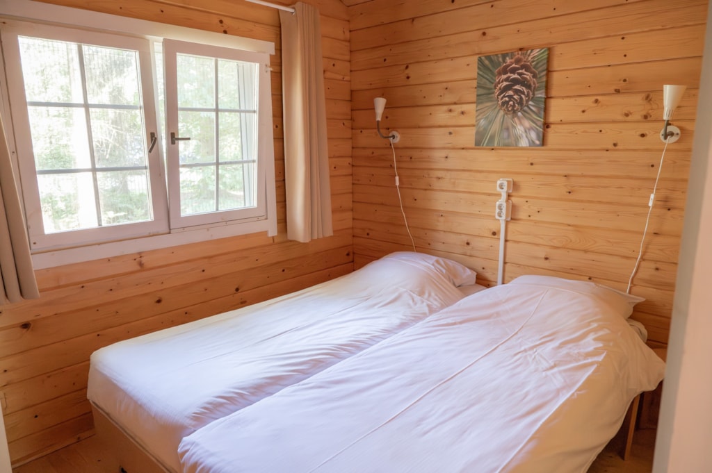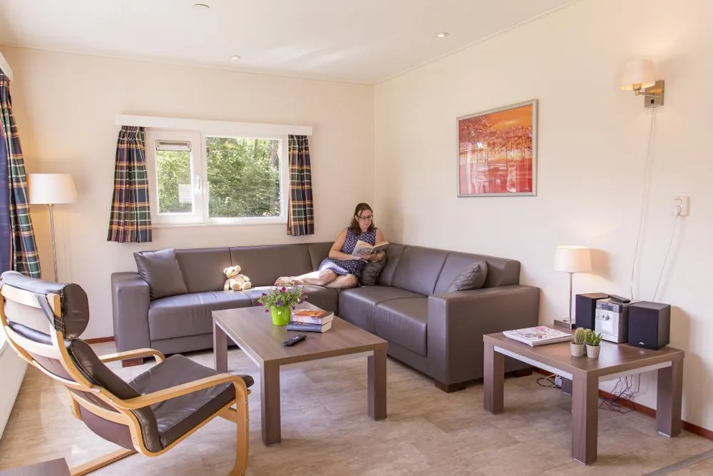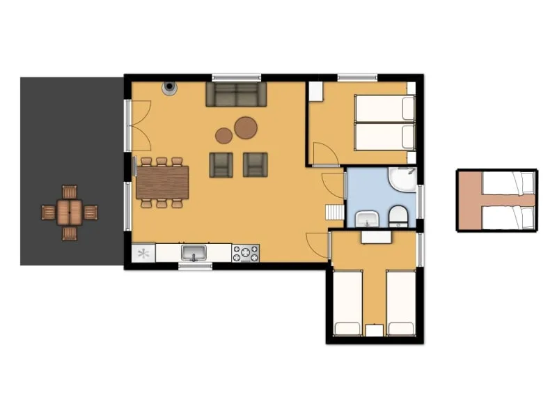 Das gemütliche Wohnzimmer verfügt über eine Sitzecke und einen Esstisch für vier Personen. Es gibt drei Schlafzimmer: eines mit einem Doppelbett, ein Kinderzimmer mit zwei separaten Betten (eines davon ein Hochbett), und ein drittes Zimmer mit einem Einzelbett. Zwei Badezimmer stehen zur Verfügung, jeweils mit Dusche, Waschbecken und WC – ideal für zusätzlichen Komfort und Privatsphäre.