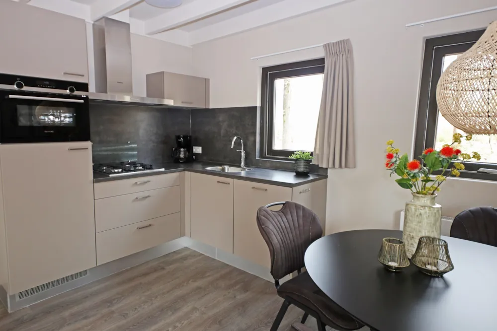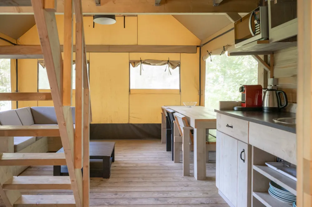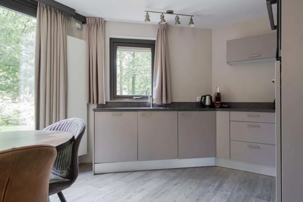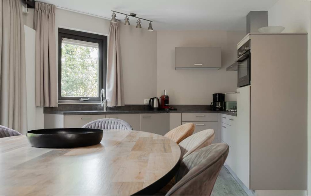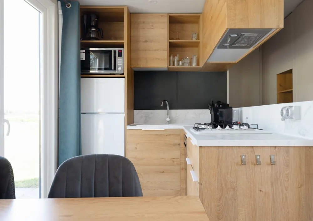 Dieses komfortable und komplett ausgestattete Mobilheim ist ideal für einen erholsamen Urlaub mit der ganzen Familie. Die zur Gartenseite gelegene Küche bietet alle Annehmlichkeiten: Kühlschrank, 4-Flammen-Gasherd mit Dunstabzugshaube, Kombimikrowelle, Geschirrspüler, Wasserkocher, Nespresso-Maschine, Kaffeemaschine und eine komplette Küchenausstattung.
