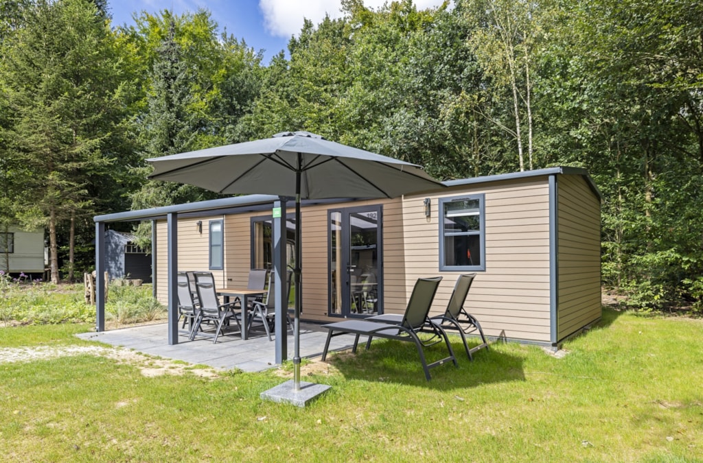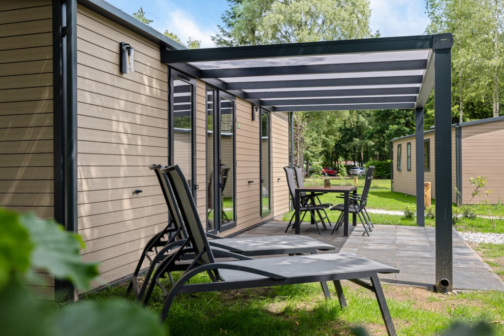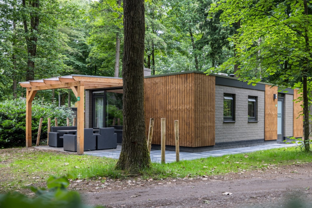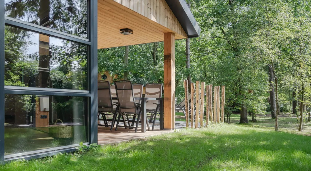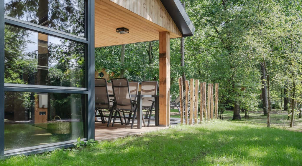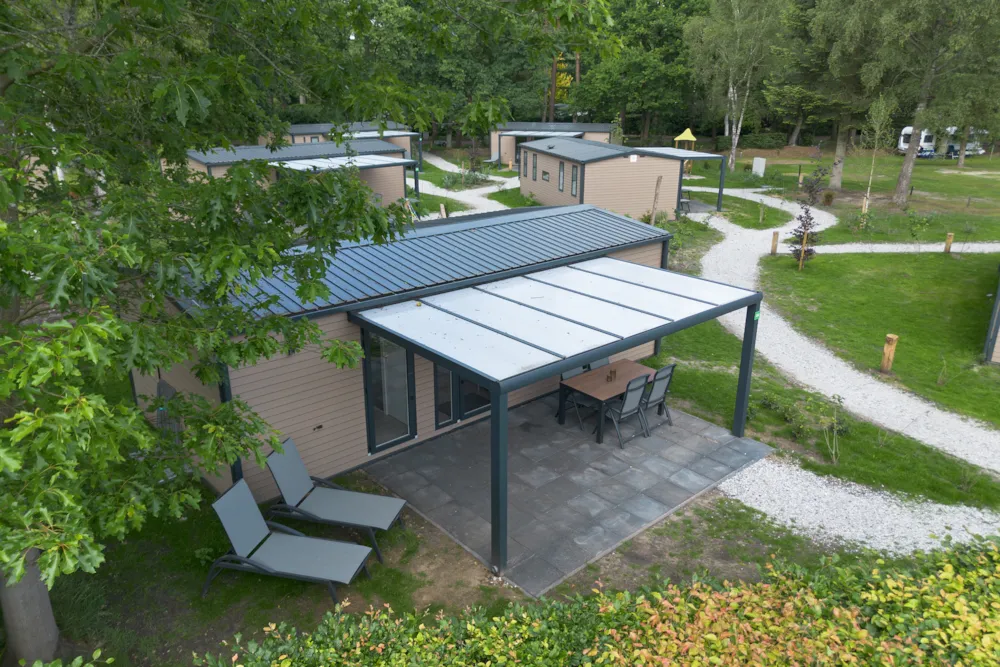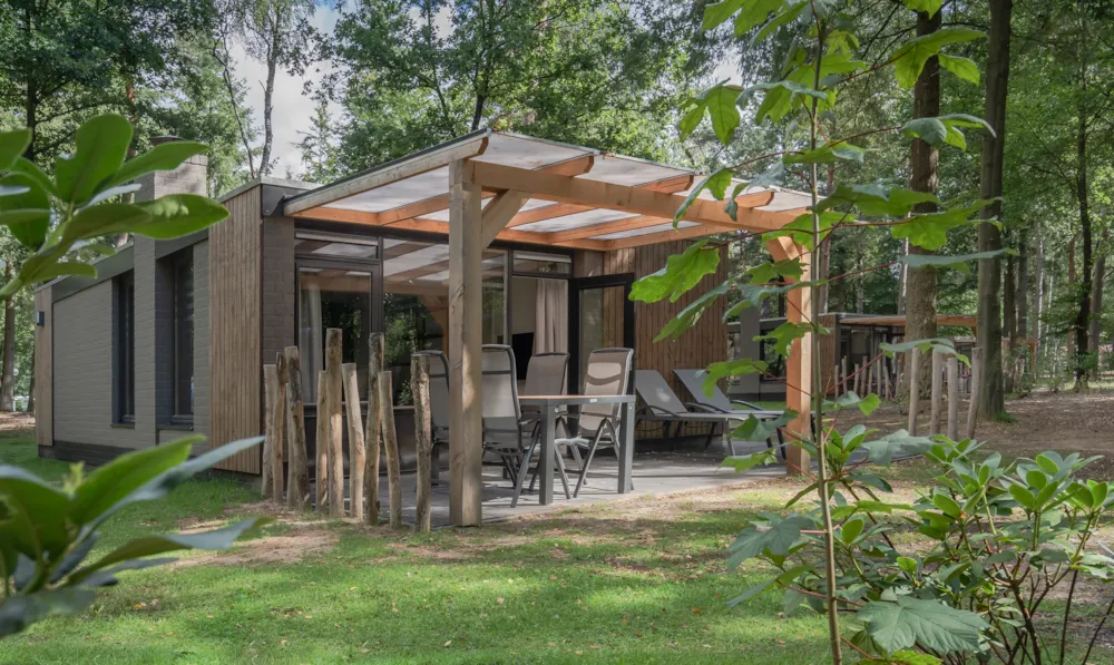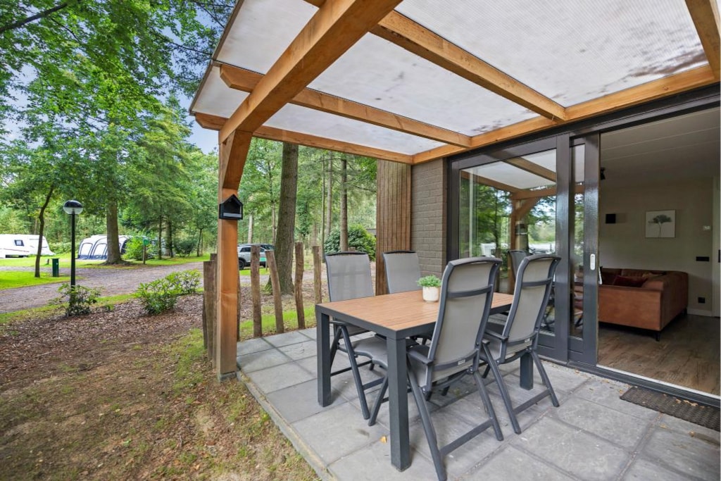 De tuin ligt op het zuiden en is voorzien van een overkapping en luxe tuinmeubilair. Je kan er tot laat in de avond van de Veluwse natuur genieten. De auto kun je bij de bungalow parkeren.
