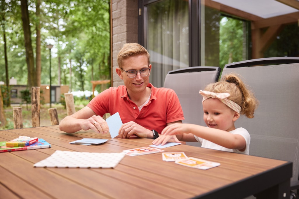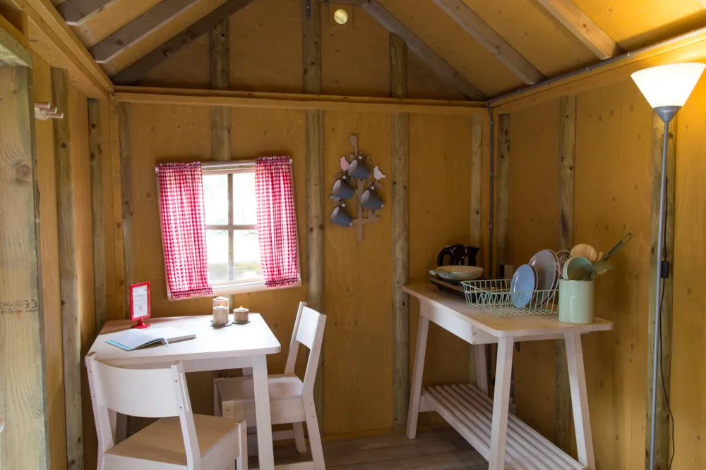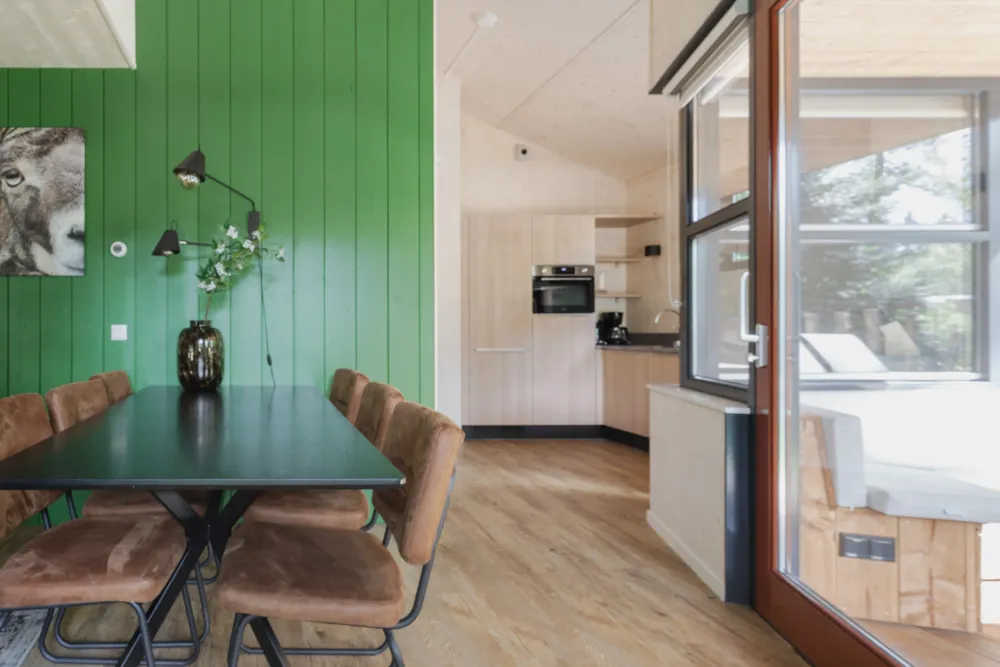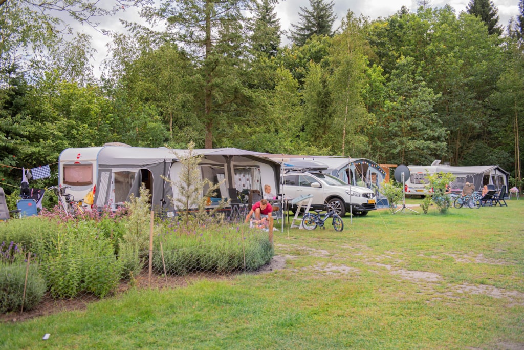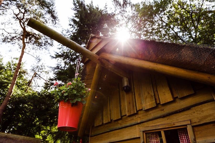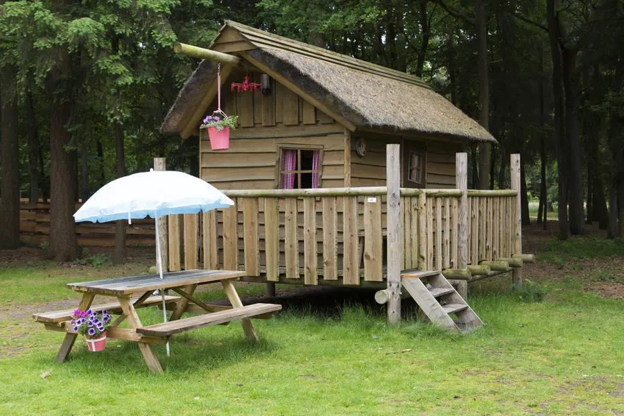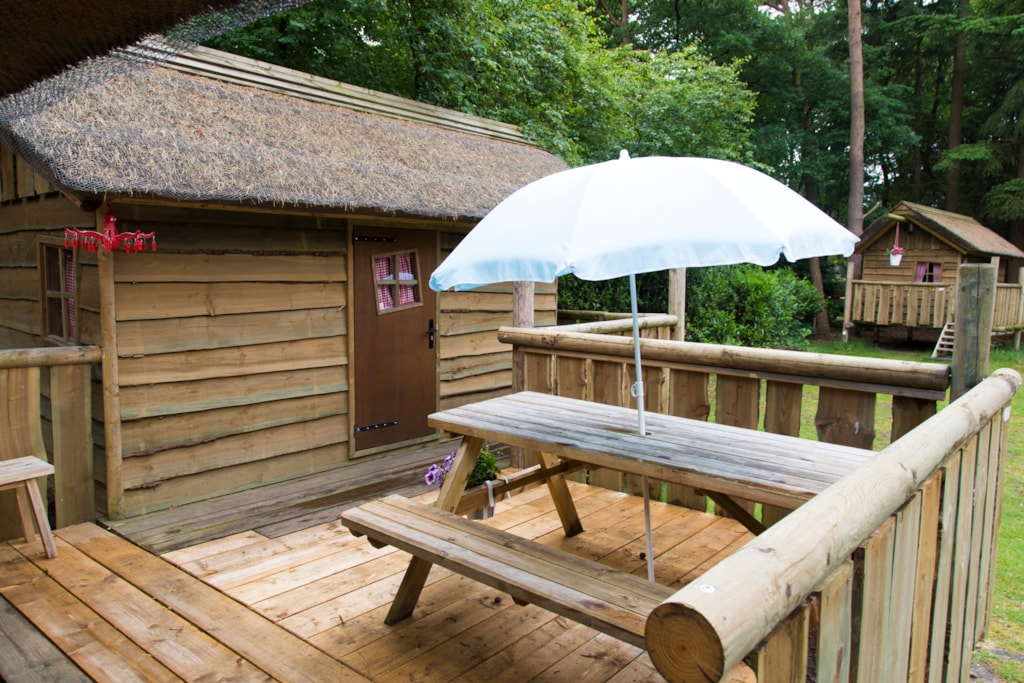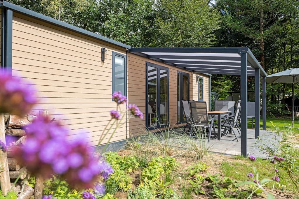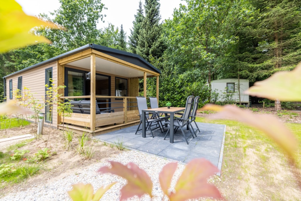 De tuin ligt op het zuiden en is voorzien van een overkapping en luxe tuinmeubilair. Je kan er tot laat in de avond van de Veluwse natuur genieten. De auto kun je bij de bungalow parkeren.