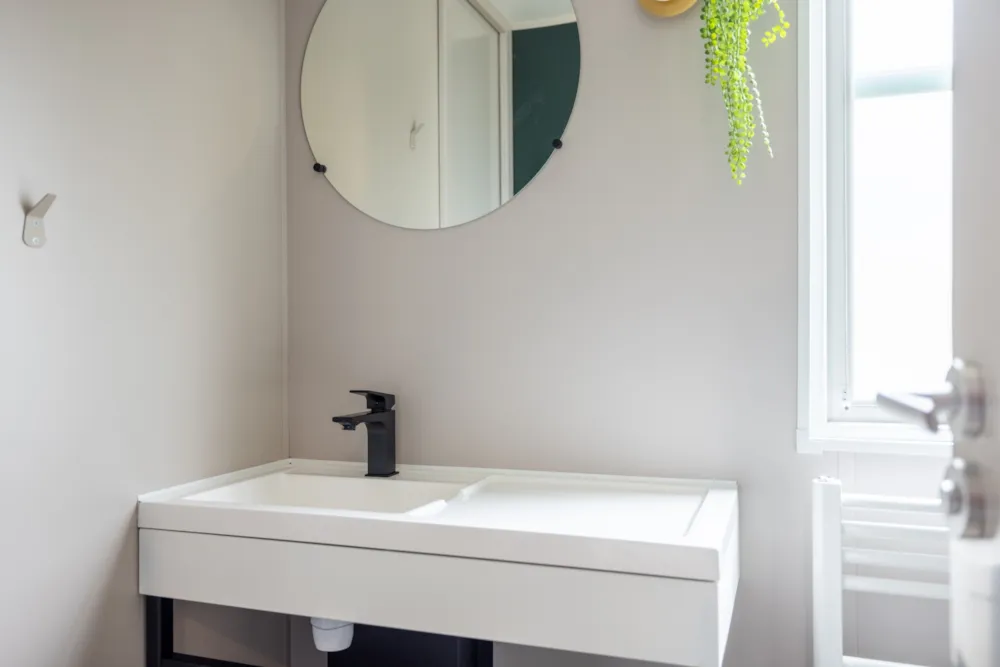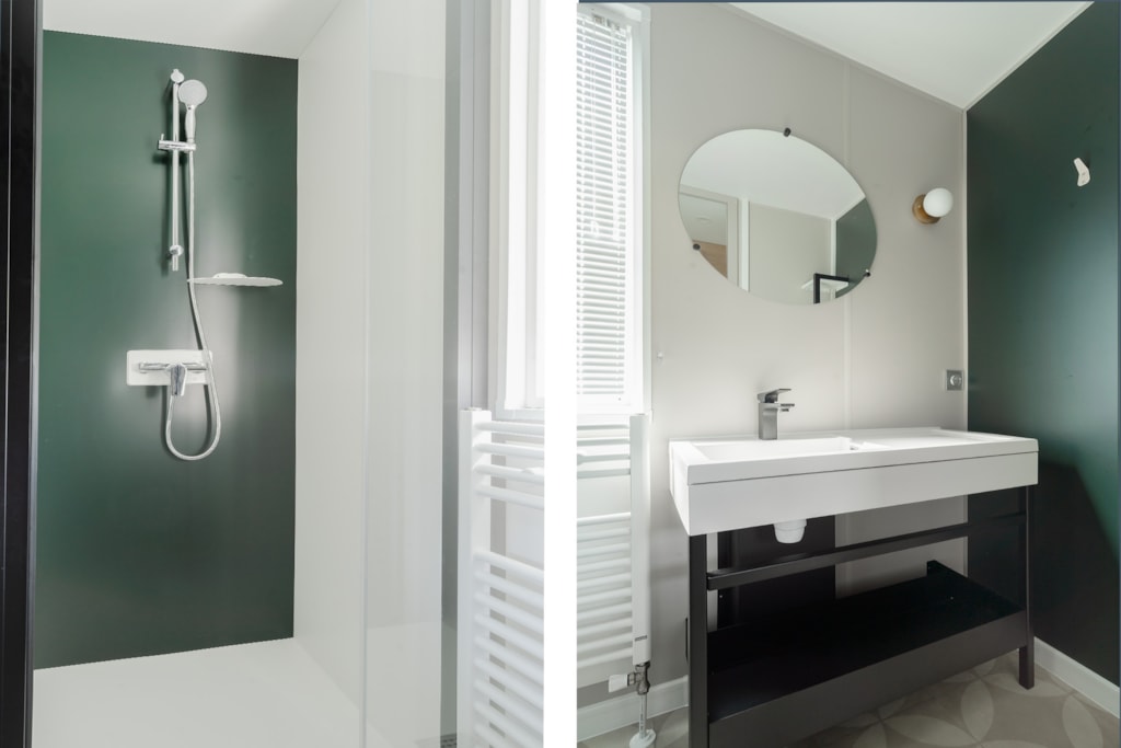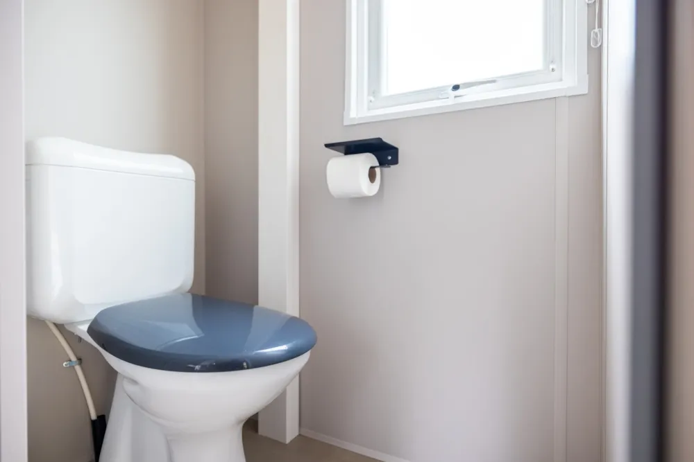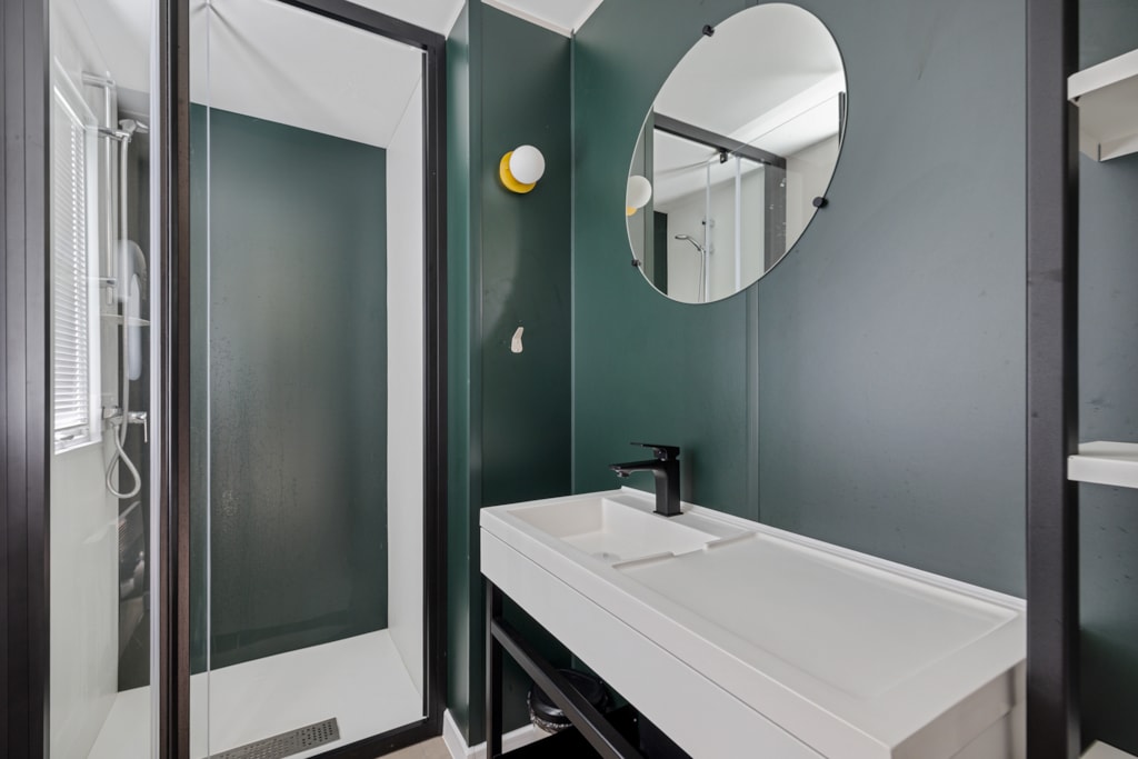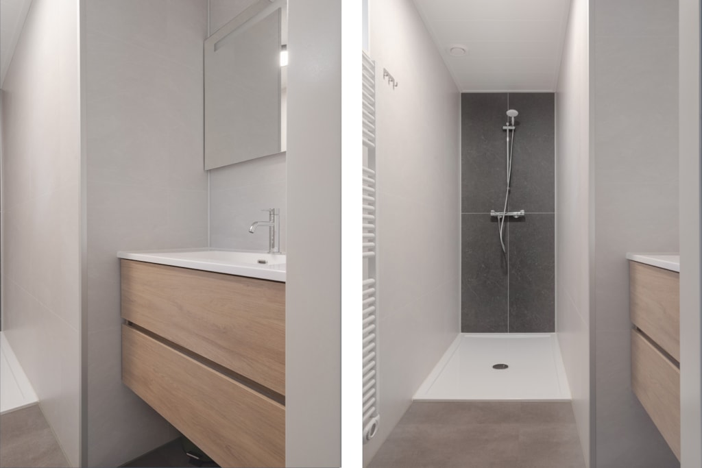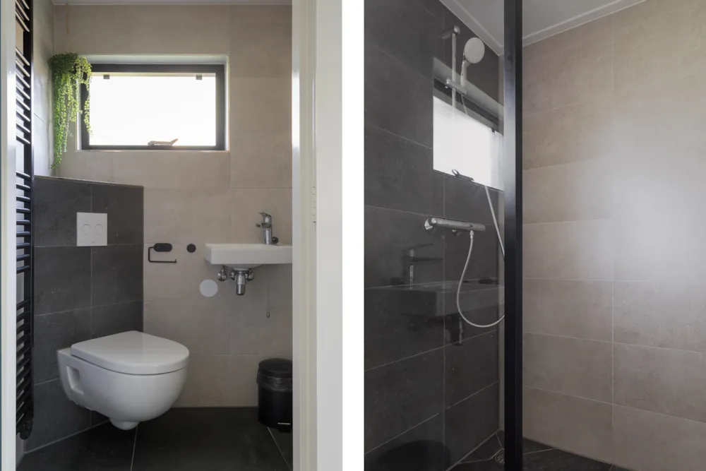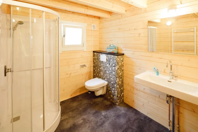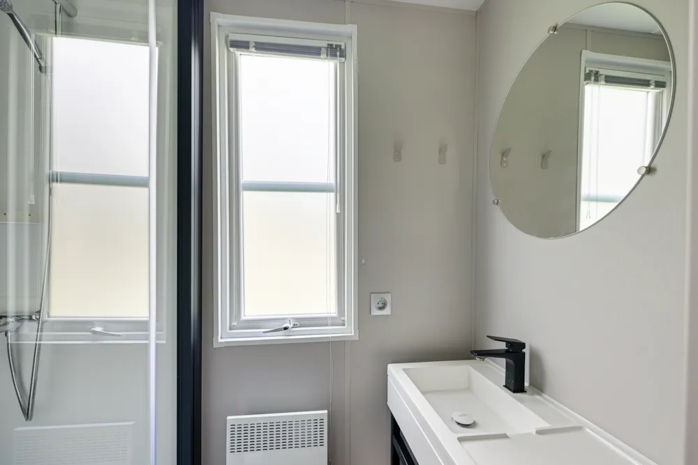 De bungalow heeft een badkamer met douche, wastafel en toilet.