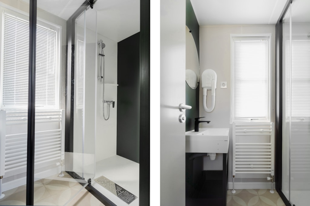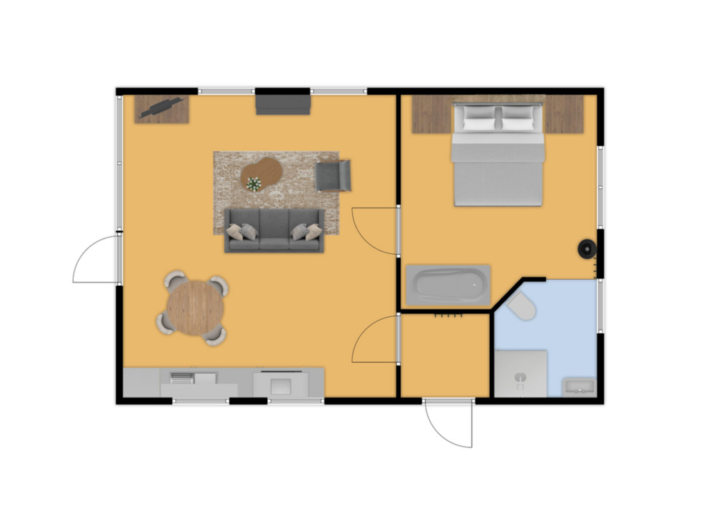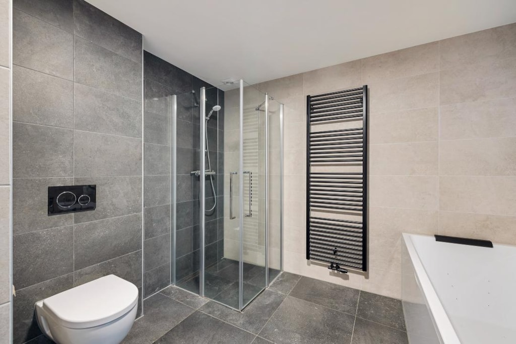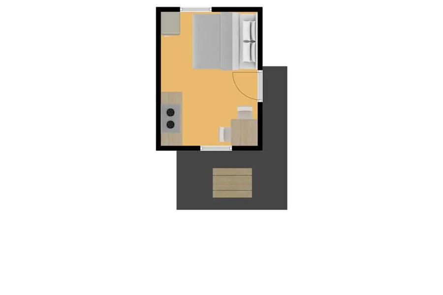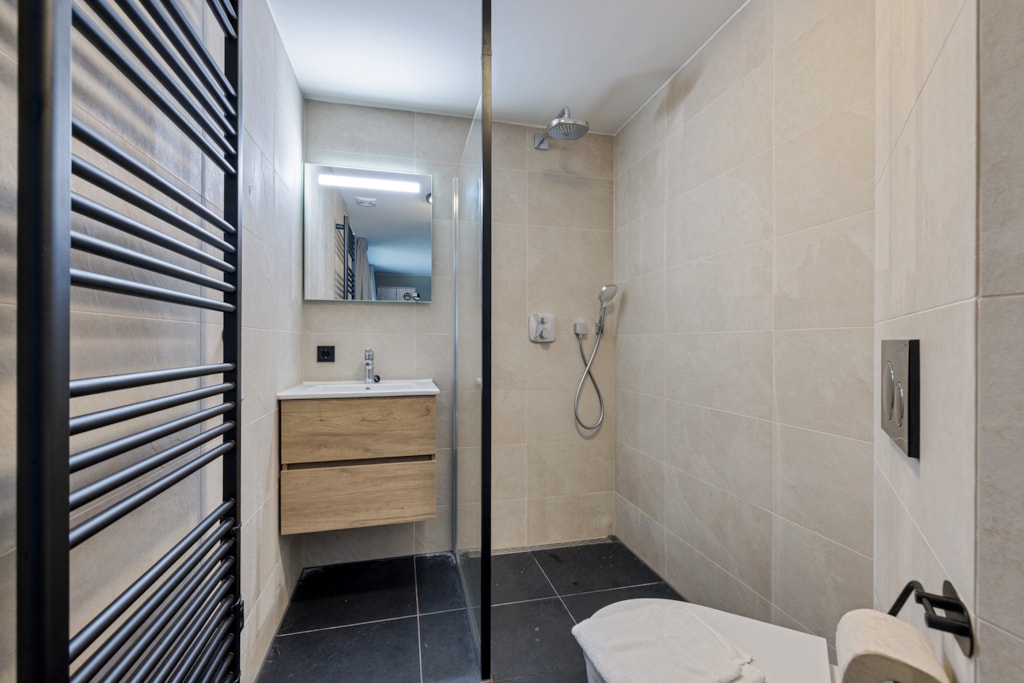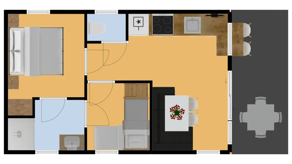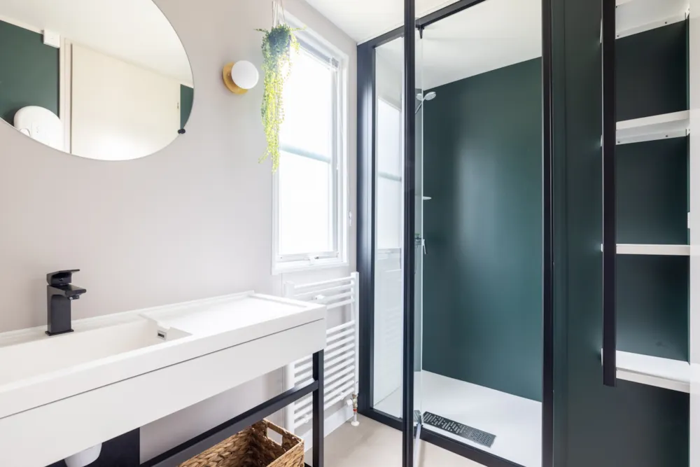De bungalow heeft een badkamer met douche, wastafel en toilet.