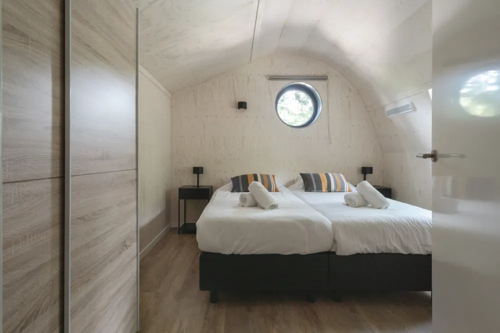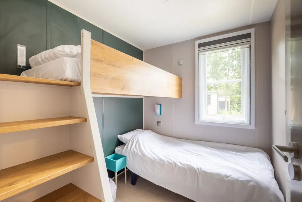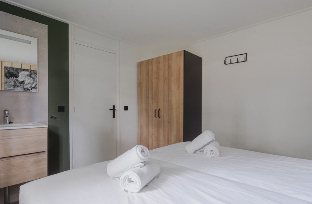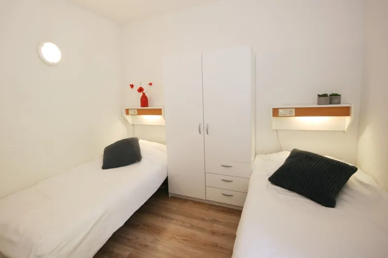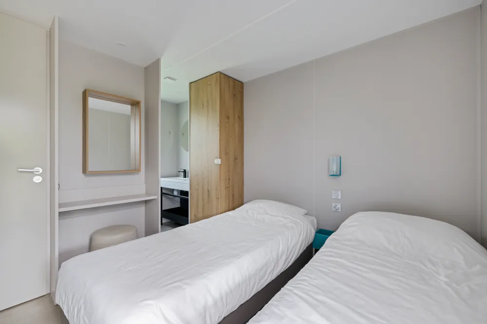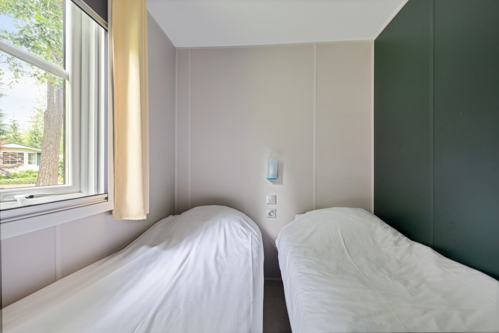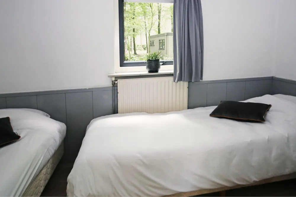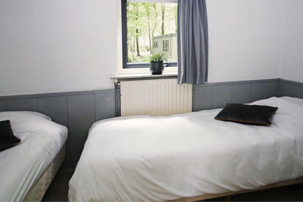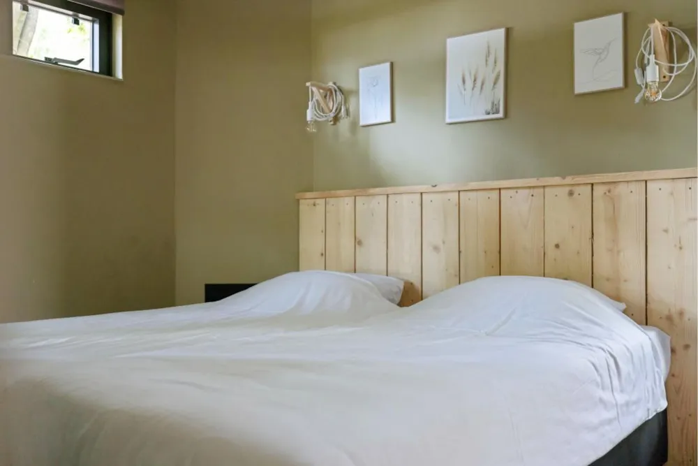 Er zijn twee slaapkamers. Eén slaapkamer met twee luxe Swiss Sense eenpersoons boxspringbedden van 2,00 bij 0,90 meter en de andere slaapkamer met ook twee eenpersoons boxspringbedden. Elke bed heeft een eenpersoonsdekbed en kussens Het bijplaatsen van een babybedje is mogelijk in de grote slaapkamer.