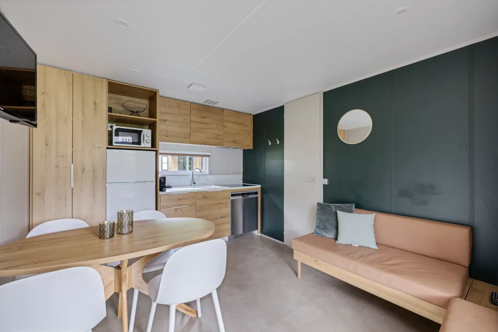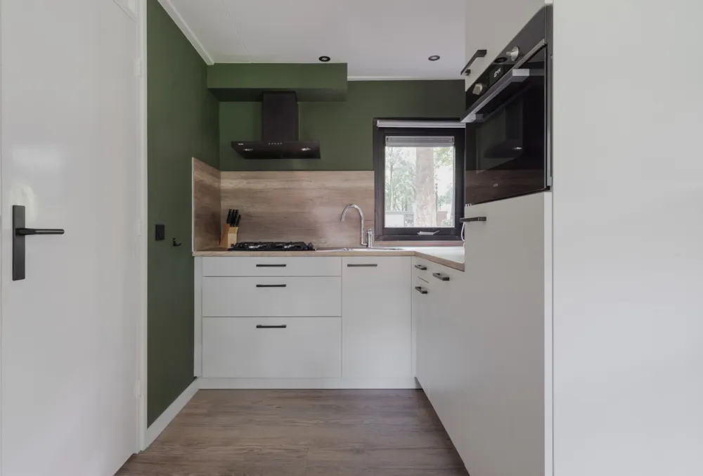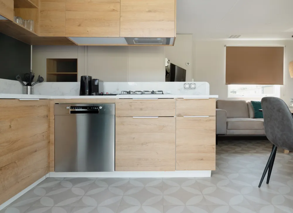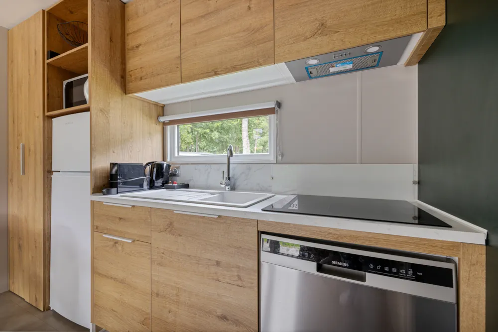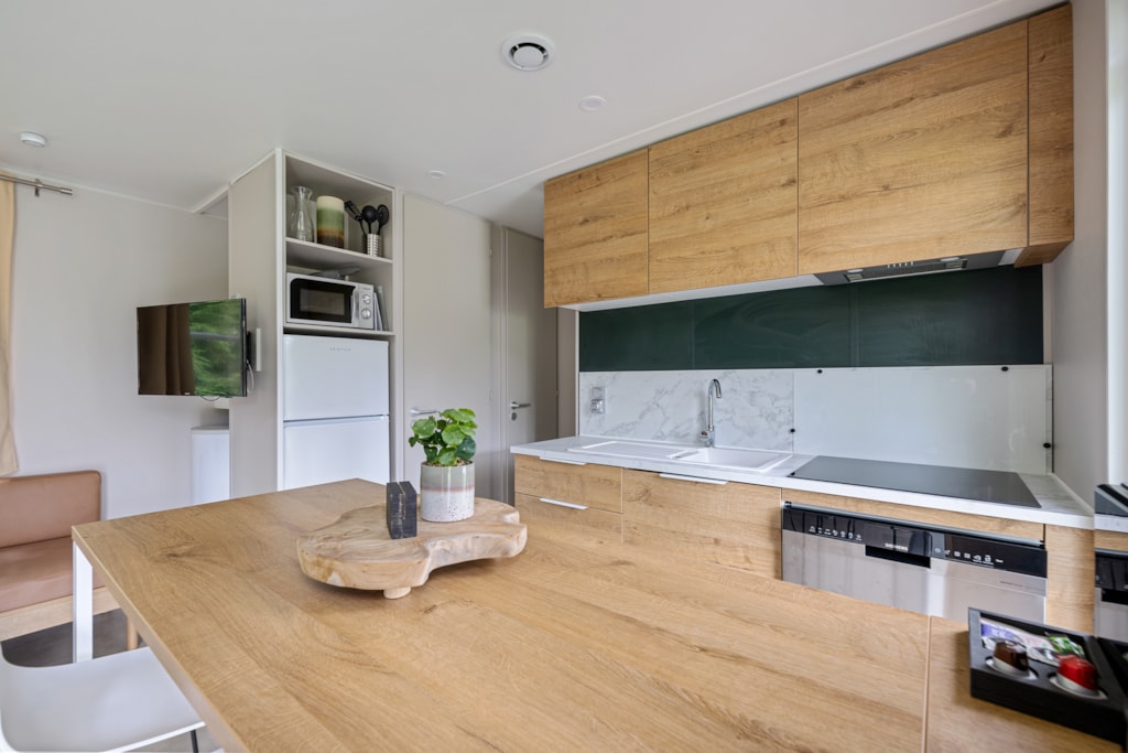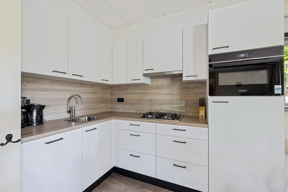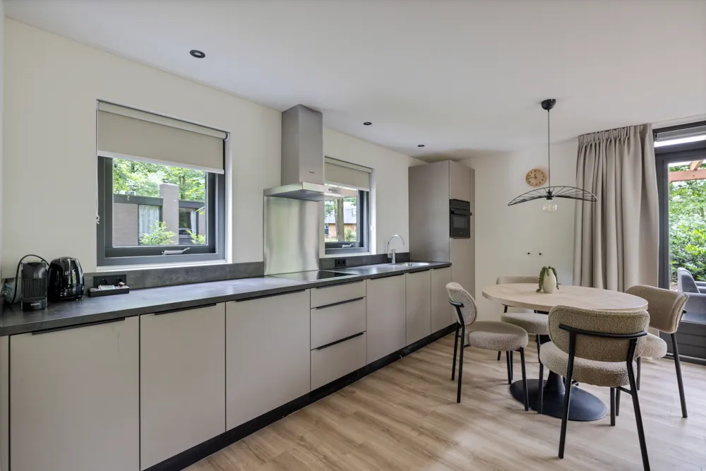 De open l-vormige keuken heeft een 4-pits gaskookplaat, afzuigkap, koelkast met vriesvak, vaatwasser, Nespresso koffiezetappraraat en filter koffiezetapparaat, waterkoker en een combimagnetron. Er is een eethoek voor vier personen.