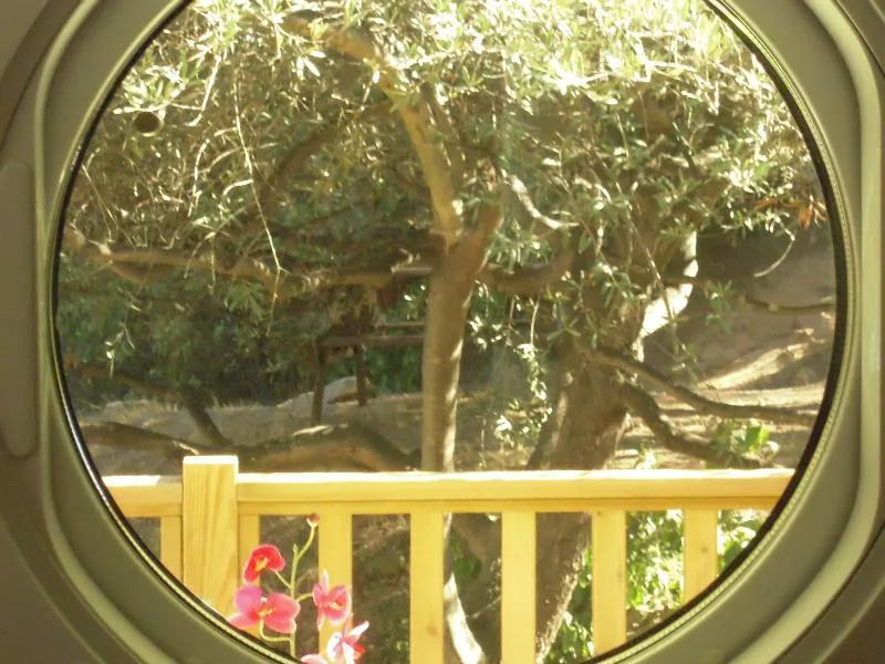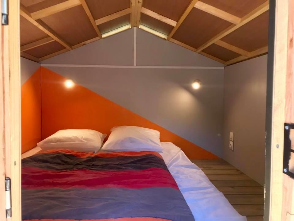 Kleine Holzhütte in der Größe eines 2-Personen-Iglu-Zeltes. Ausgestattet mit einem bodenbündigen 2-Sitzer-Boxspringbett, Matratze und 2 Kissen. Leselampen, Steckdose. Picknicktisch im Freien. 2 m mal 1,95 m mal 1,40 m bei 1,05 m Höhe.