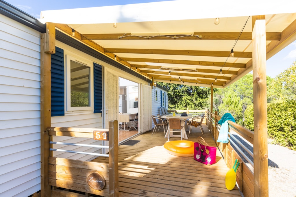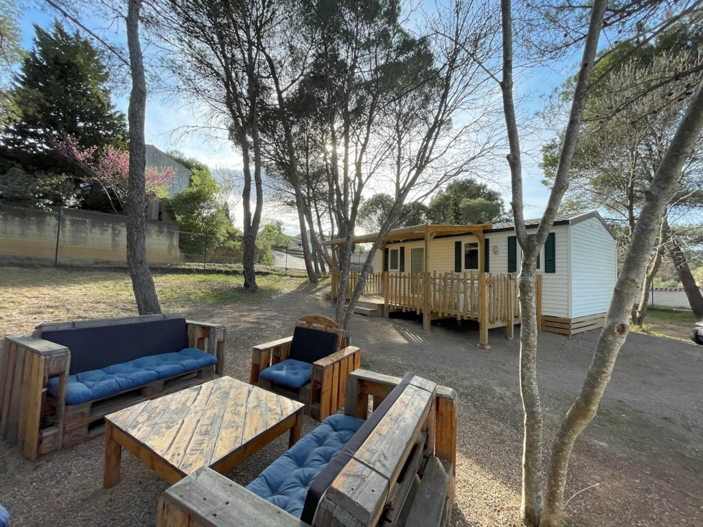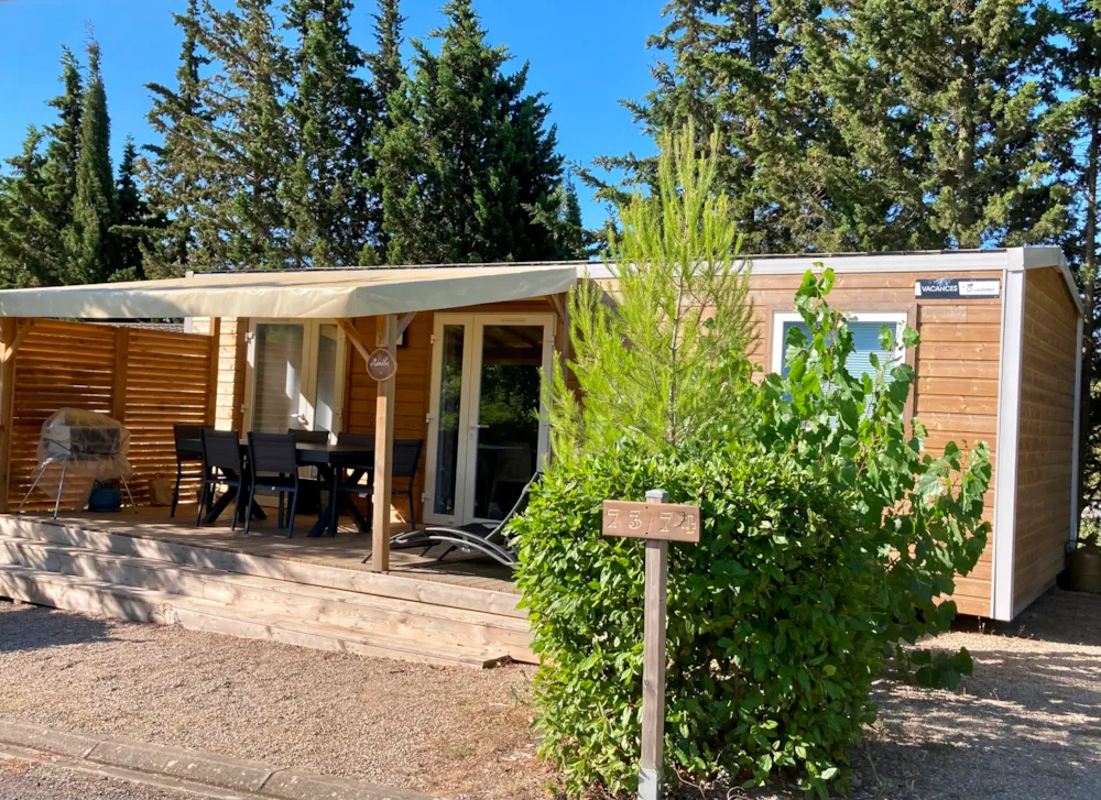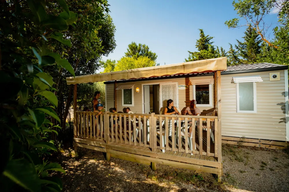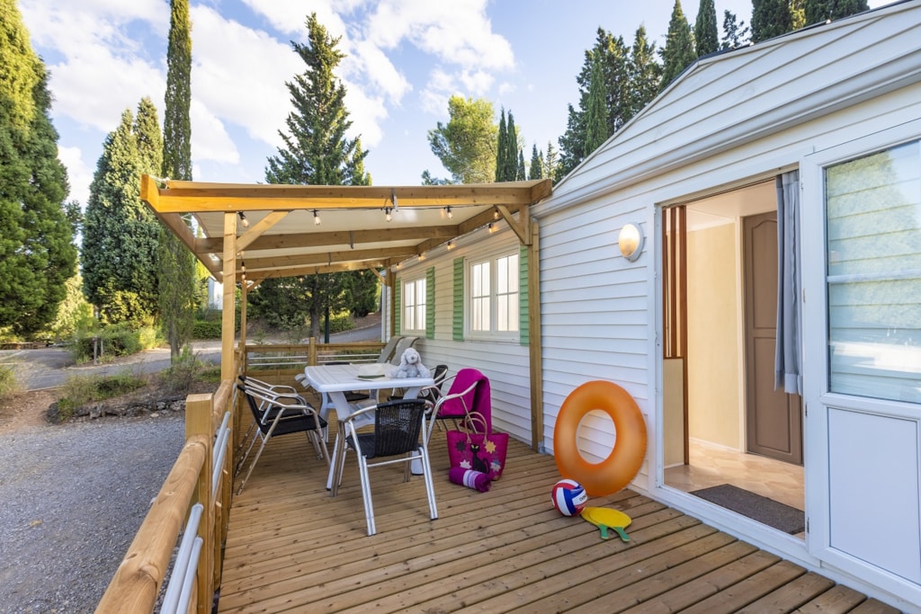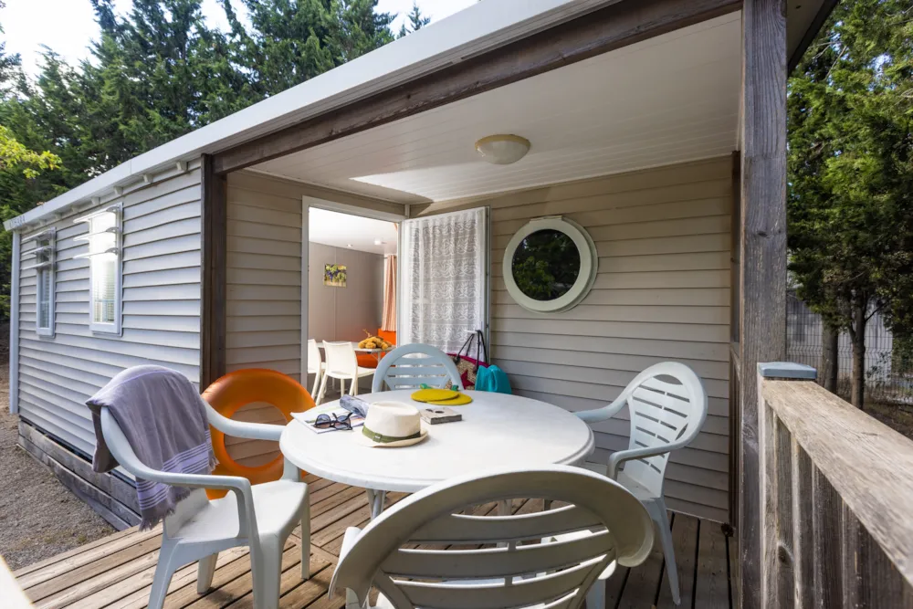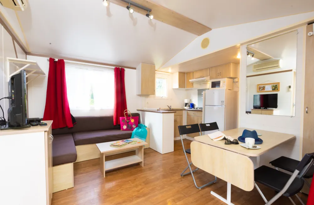 Mobilheim von 29 m² mit überdachter Terrasse von 15 m². mit TV und Klimaanlage.