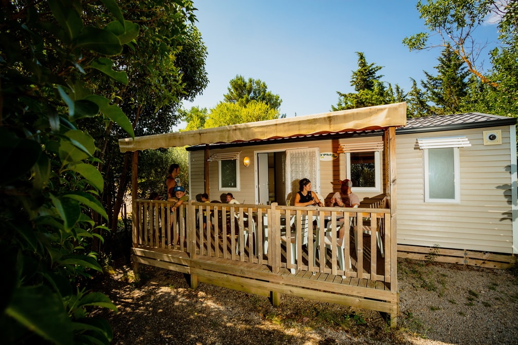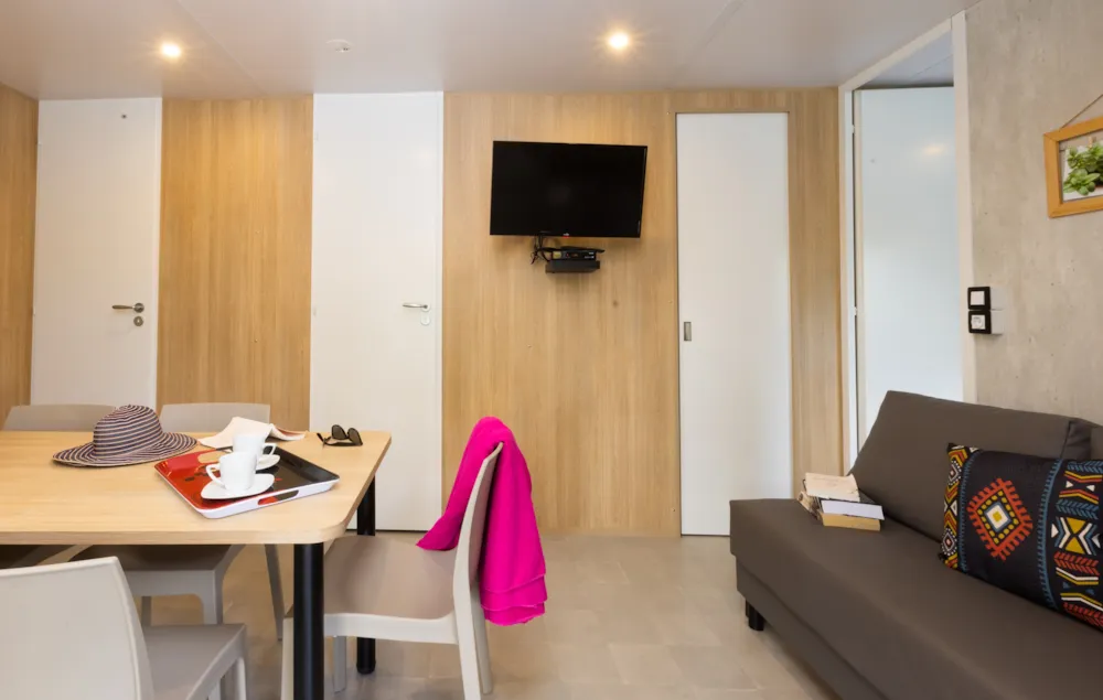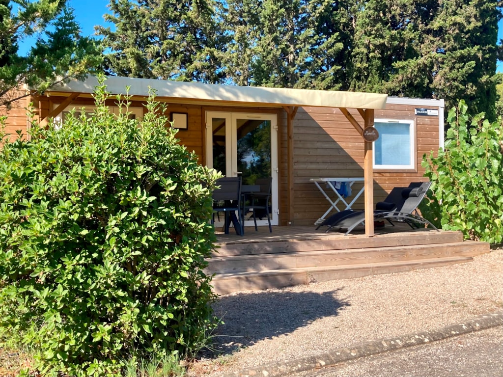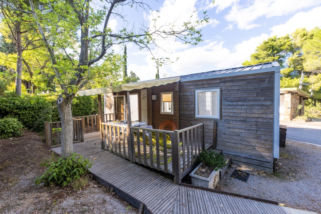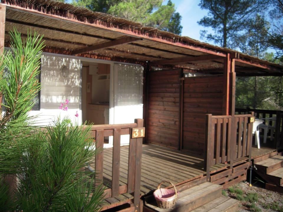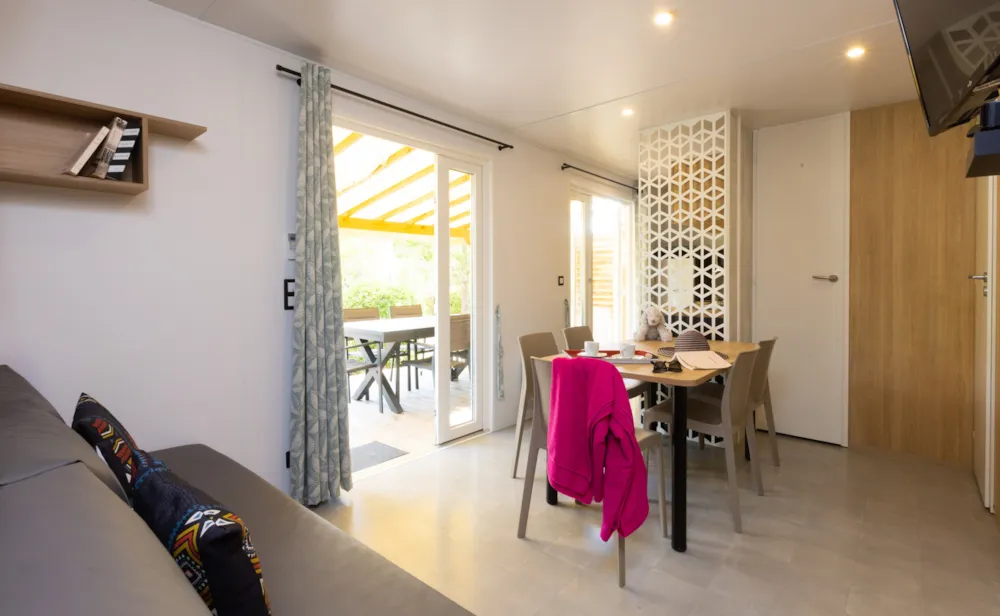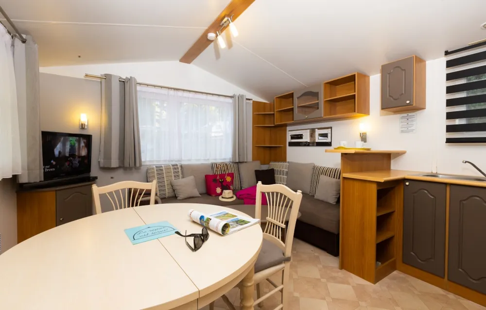 Mobilheim von 29 m² mit überdachter Terrasse von 15 m². mit TV und Klimaanlage.