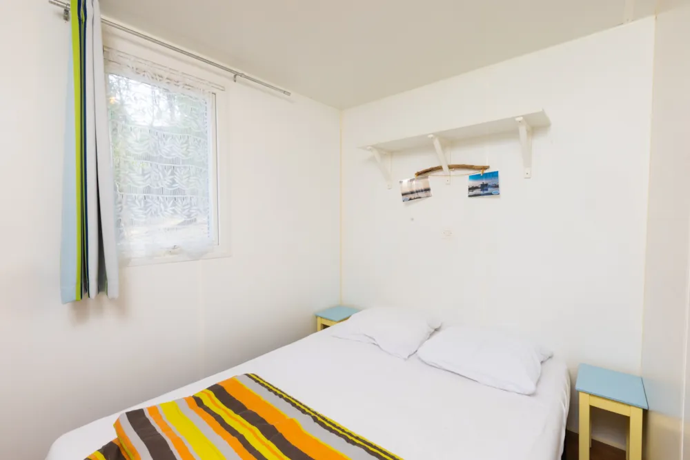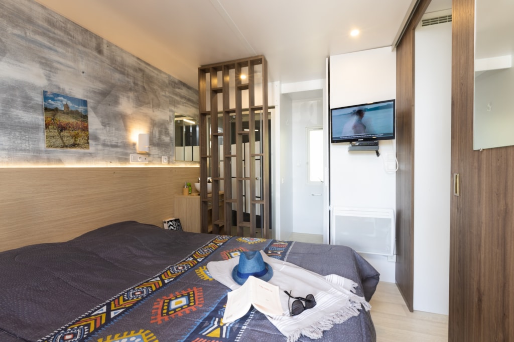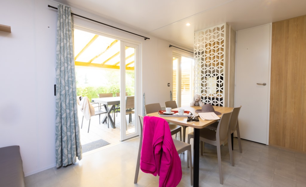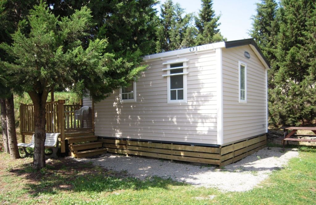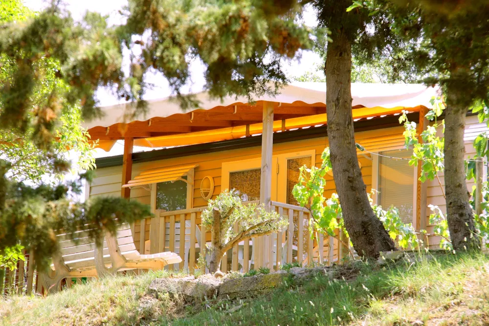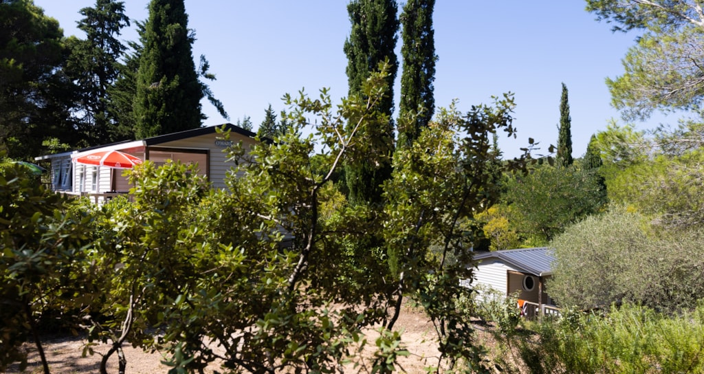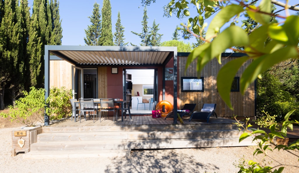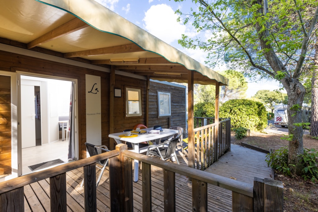 Mobilheim von 29 m² mit überdachter Terrasse von 15 m². mit TV und Klimaanlage.