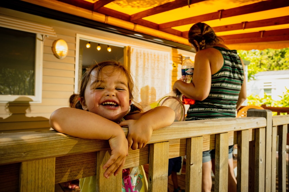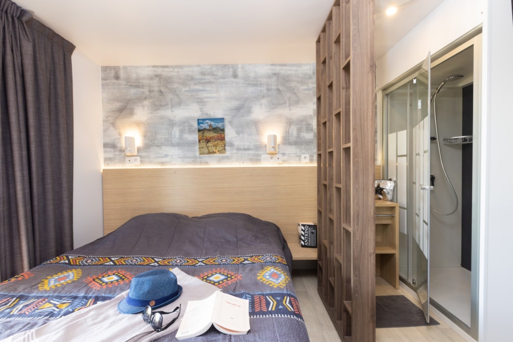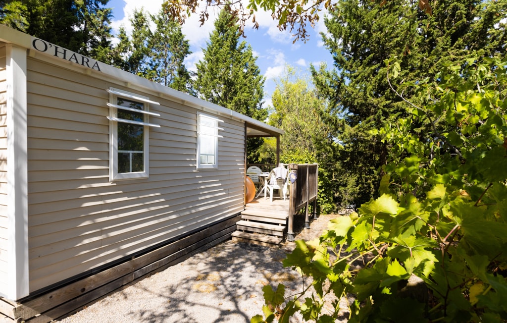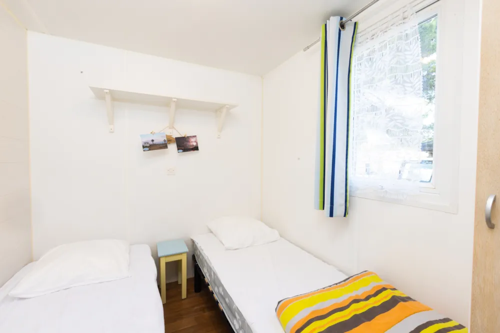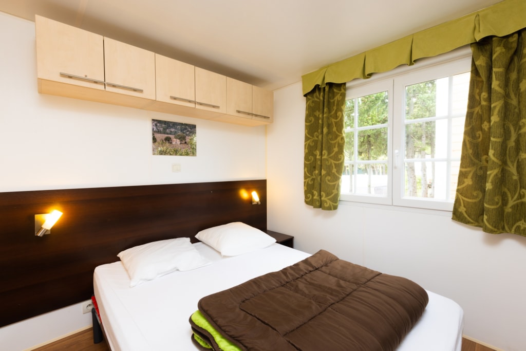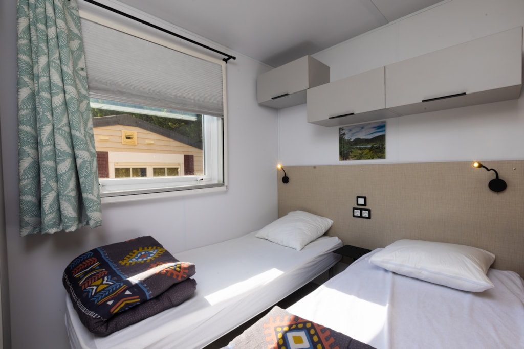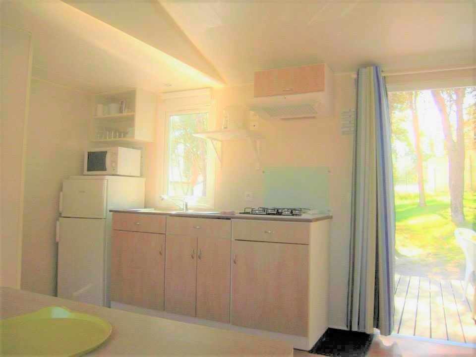 Mobilheim von 29 m² mit überdachter Terrasse von 15 m². mit TV und Klimaanlage.