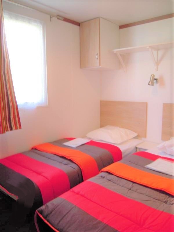 Mobilheim von mehr als 37 m² mit 3 Schlafzimmern. Überdachte Terrasse 18,75 m² und sehr angenehmes Wohnzimmer. Klimaanlage und Sat-TV.