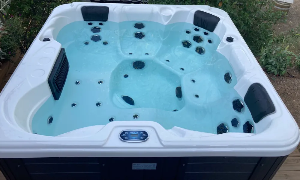 Mobilheim von 2021 mit 3 Schlafzimmern, 2 Bädern, mit Klimaanlage, 2 Fernsehern und Geschirrspüler. 40 m². Podestterrasse 18,75 m² mit Pergola 10,30 m². SPA 5 Plätze wechselnde Beleuchtung.