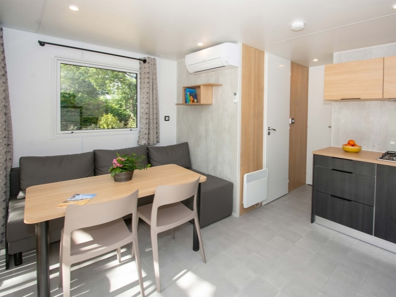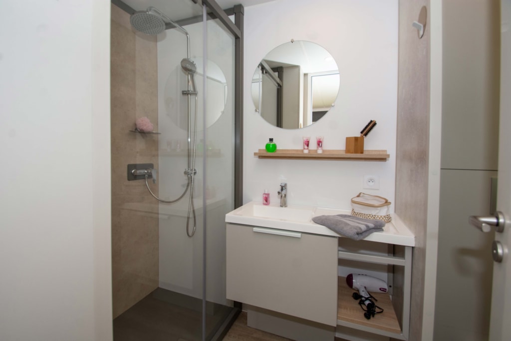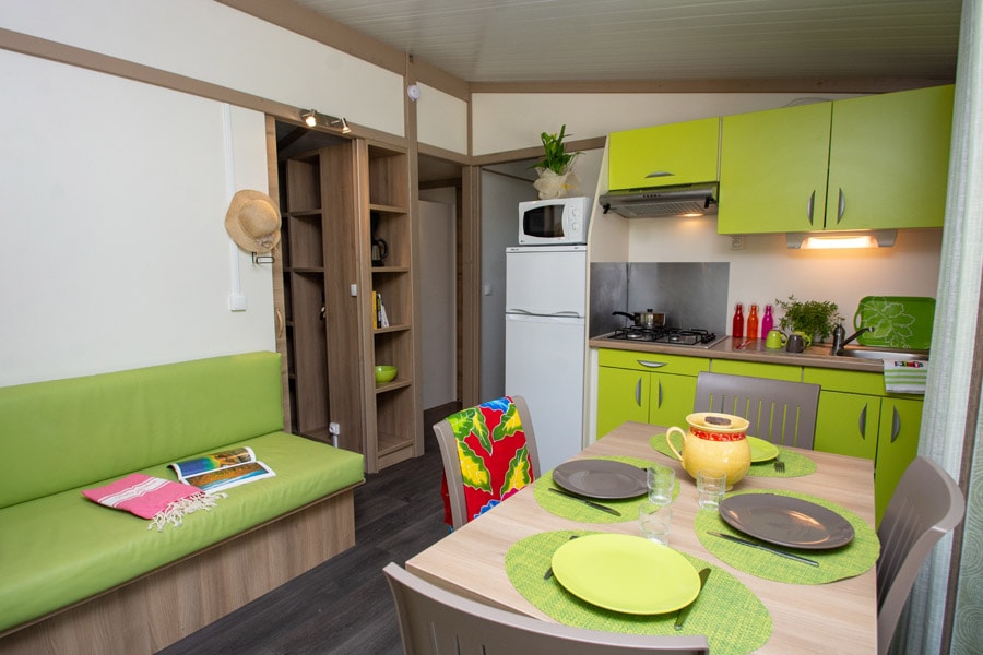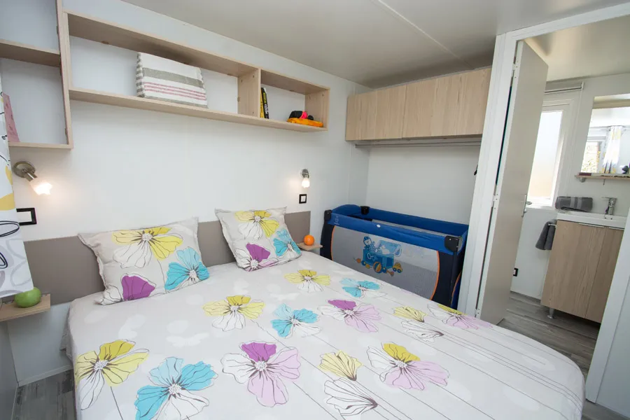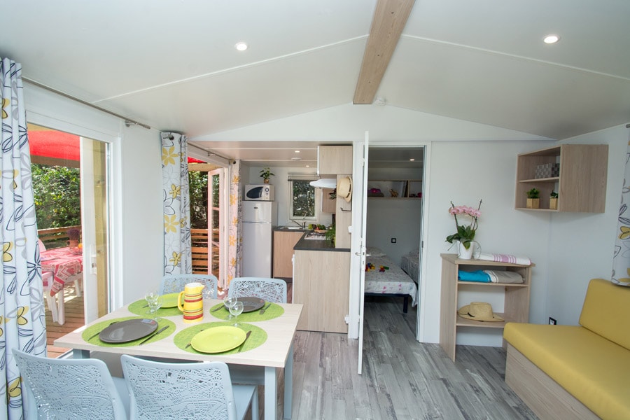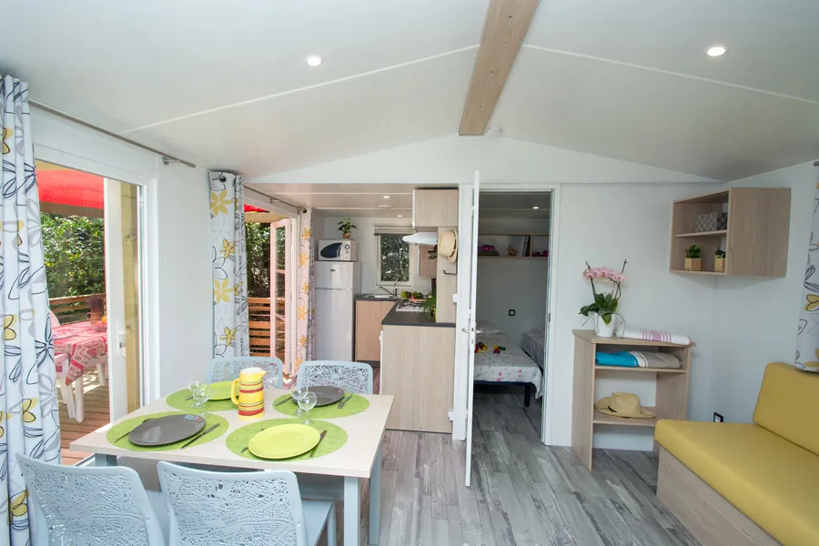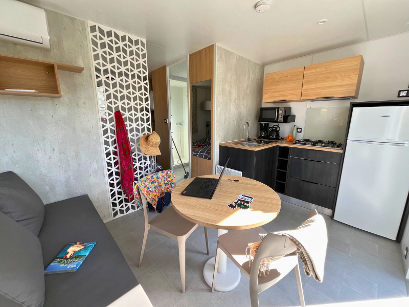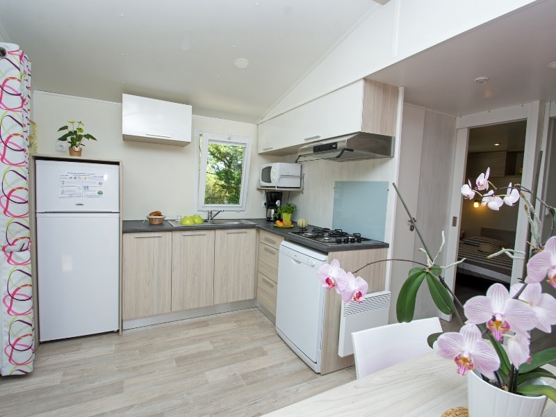 Diese Cottages sind sehr gemütlich und mit einer halbüberdachten Doppelterrasse von 16m² ausgestattet, die Ihnen die Wahl lässt, sich auf den Liegestühlen zu sonnen oder im Schatten zu frühstücken. Die Küche hat eine Fensterfront, die sich über die gesamte Breite des Chalets erstreckt, was ein geräumiges und komfortables Innen- und Außenleben ermöglicht. Sie ist mit einem Geschirrspüler ausgestattet.