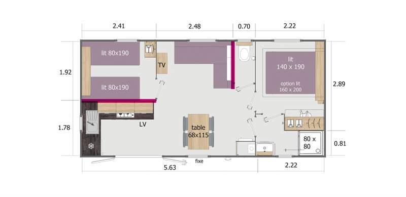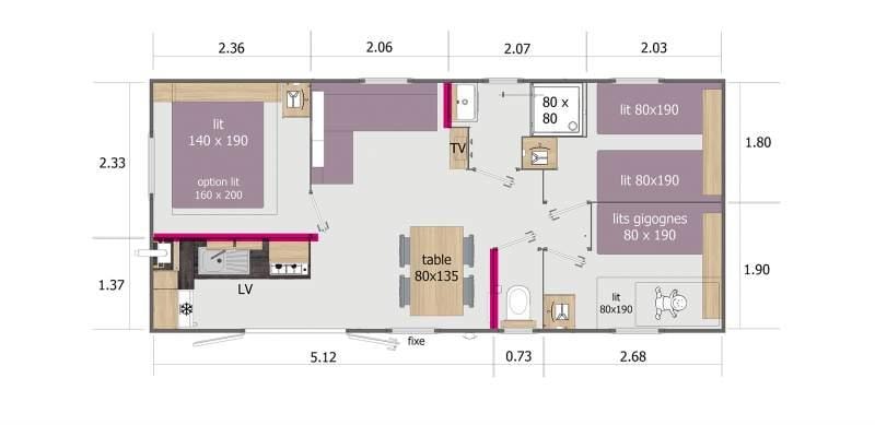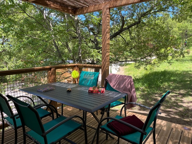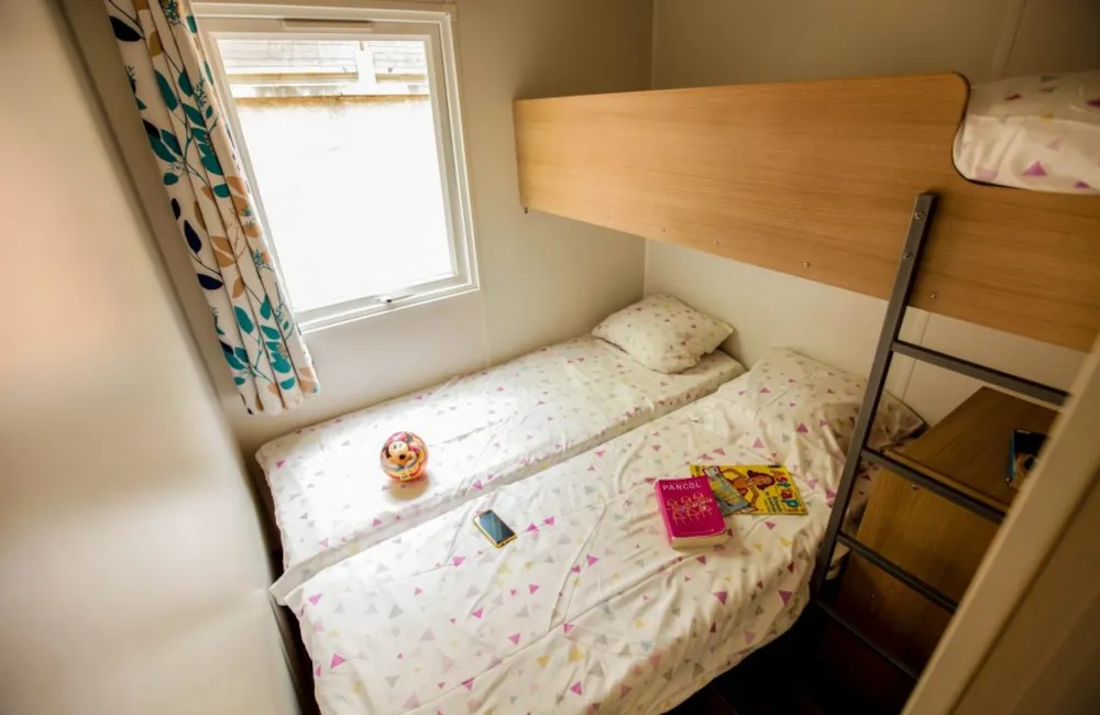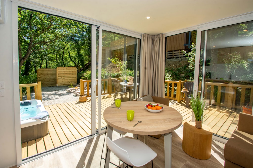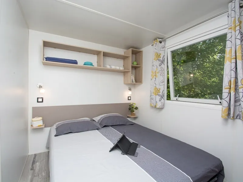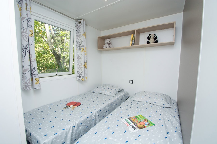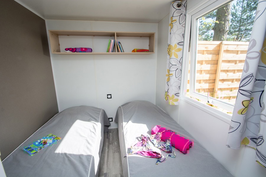Diese Cottages sind sehr gemütlich und mit einer halbüberdachten Doppelterrasse von 16m² ausgestattet, die Ihnen die Wahl lässt, sich auf den Liegestühlen zu sonnen oder im Schatten zu frühstücken. Die Küche hat eine Fensterfront, die sich über die gesamte Breite des Chalets erstreckt, was ein geräumiges und komfortables Innen- und Außenleben ermöglicht. Sie ist mit einem Geschirrspüler ausgestattet.