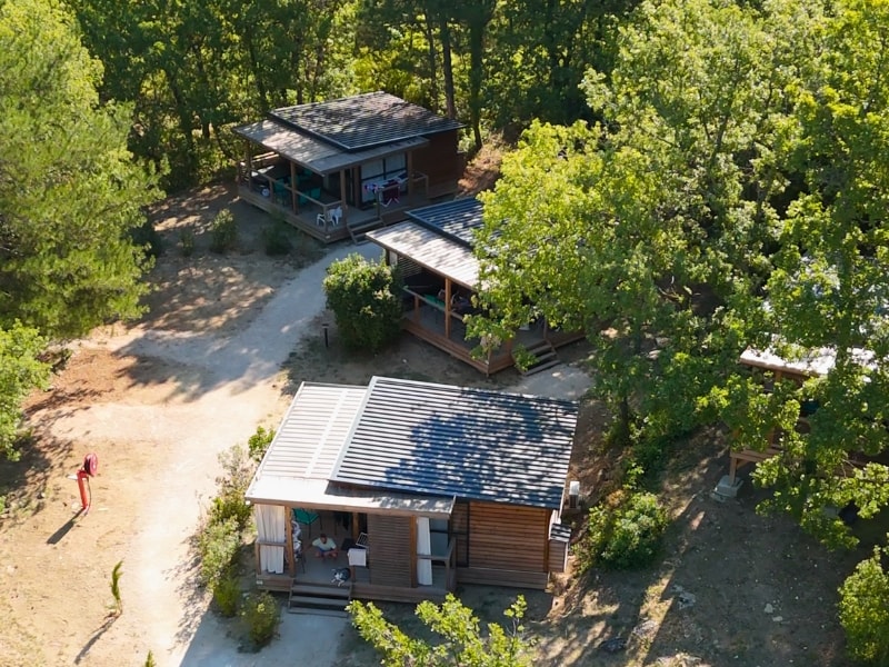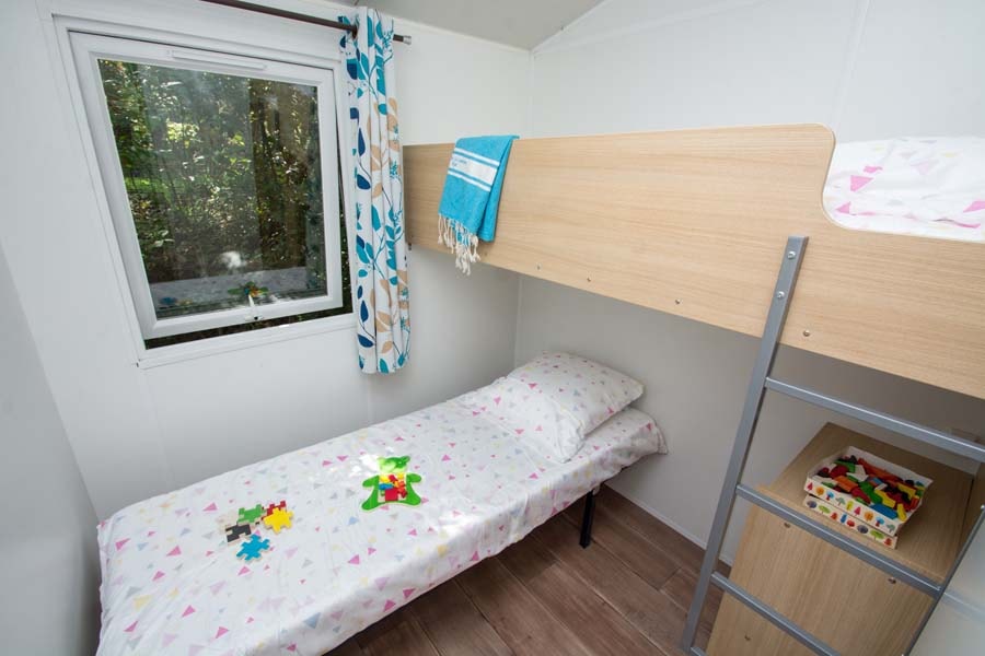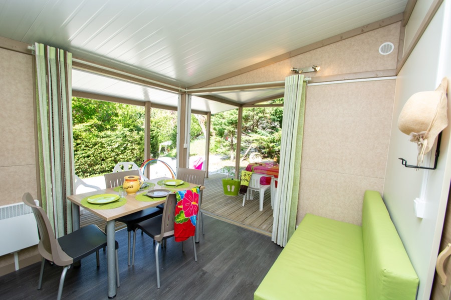 Sie befinden sich im Herzen des Campingplatzes, inmitten von Zelten und Wohnwagen. Diese originelle Unterkunft, teils Zelt teils fest, ist der perfekte Kompromiss zwischen dem Vergnügen eines Zeltes und dem Komfort eines Mobilheims. Die beiden Schlafzimmer mit Fenster befinden sich im festenTeil und sind abschließbar. Die ausgestattete Küche befindet sich im Zeltteil. Dank der großen Öffnungen nach außen können Sie die natürliche Umgebung des Campingplatzes genießen.