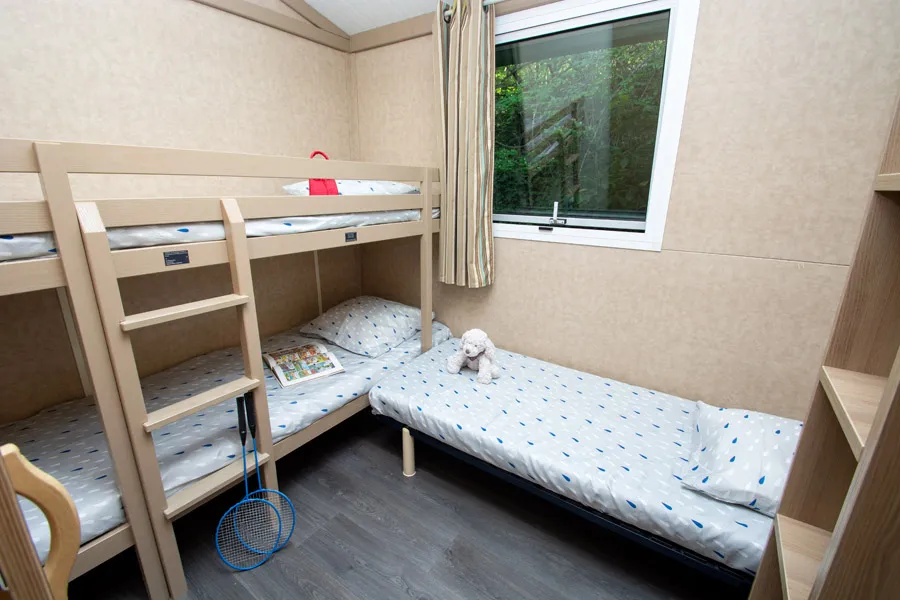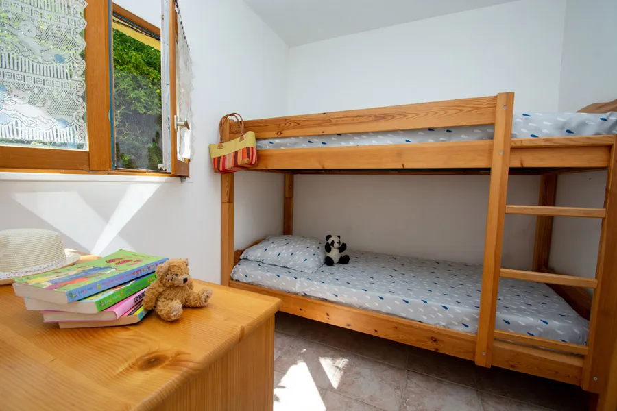 Das Elternschlafzimmer ist mit einem 160 cm breiten Bett ausgestattet, und das Kinderzimmer kann leicht von zwei auf drei Betten umgestellt werden (Auszieh- und Klappbett), was sehr praktisch ist. Bitte beachten Sie, dass das Etagenbett nicht für Kinder über 13 Jahre geeignet ist.