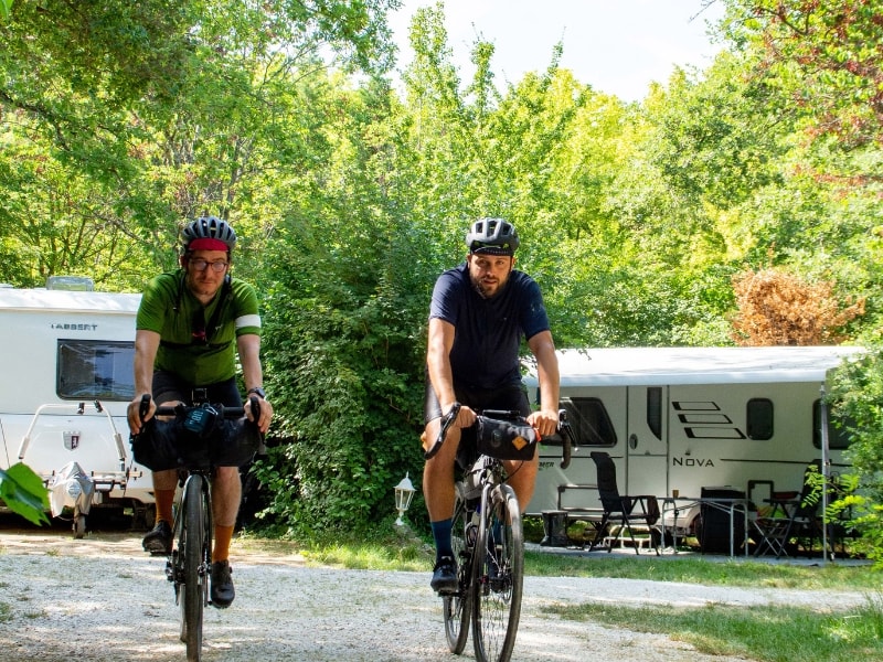 Kleiner Stellplatz, ideal für Radfahrer oder Wanderer ohne Auto. Elektrizität inbegriffen. Komfortable und saubere Sanitäranlagen, Warmwasser inklusive.