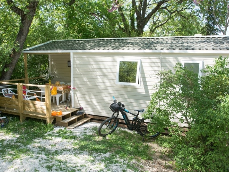 Mobilheim mit 2 Schlafzimmern und überdachter Terrasse.