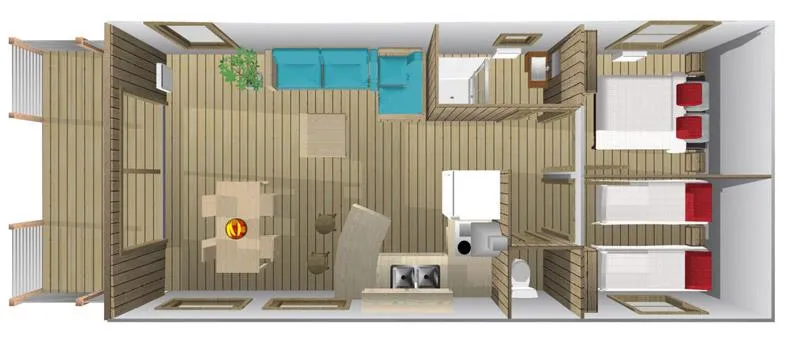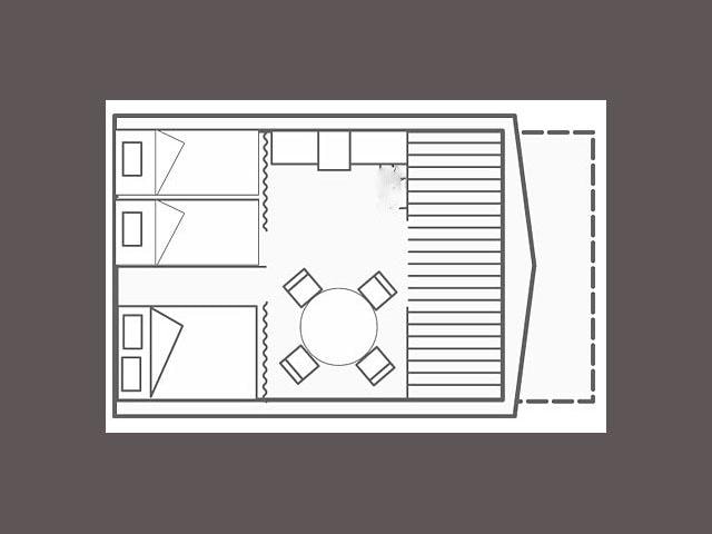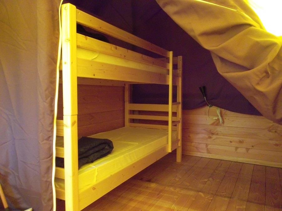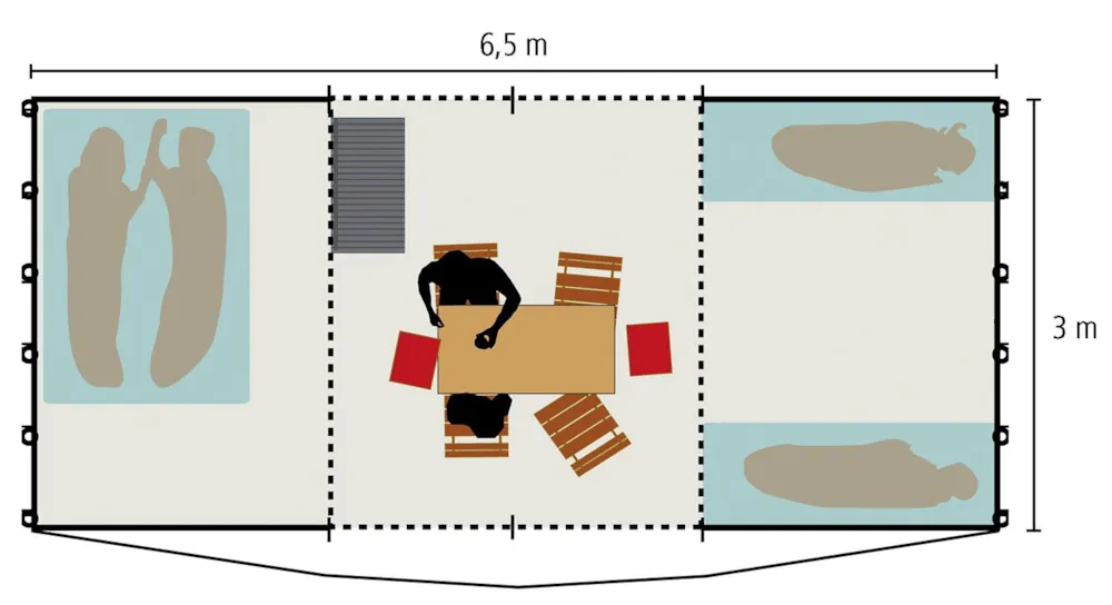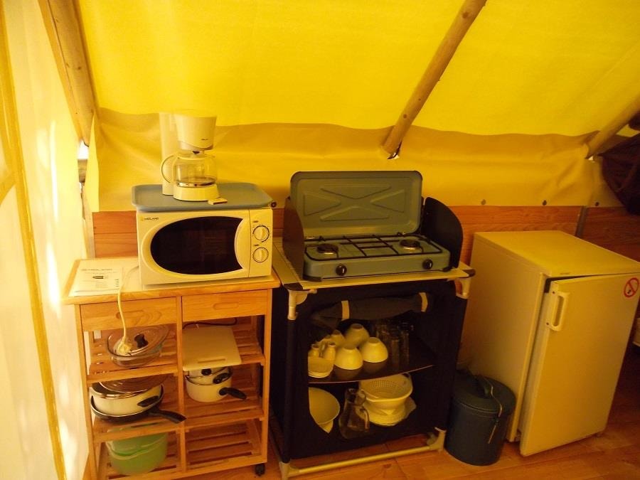 Une partie séjour : véritable salle à manger spacieuse de 7,50m2, dans laquelle on peut se tenir debout. Elle est équipée d’une table et de 4 chaises pliantes et 2 fauteuils détente. Le coin cuisine dispose d’un meuble de rangement et d’un réchaud à gaz, et d’un kit vaisselle complet. Une partie couchage composée de 2 chambres : 2 chambres de 2m X 3m chacune, équipées pour l’une d’un matelas gonflable 2 places (140cm) et pour l’autre d’un matelas gonflable 2 places (140 cm) + un matelas gonflable 1 place (70 cm).