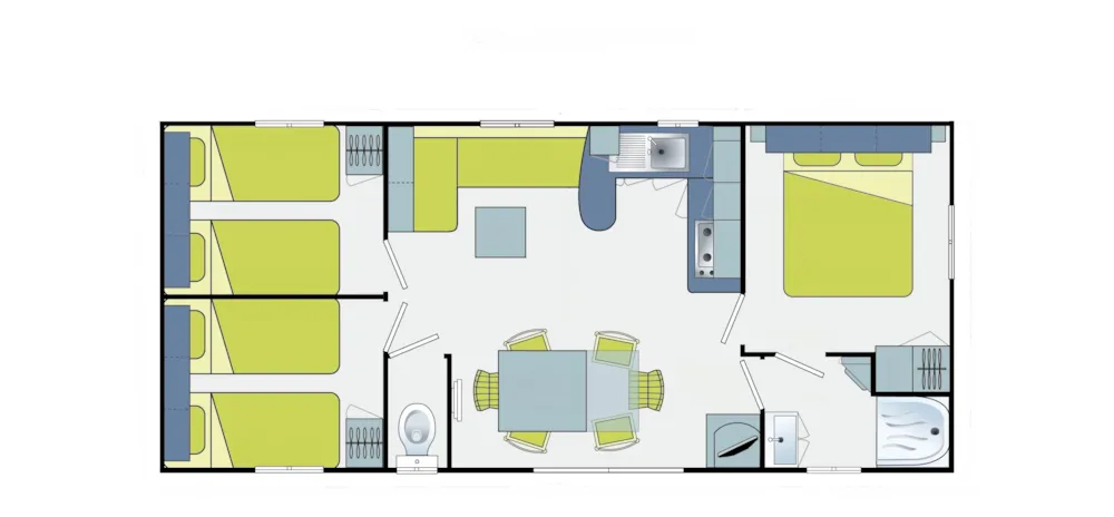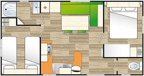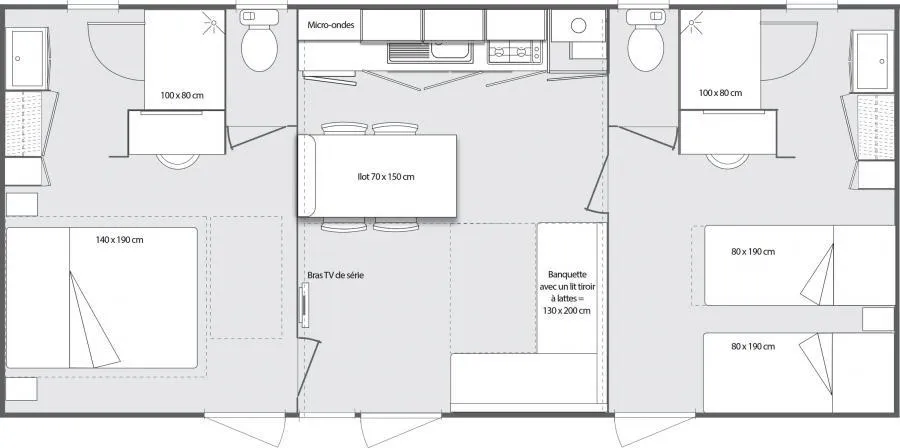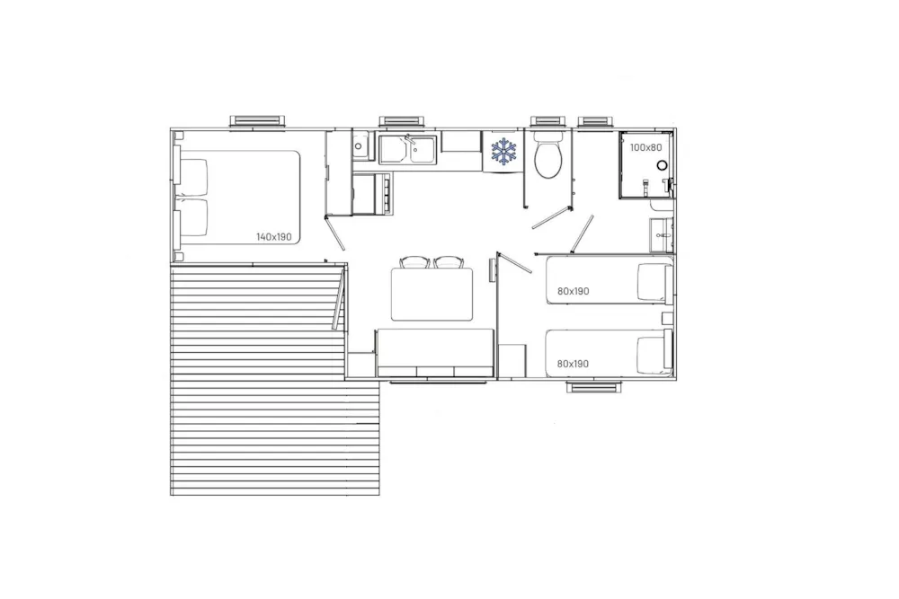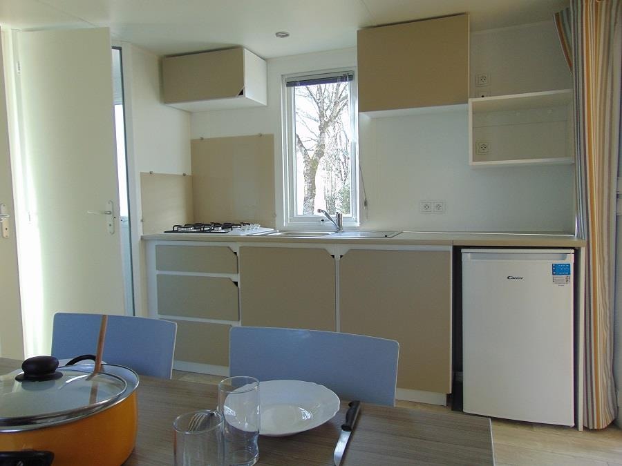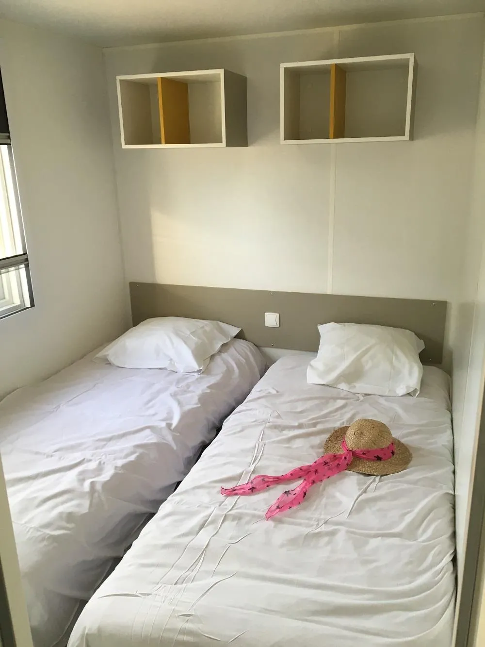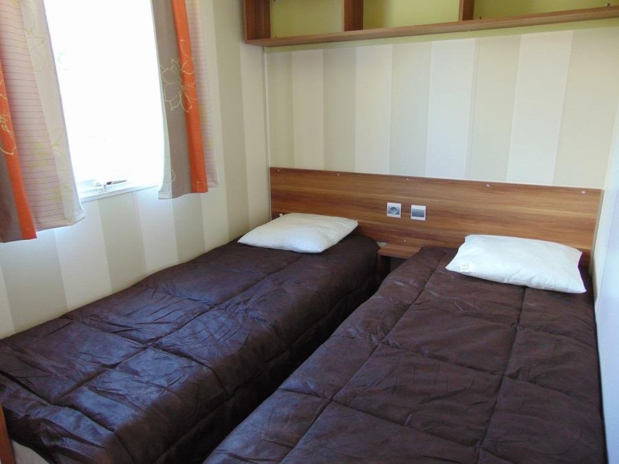 1 bedroom with 1 double bed (140 x 190cm), 1 bedroom with 2 single beds (80 x 190cm), 1 kitchen area with fridge, microwave, crockery kit