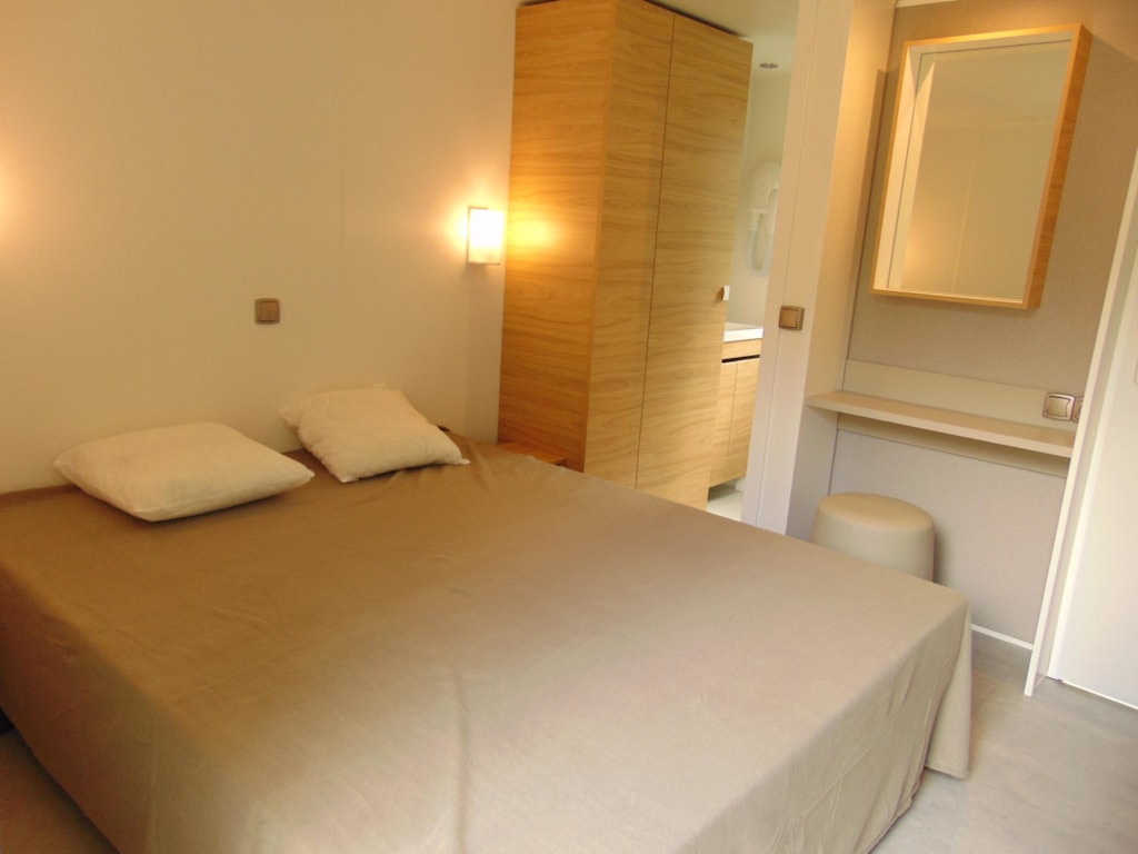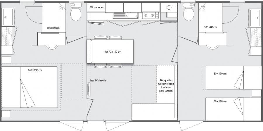 1 bedroom with 1 double bed (140 x 190 cm), 1 bedroom with 2 single beds (80 x 190 cm), 1 convertible bed for 1 person in the living room, equipped kitchen, crockery kit, microwave, bathroom , Separate toilet, garden furniture, semi-covered wooden terrace.