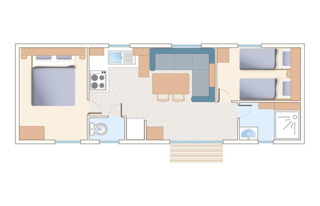 1 bedroom with 1 double bed (140 x 190 cm),1 cooking-room with gas cooker, sink,plates and dishes, 1 dining room ,1 bathroom with shower, washbasin and toilets , set of garden table and chairs for taking meals outside.