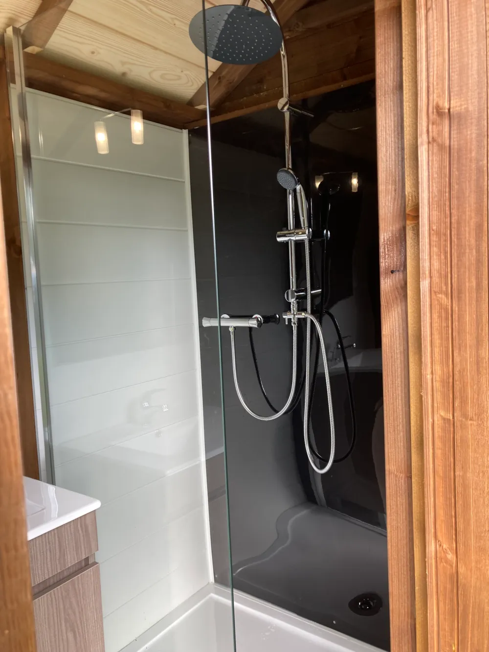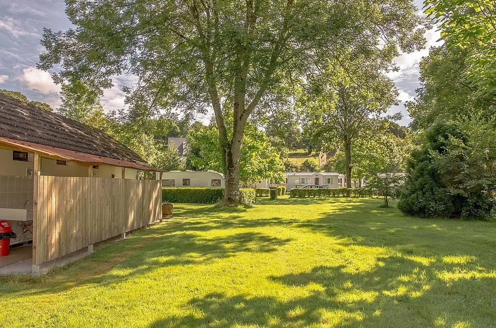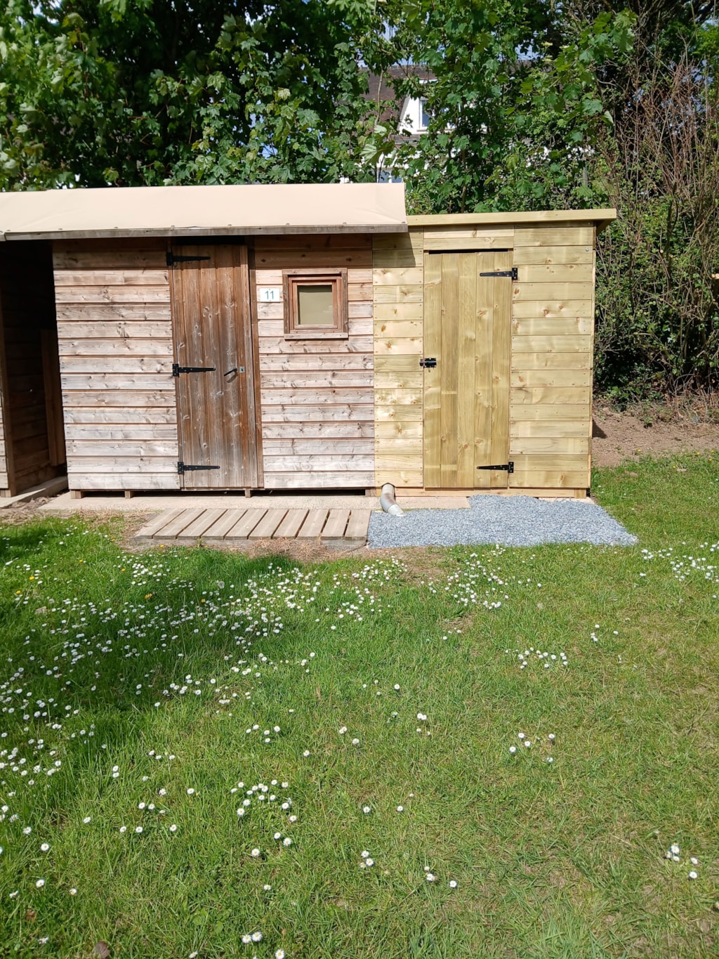 Stellplatz für Zelt, Wohnmobil, Wohnwagen von ca. 80 m2 mit einem individuellen Holzchalet mit Dusche, Waschbecken, Toilette und Außenwaschbecken für Geschirr