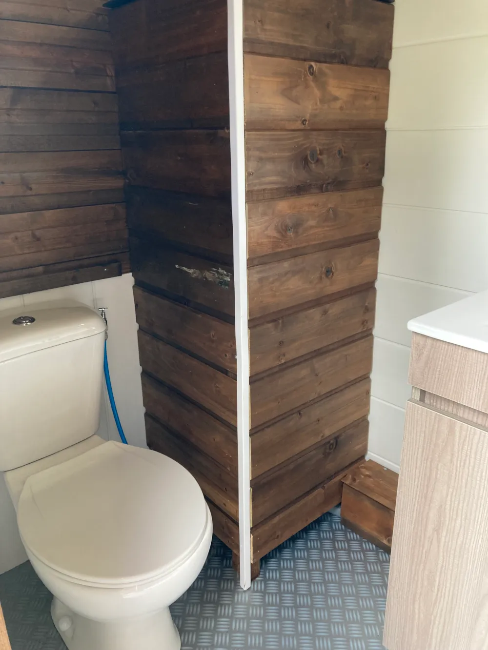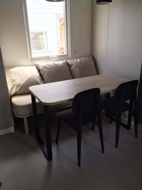 4m2 große Holzhütte. 2 Matratzen 70 x 190 cm. Bettdecken und Kissen vorhanden. Außenbänke und Tisch Kofferraum + Innenlager + Garderobenständer Dachoberlicht (Öffnung) mit verdunkelbarem Holzladen