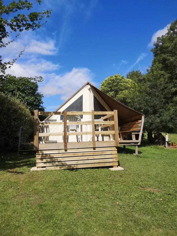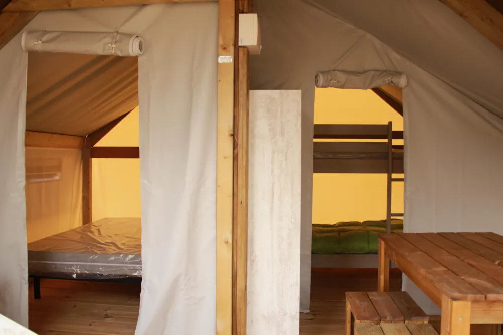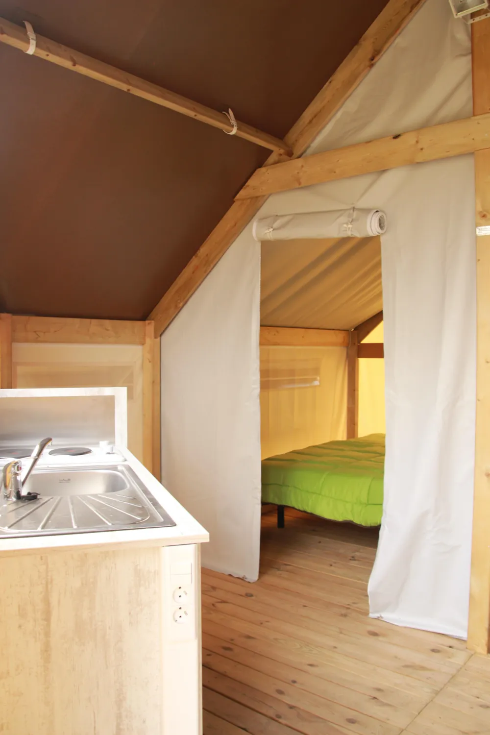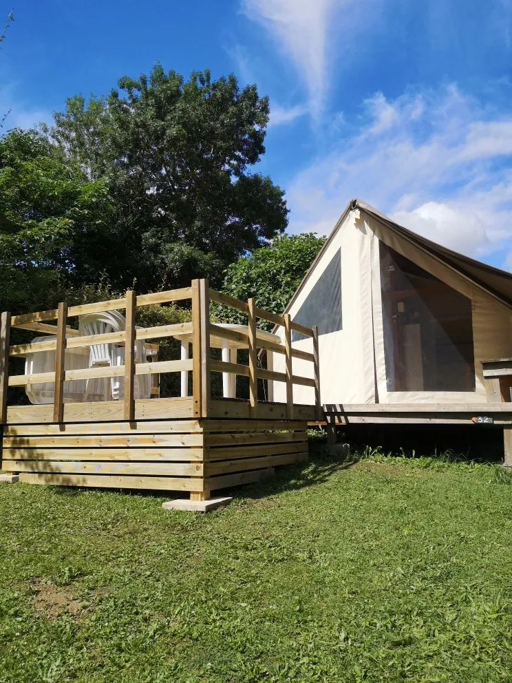 DECOUVREZ LES JOIES DU CAMPING DANS UN HEBERGEMENT TOILE SUR PLANCHER BOIS EVIER AVEC EAU FROIDE SANS SANITAIRE