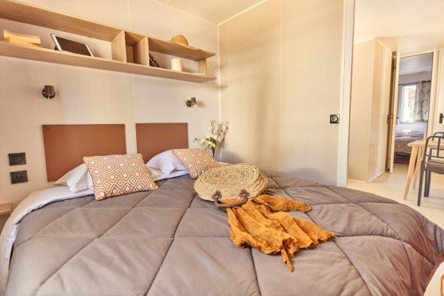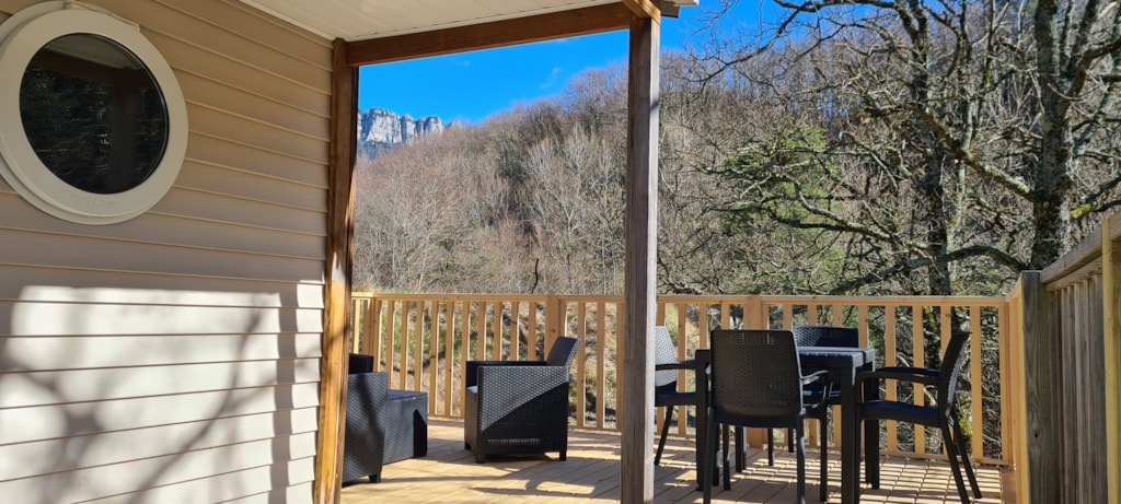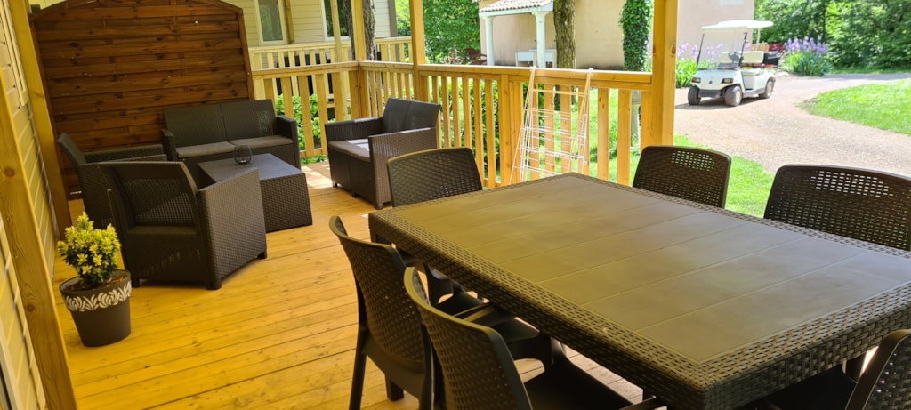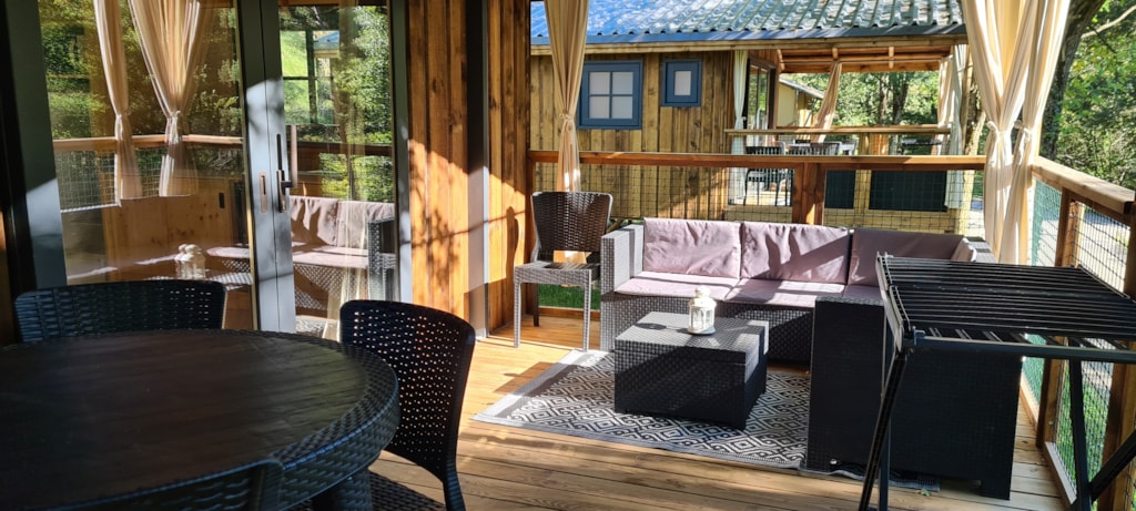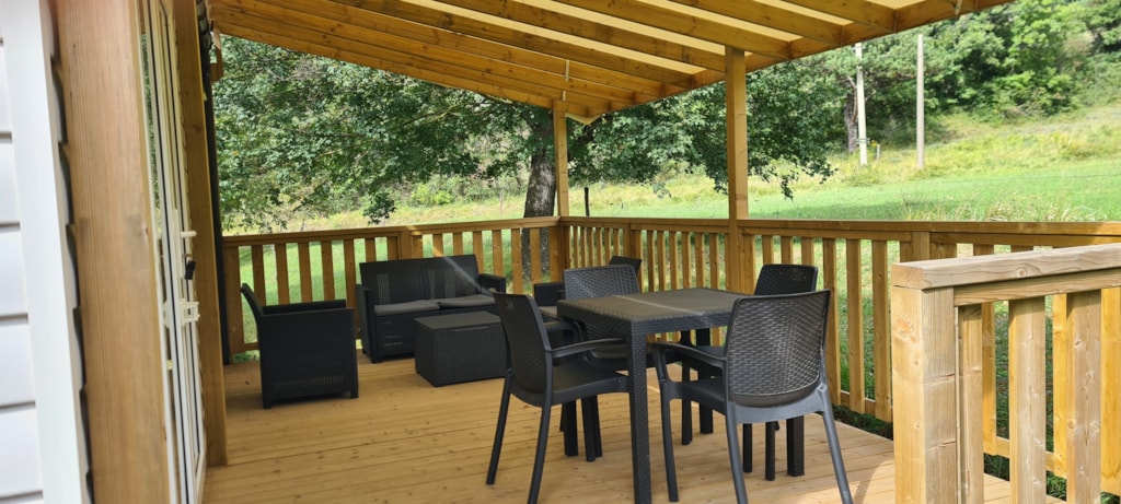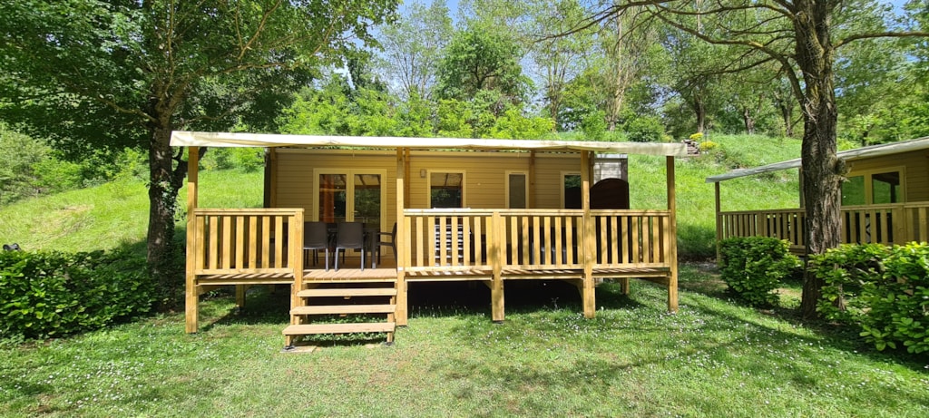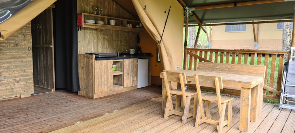 Sous son revêtement mi-toile, mi-bois, découvrez un intérieur confortable et entièrement équipé : cuisine, salon, salle de bain, chambres séparées avec lits superposés et doubles… Tout y est, l’aventure peut commencer ! Le point de ralliement de toute la famille ? La terrasse en bois avec table à manger pour se retrouver aux heures les plus douces de la journée.