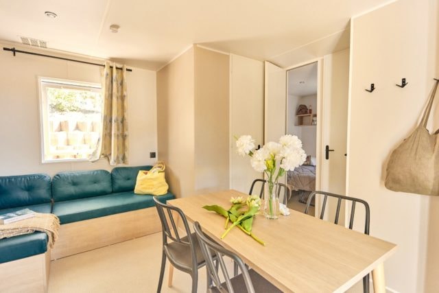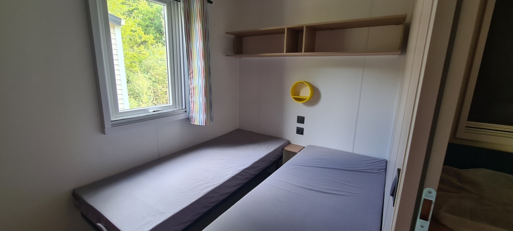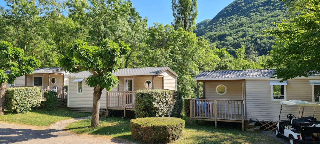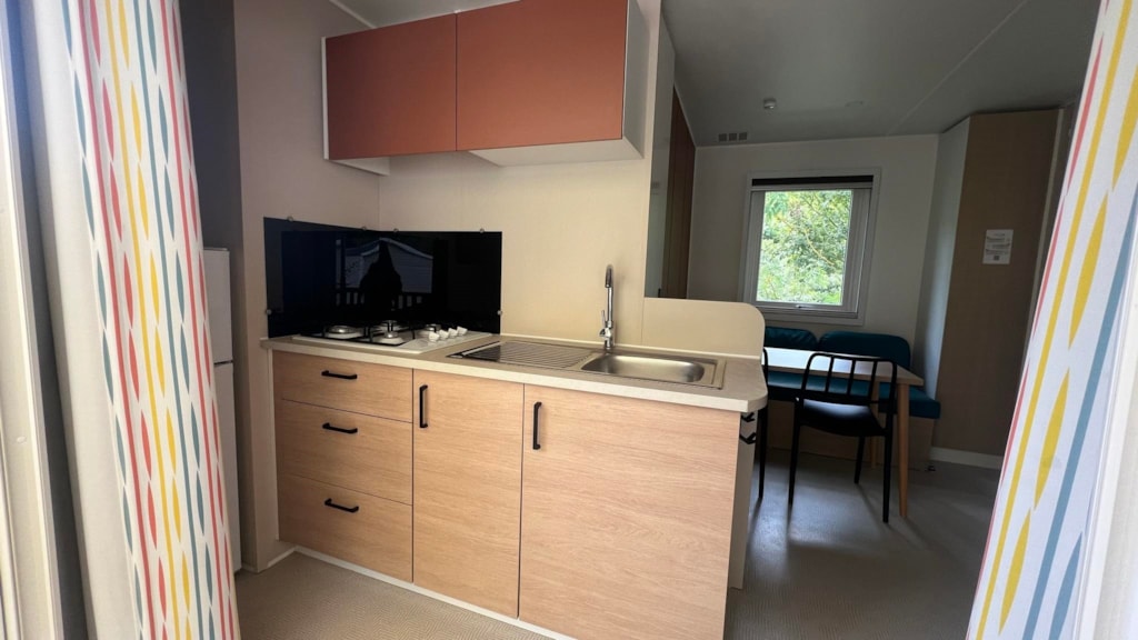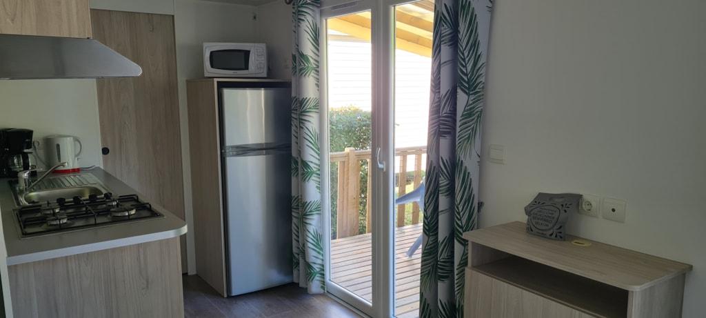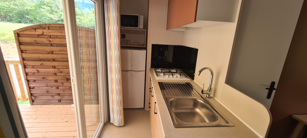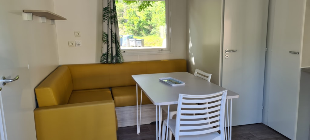 Sous son revêtement mi-toile, mi-bois, découvrez un intérieur confortable et entièrement équipé : cuisine, salon, salle de bain, chambres séparées avec lits superposés et doubles… Tout y est, l’aventure peut commencer ! Le point de ralliement de toute la famille ? La terrasse en bois avec table à manger pour se retrouver aux heures les plus douces de la journée.